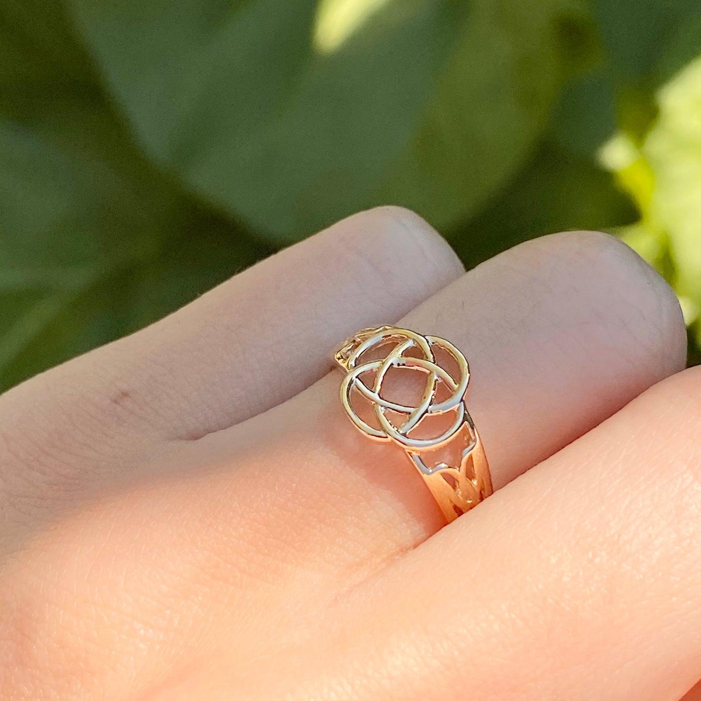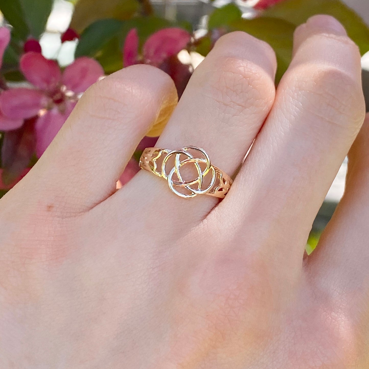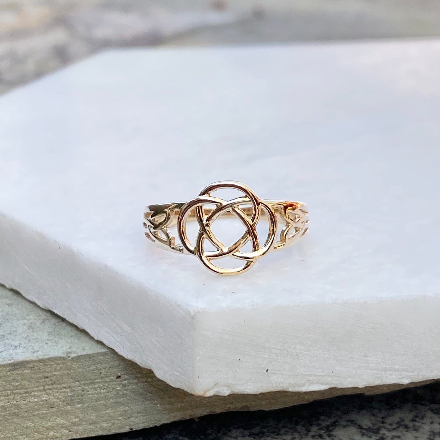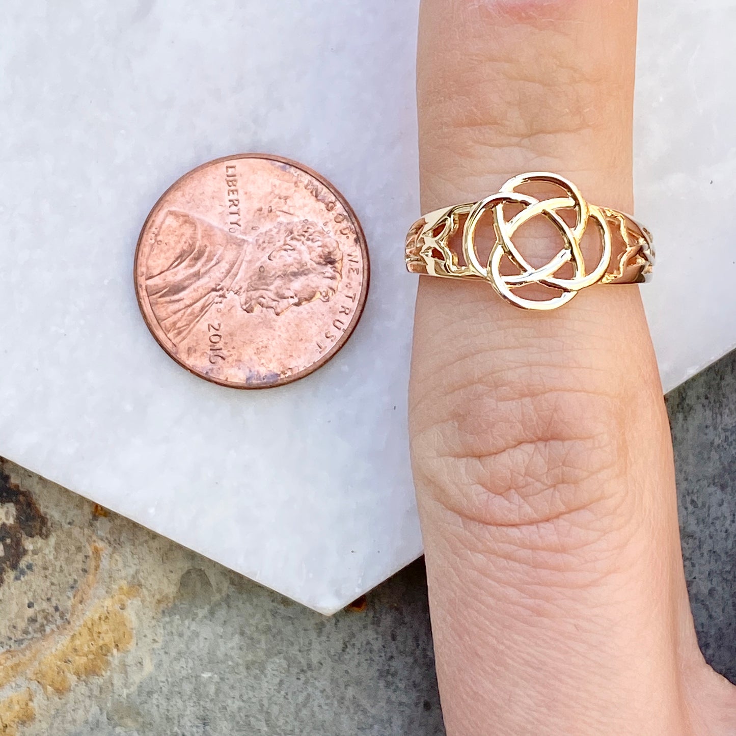 14KT yellow gold Celtic knot with open weave design ring. Features a great, interlocking design on sides of ring + a large Celtic knot in the center.