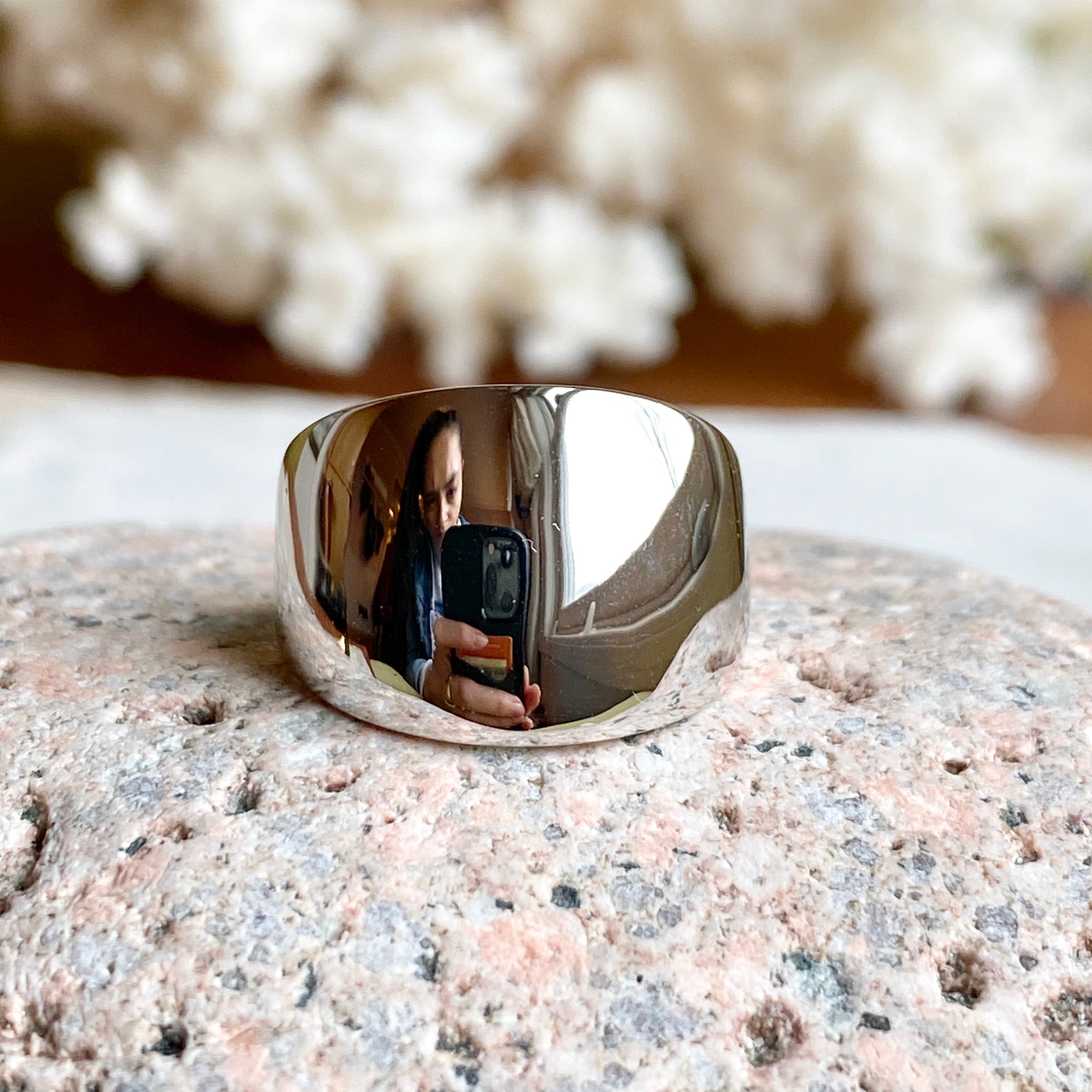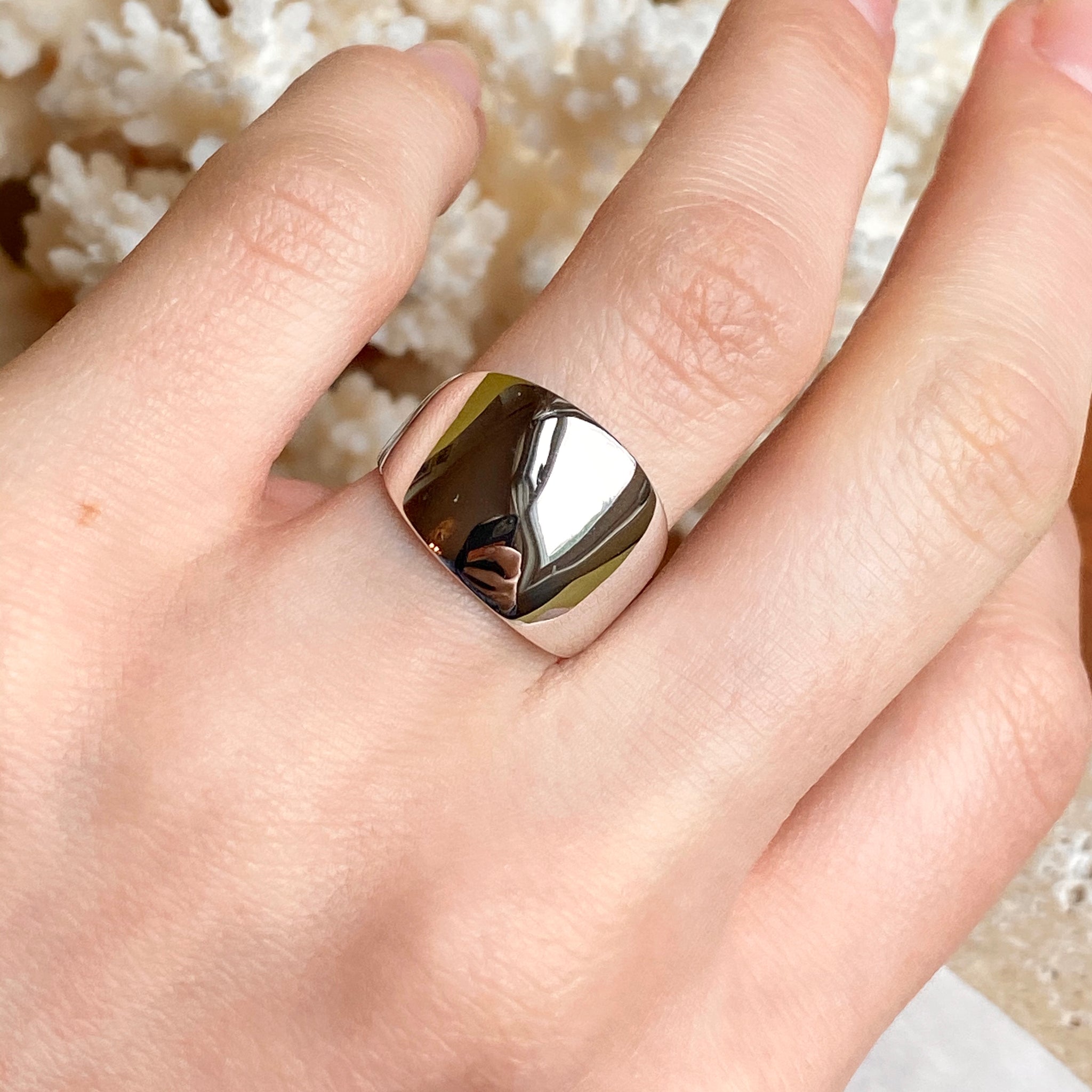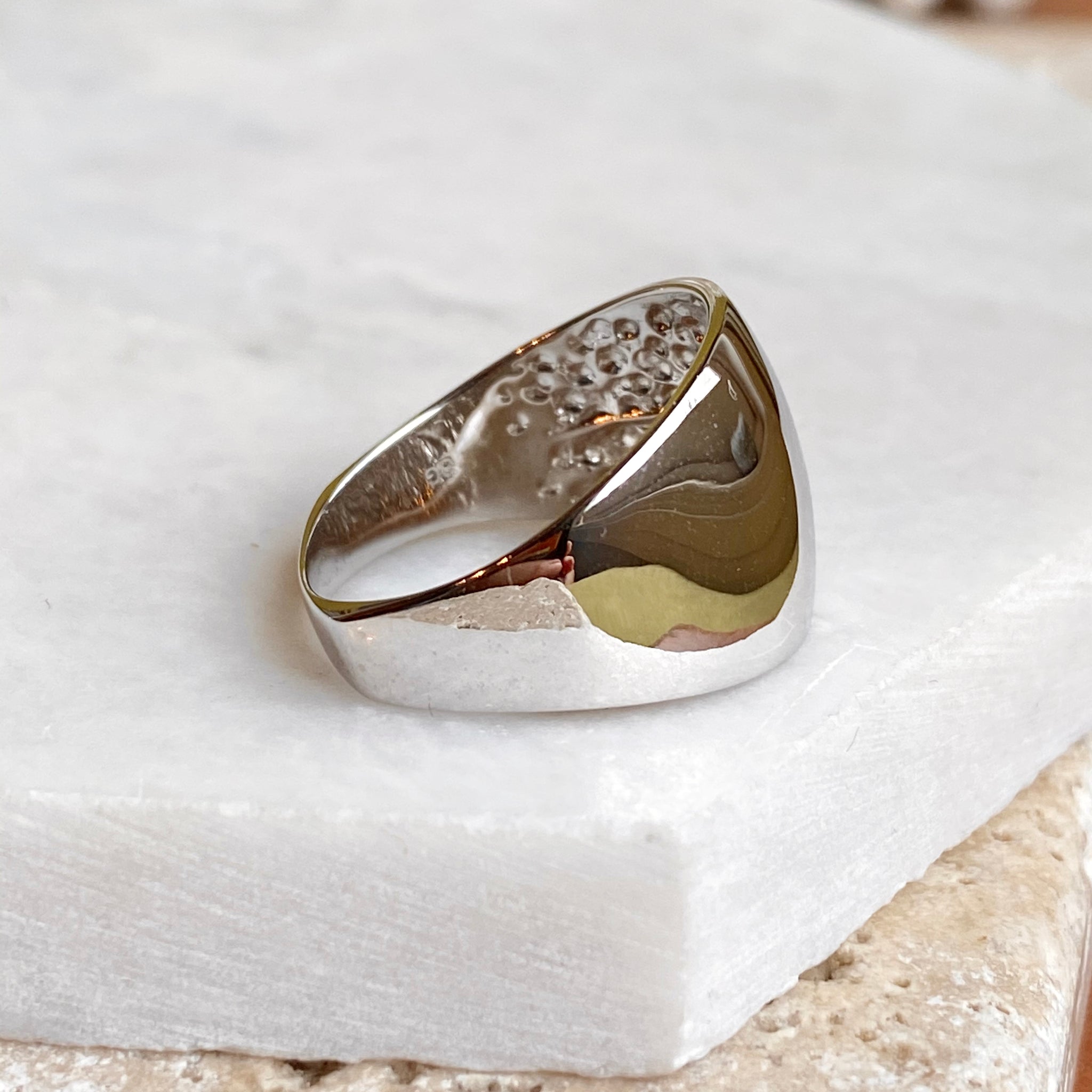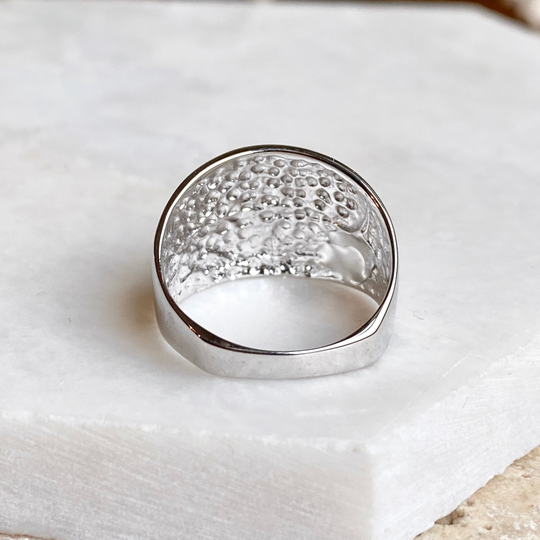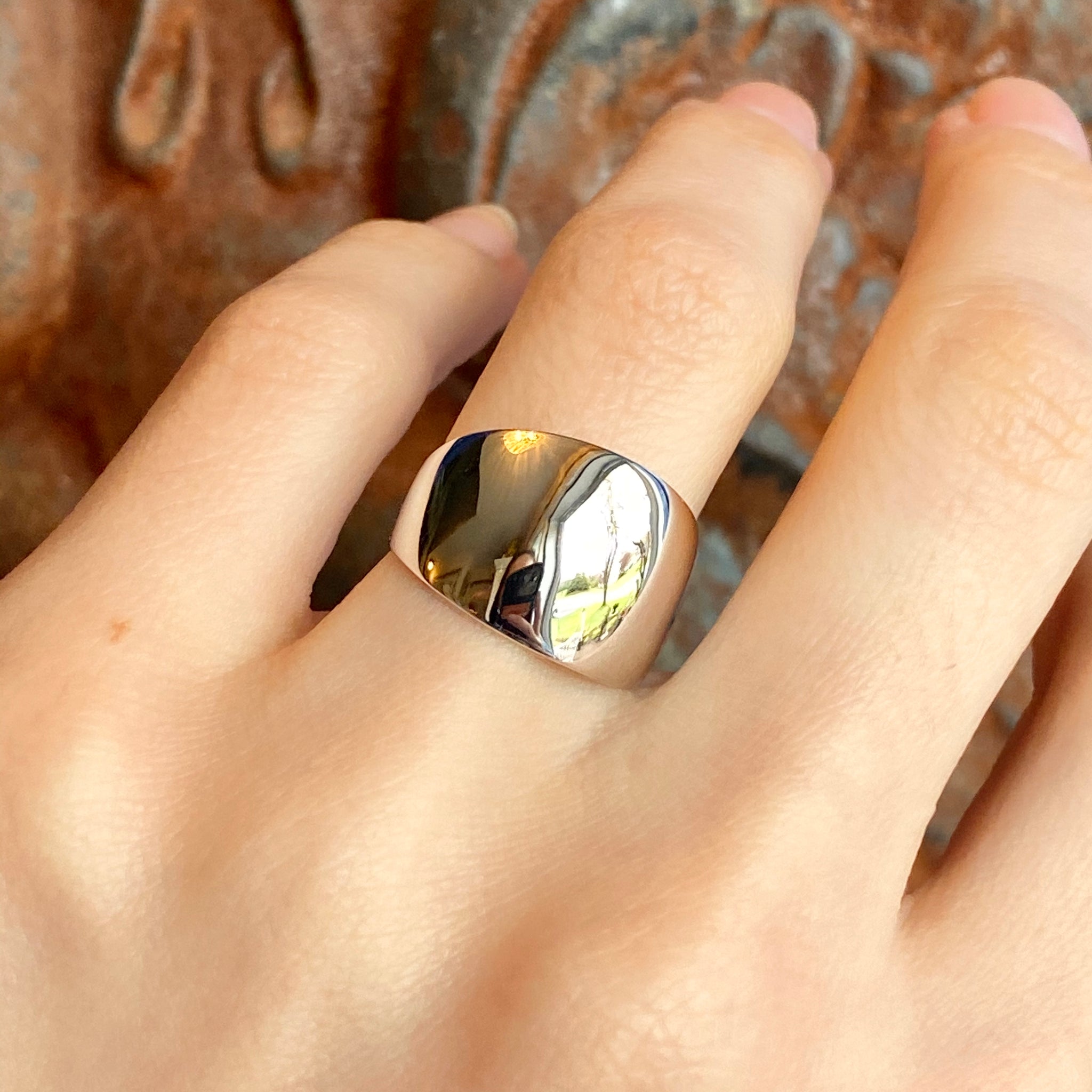 High polished 14K white gold domed cigar band ring with European shank. The European shank (squared back) helps off-set the weight of the ring to combat any slipping around. Stunning, earthy ring that is so much prettier in person! Also available in 14K yellow gold.