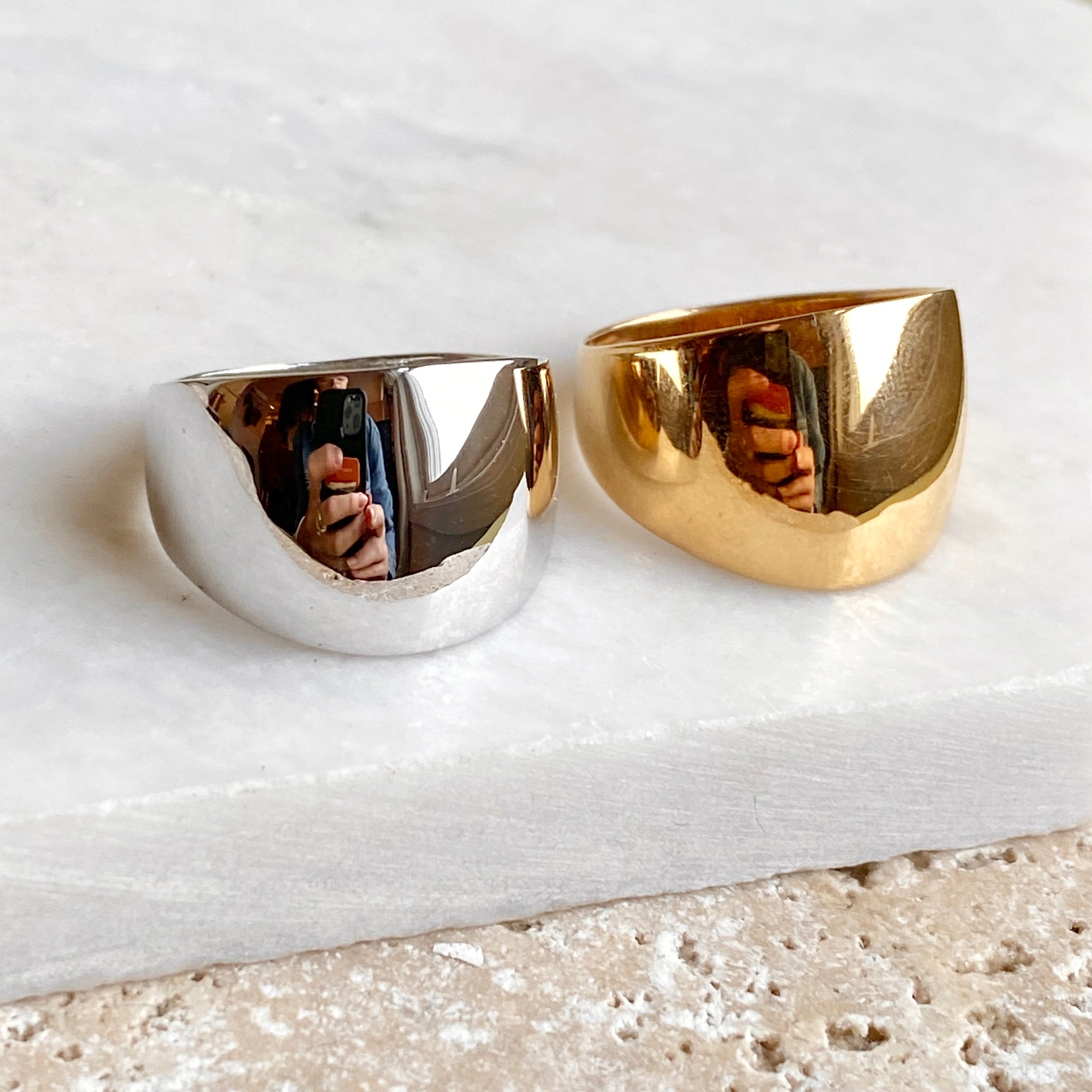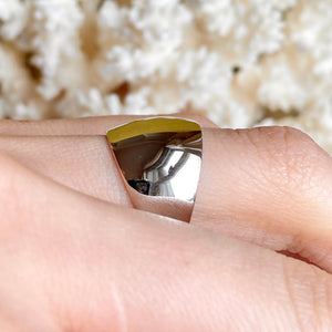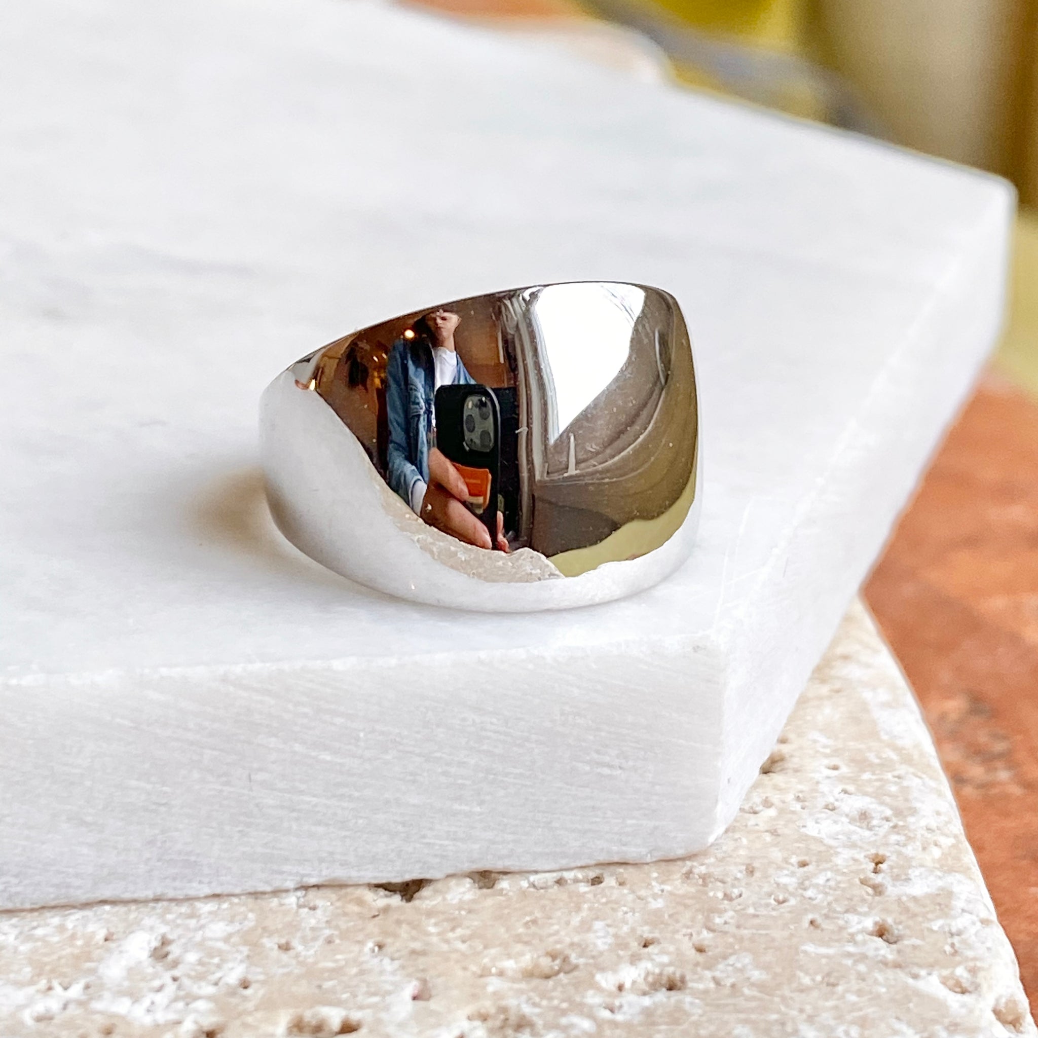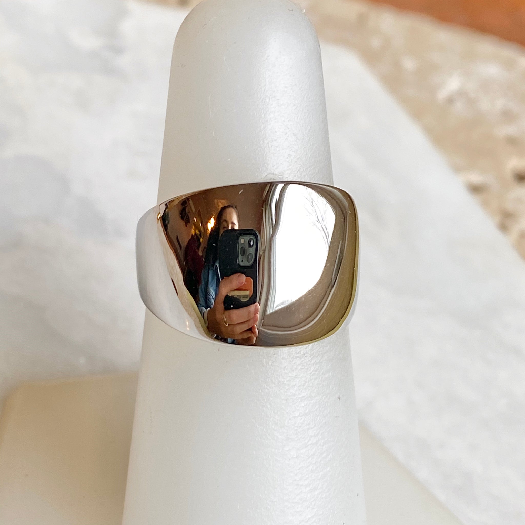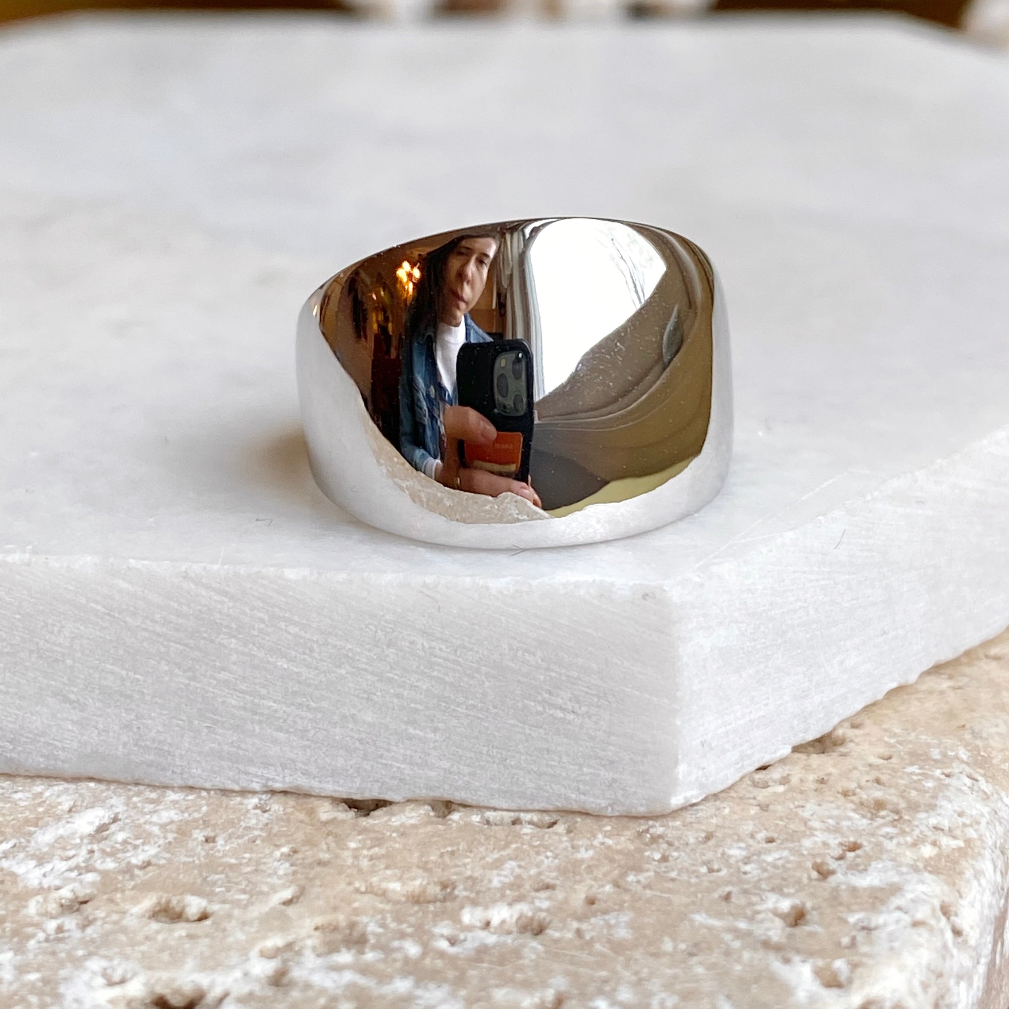 High polished 14K white gold domed cigar band ring with European shank. The European shank (squared back) helps off-set the weight of the ring to combat any slipping around. Stunning, earthy ring that is so much prettier in person! Also available in 14K yellow gold.