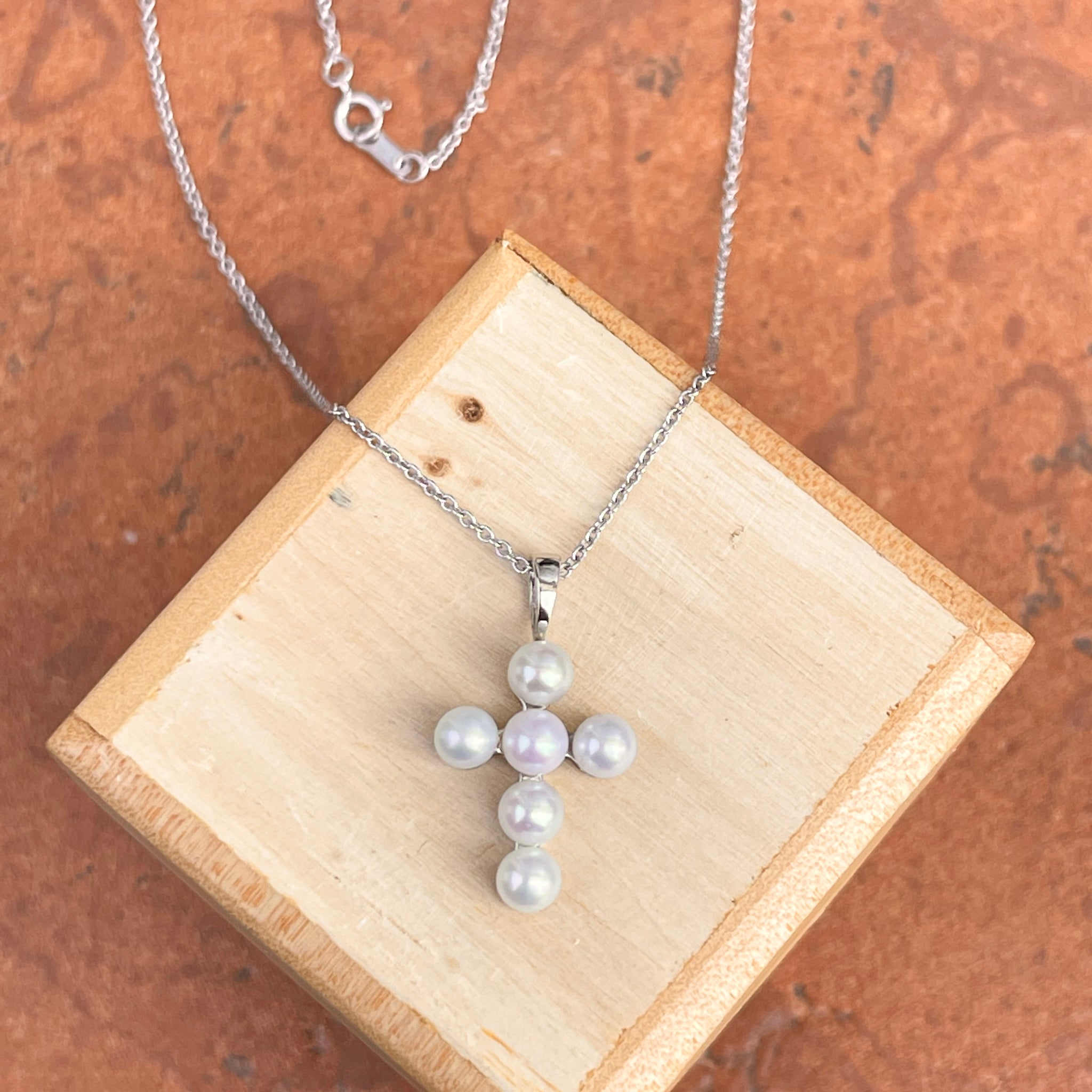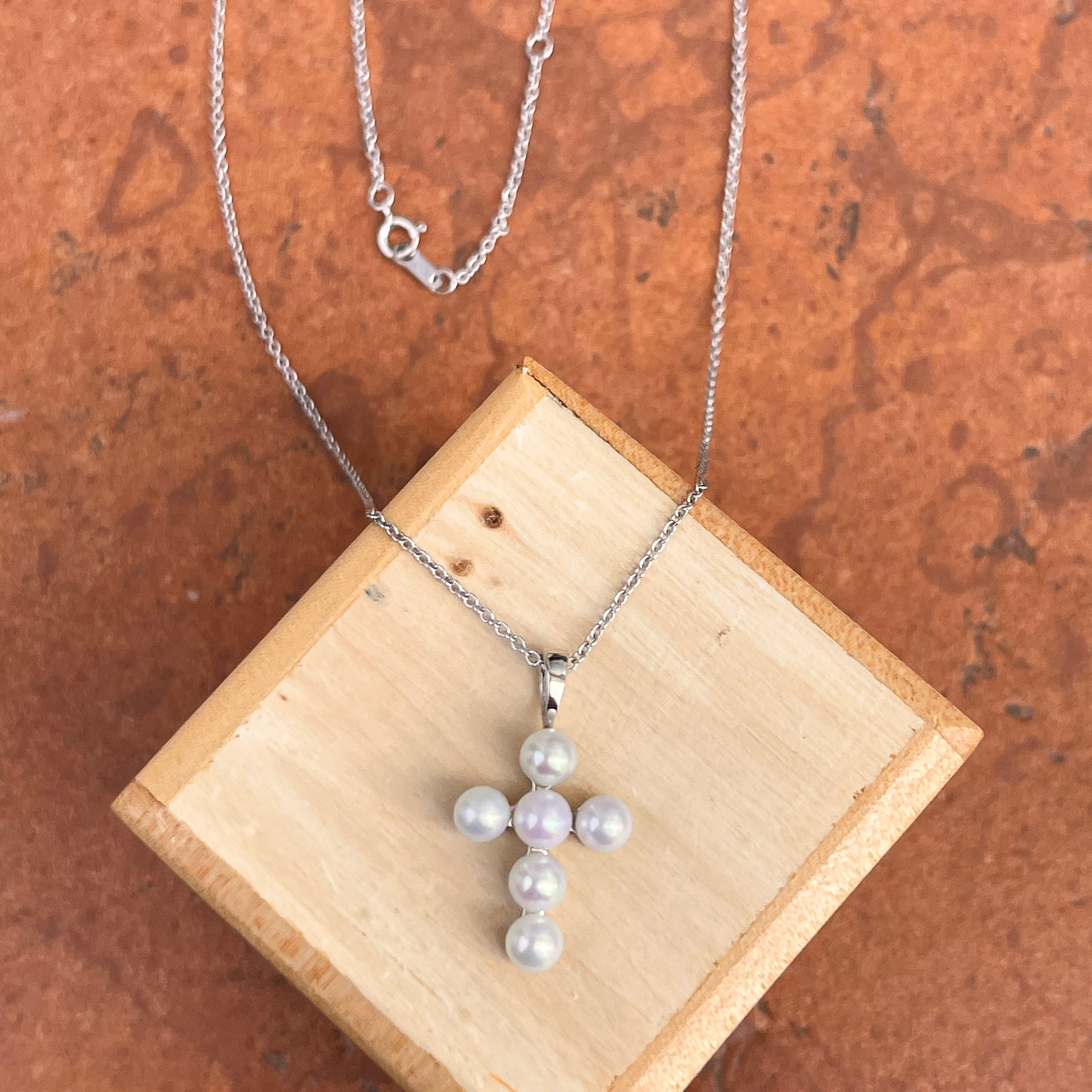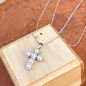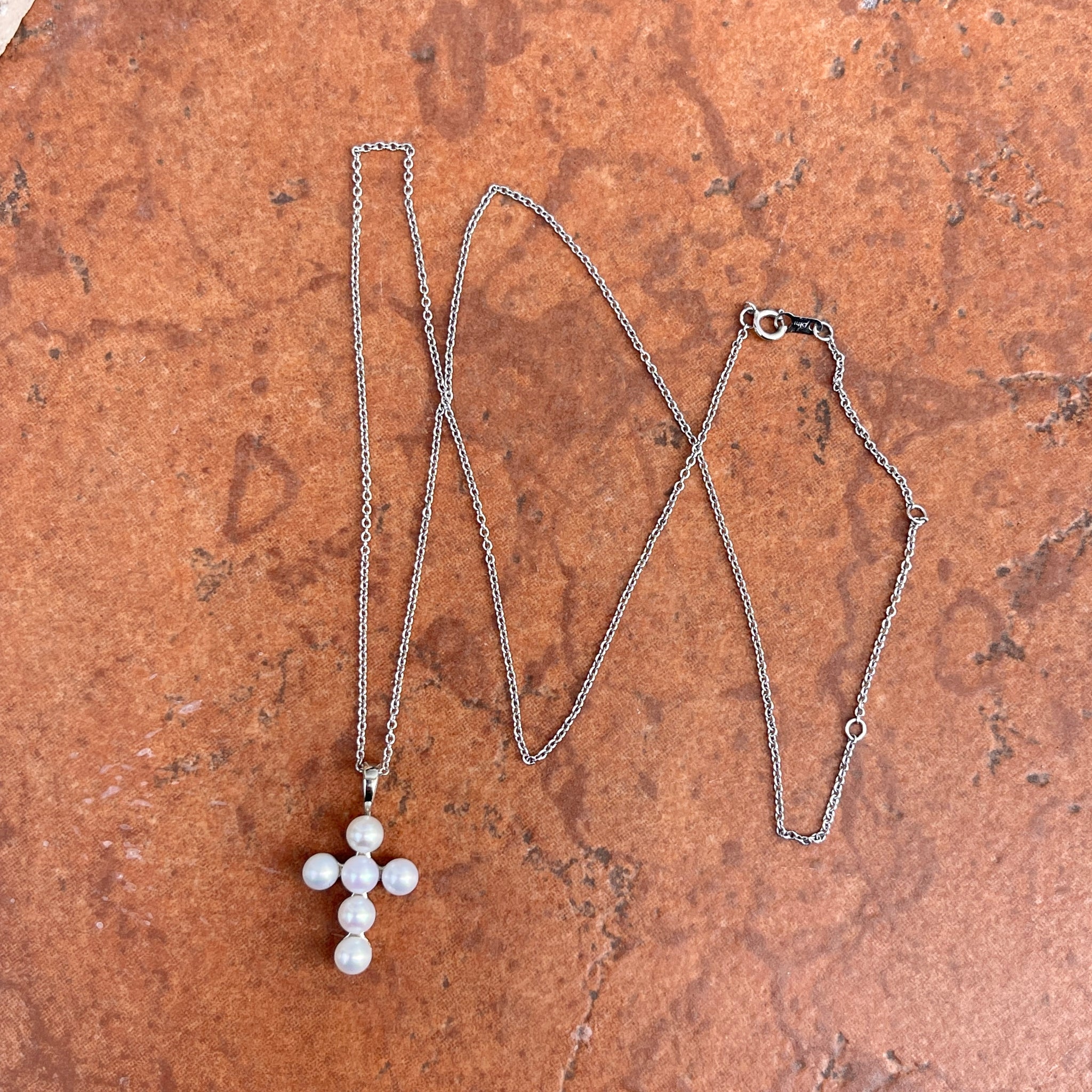 14KT White Gold Freshwater White Pearl Cross Necklace