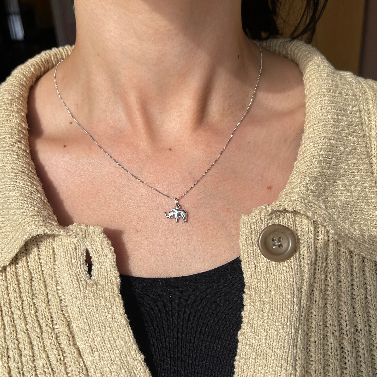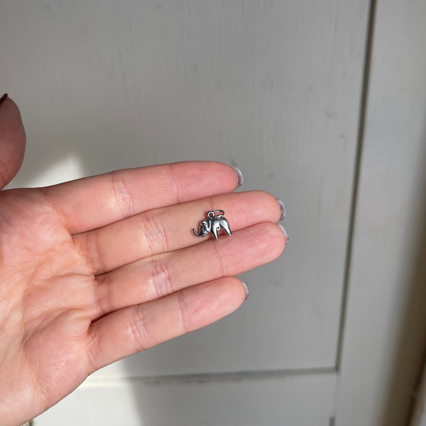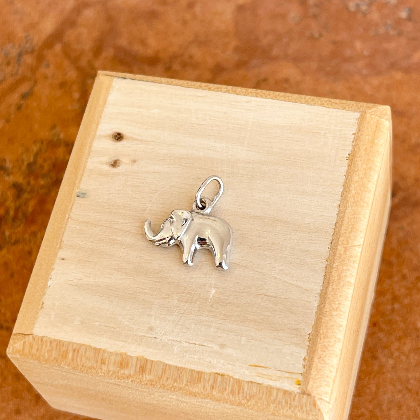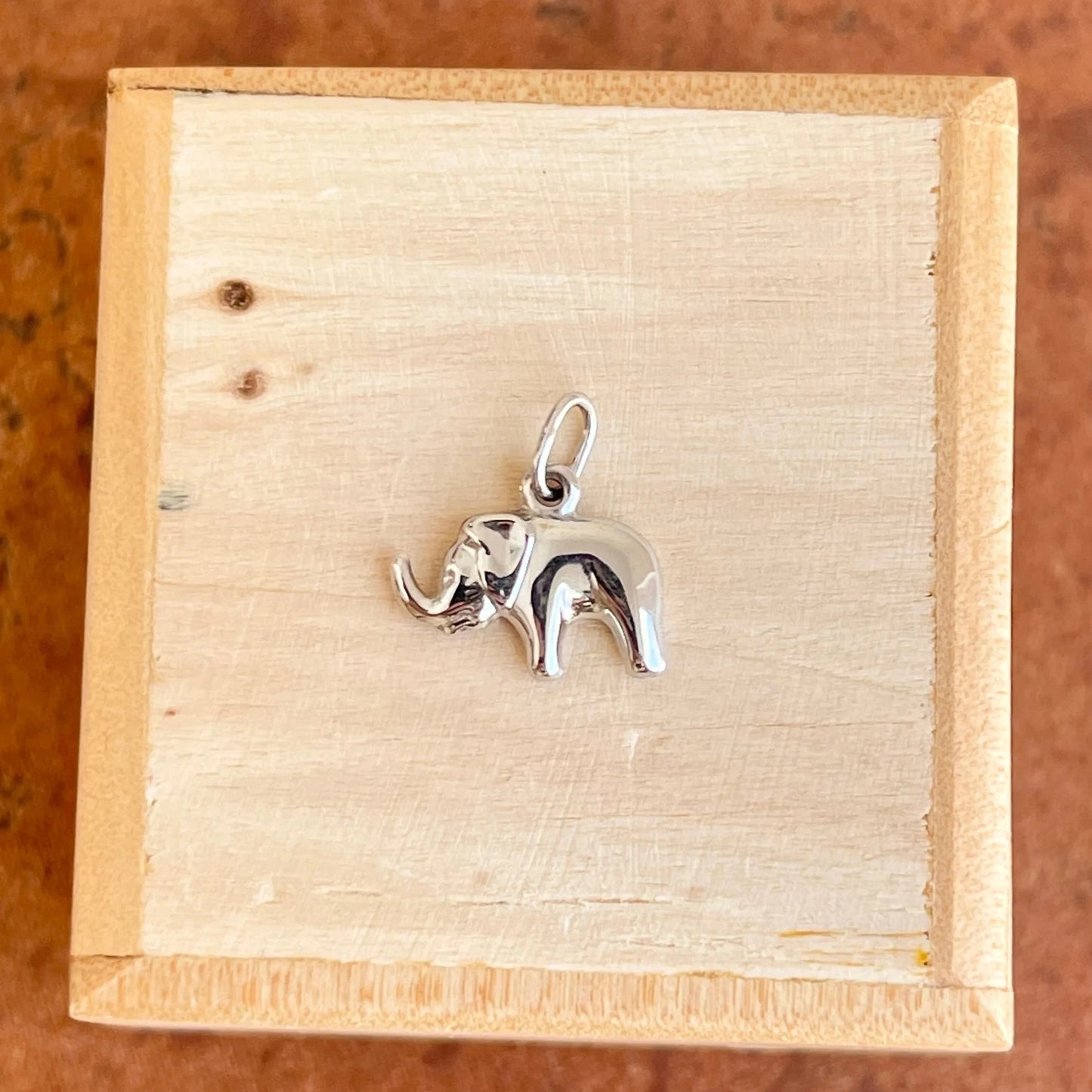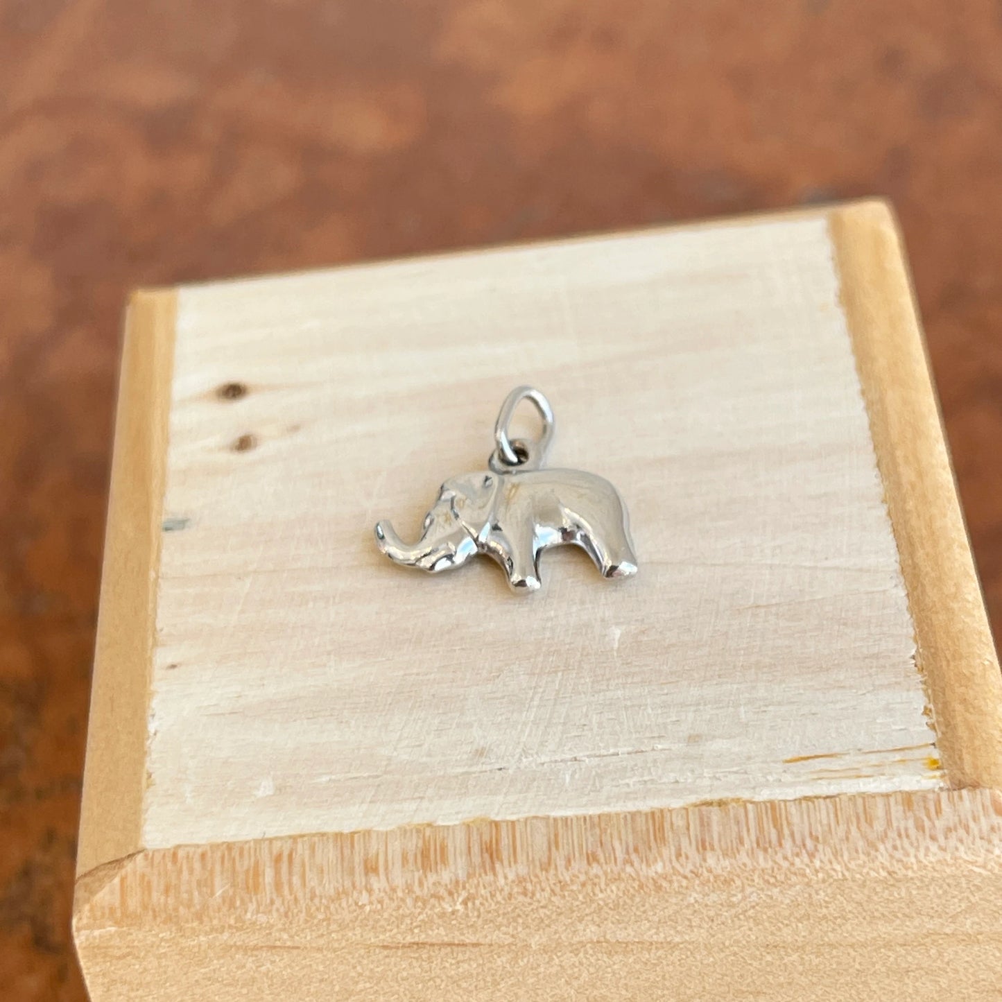 14KT White Gold Hollow, Mini Elephant Good Luck Pendant Charm. An elephant with its trunk up is a symbol of protection and wisdom. Wearing an elephant with its trunk up is said to bring good luck!