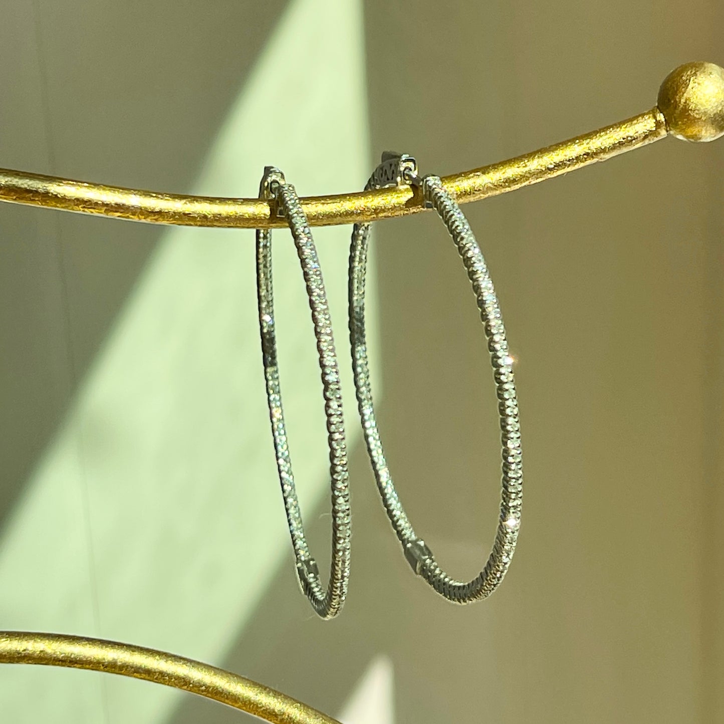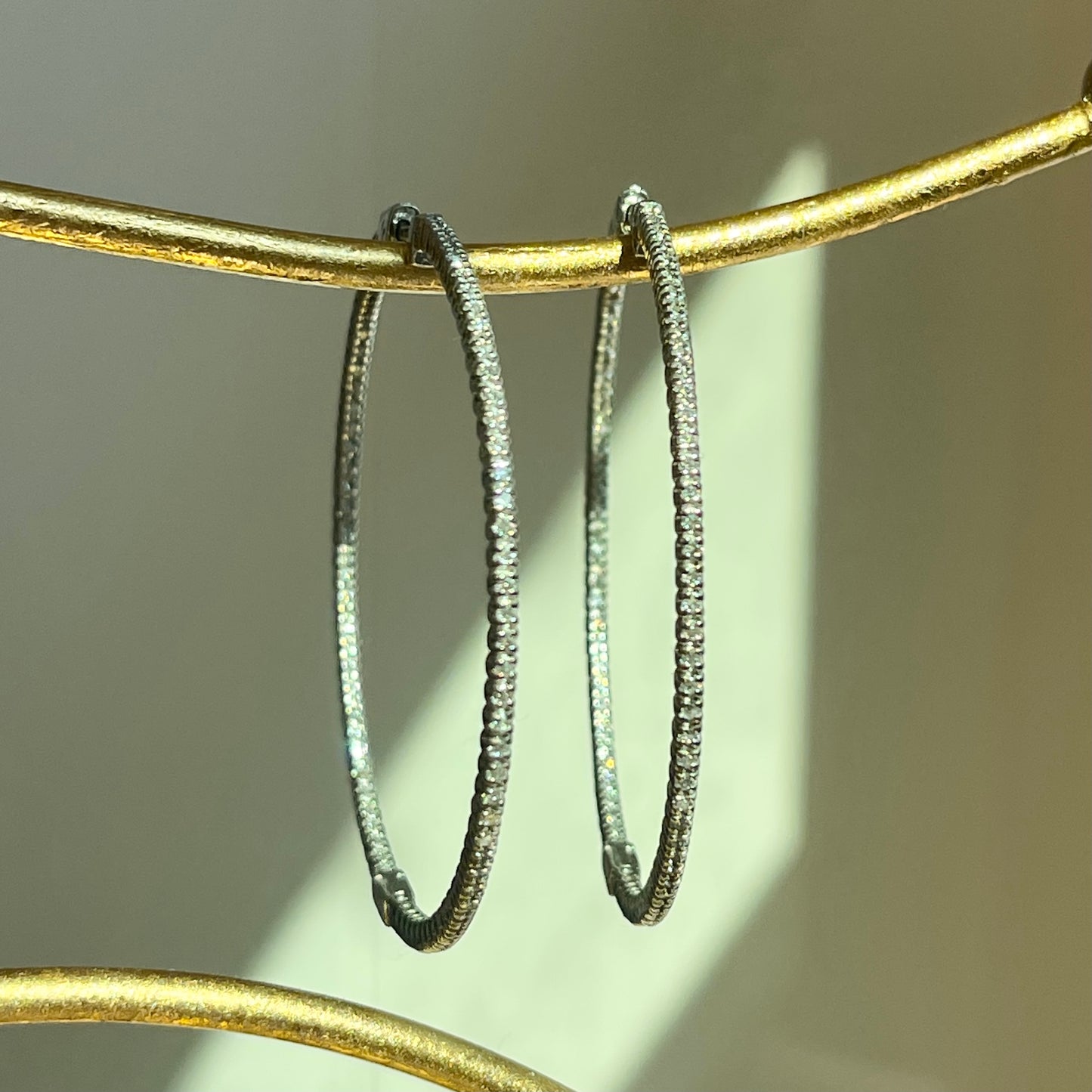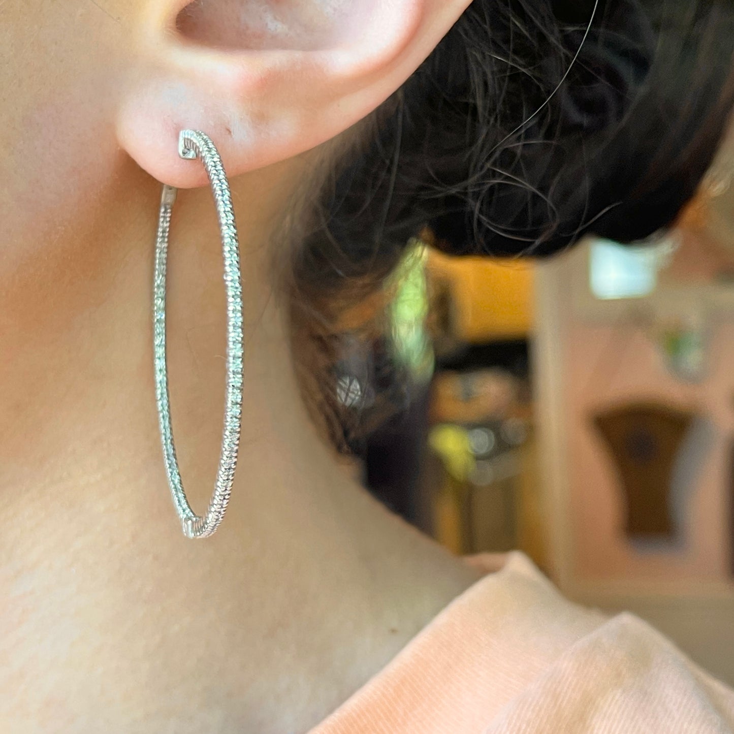 14KT white gold inside/ outside prong-set diamond hoops. Nice, larger size hoop with sparkling white diamonds from the outside and inside of the hoops! Diamonds go half-way around the front of the hoop, and half-way inside the back of the hoop. Pictures hardly do these sparkling beauties justice!