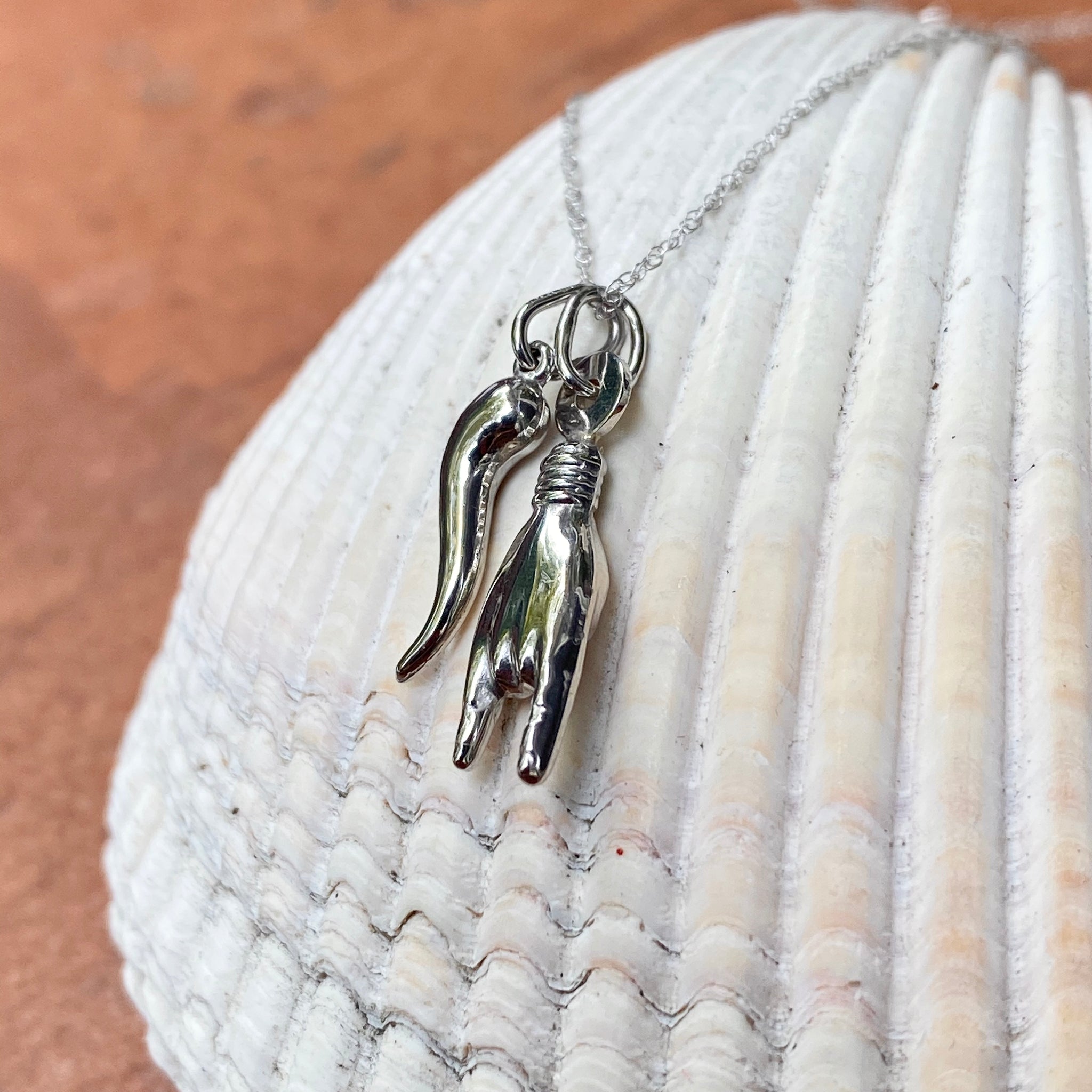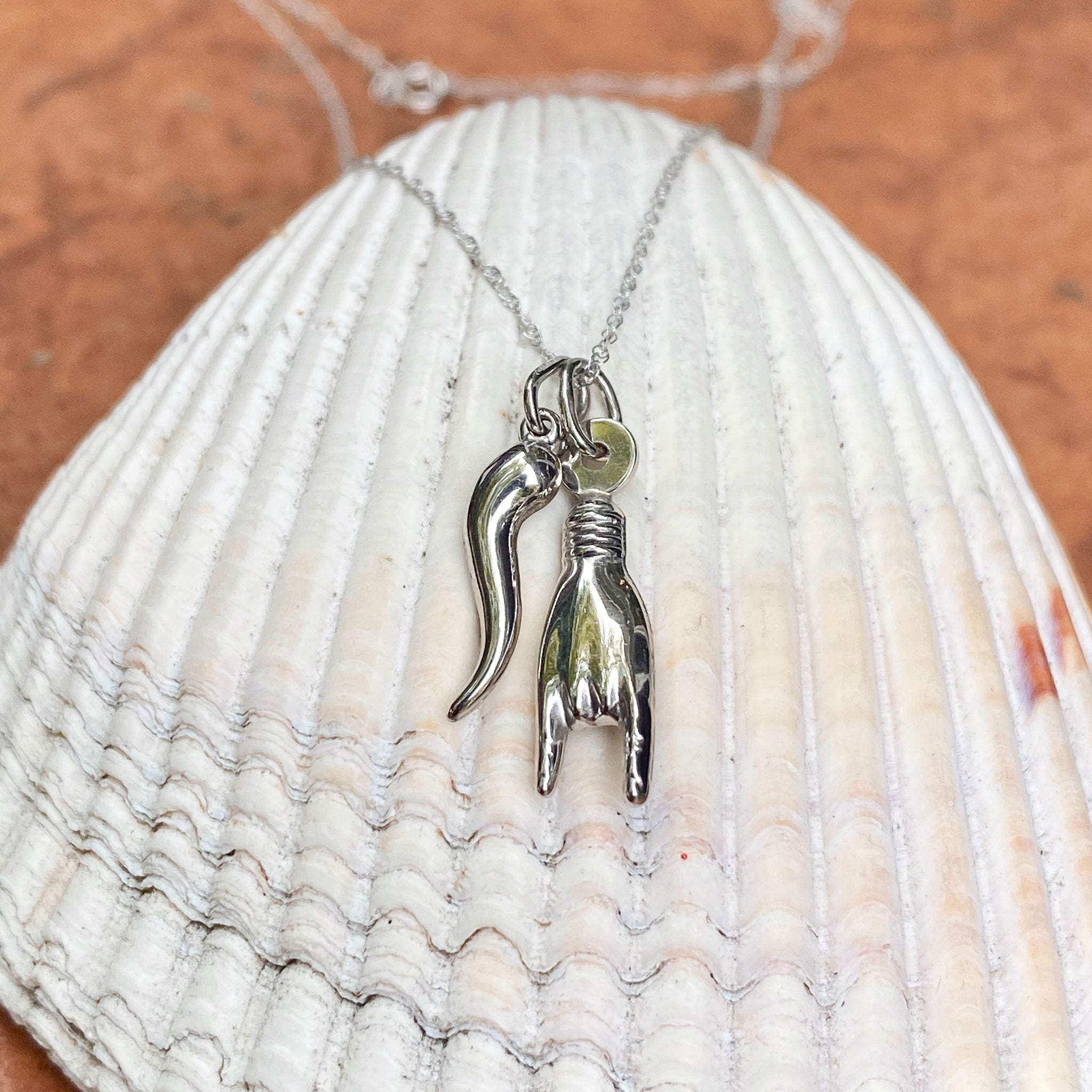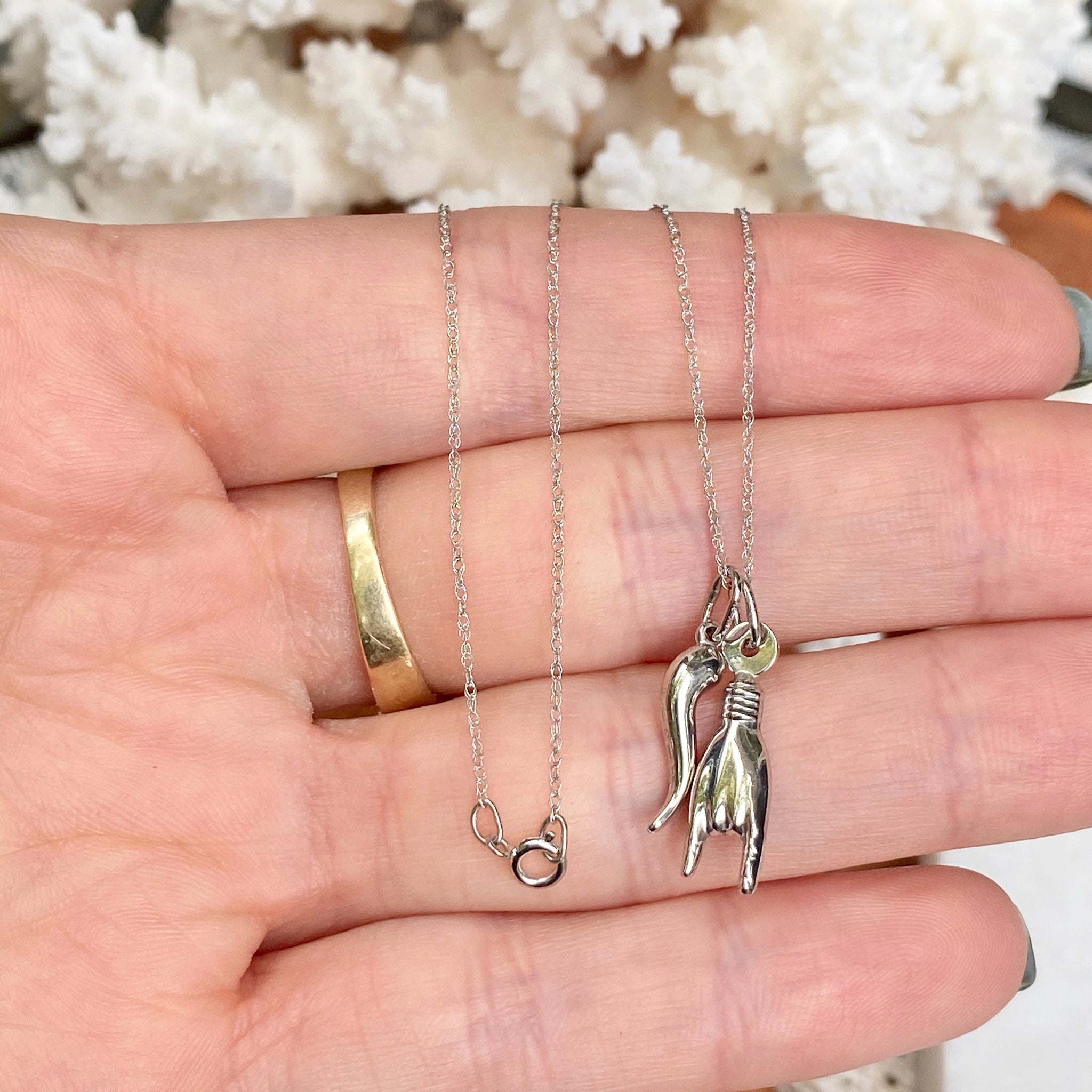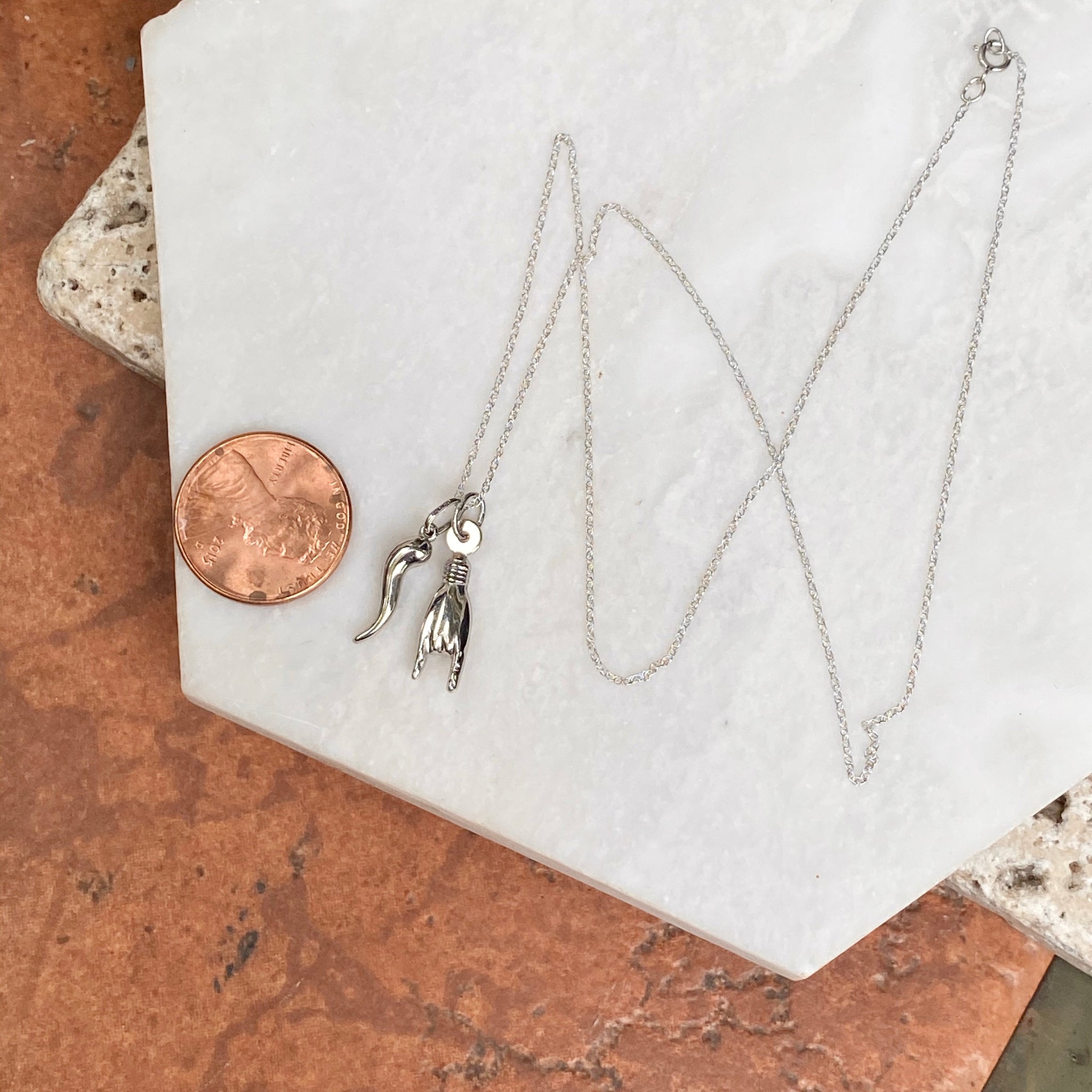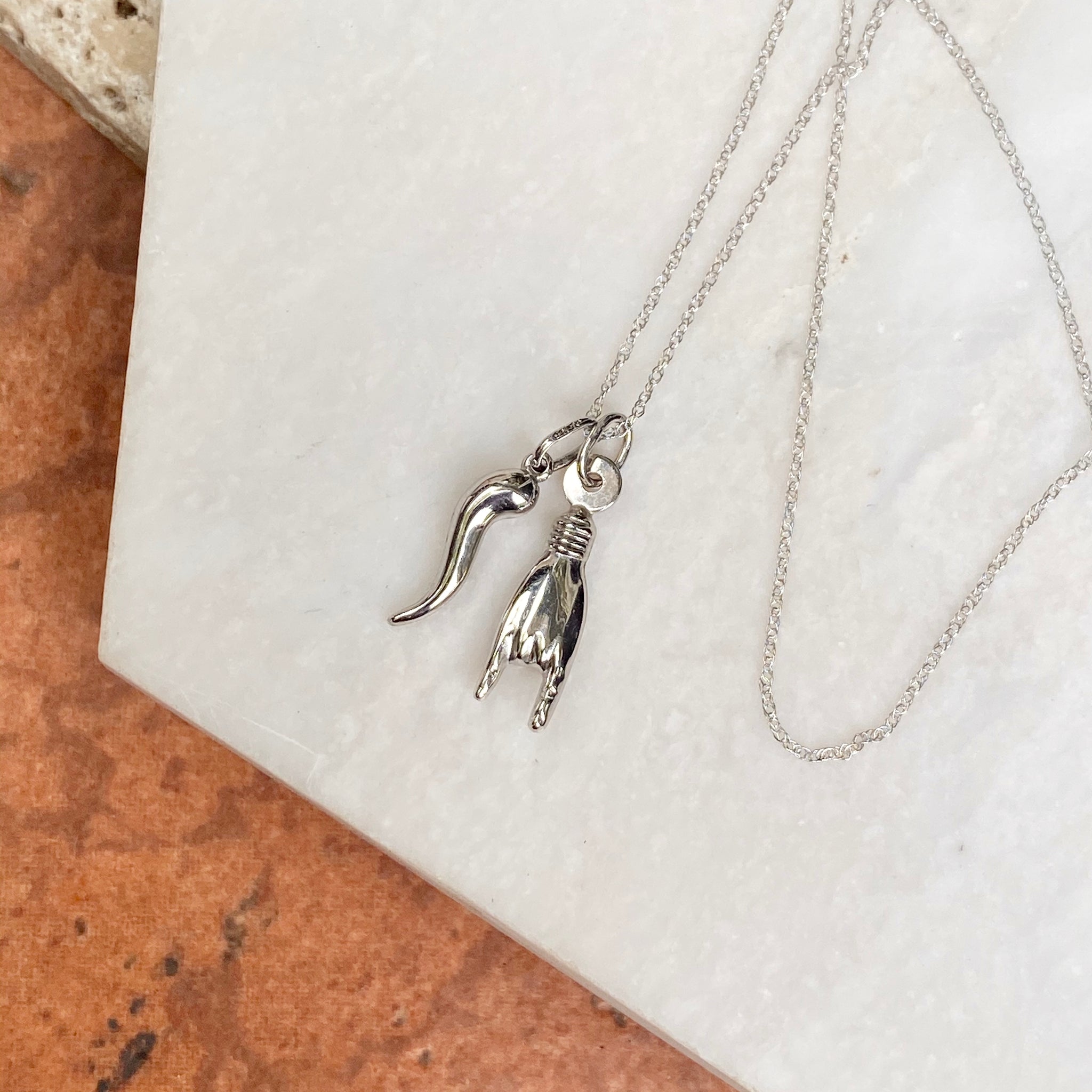 14KT white gold thin, cable chain necklace with (2) pendant charms: (1) 14K Mano Cornuto pendant + (1) 14K Italian horn "Corno" pendant. The Mano charm represents a hand gesture in which the index and little fingers are extended while the middle and ring fingers are curled into the palm. The reference is to the horned head of an animal. The Mano Cornuto is often worn to provide protection from the evil eye or bad energies. The Italian Horn or "Cornicello" is said to protect you from evil energies!