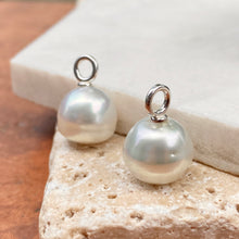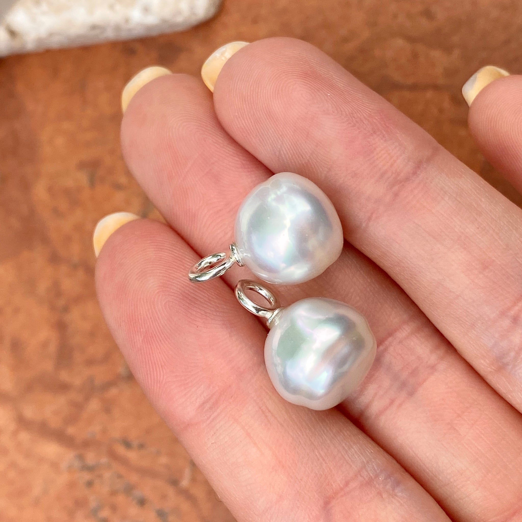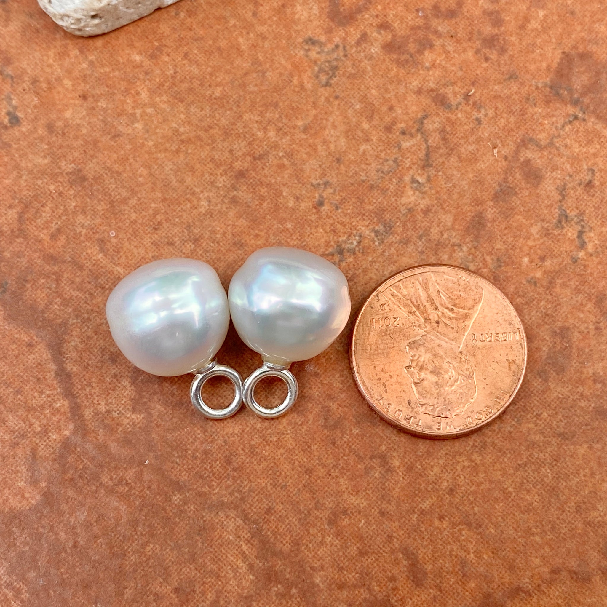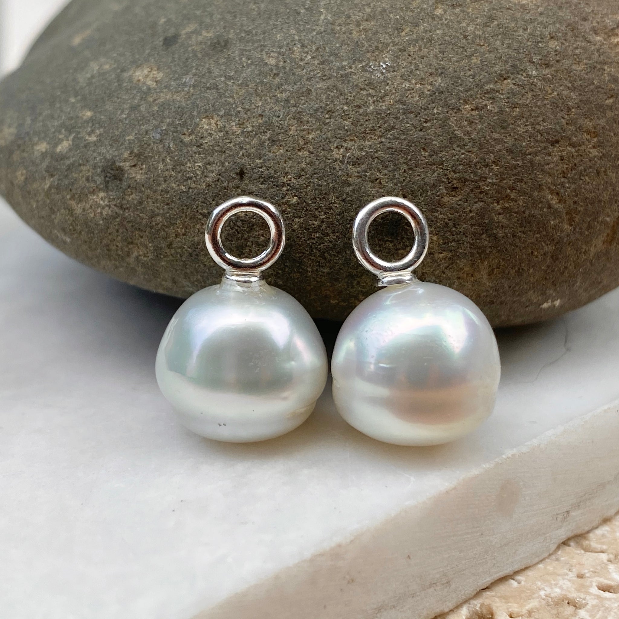 Polished 14KT white gold Paspaley South Sea Pearl round earring charms. Elegant pearl earring charms to slide on white gold hoops or even use as a pendant slide! Please note: each Paspaley Pearl is unique in look, and each time we make these up, they may differ slightly from photos but will look as identical as possible.