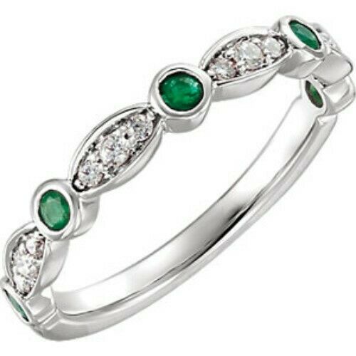 14KT white gold polished band ring with pave diamonds + emeralds. A beautiful, unique option for a wedding band!