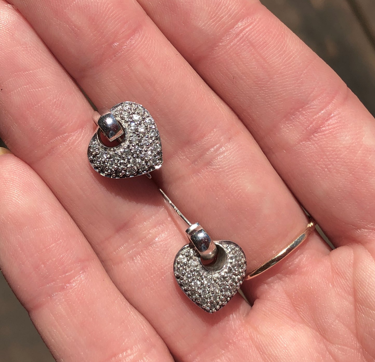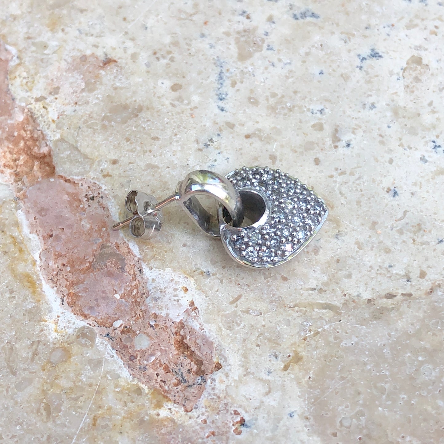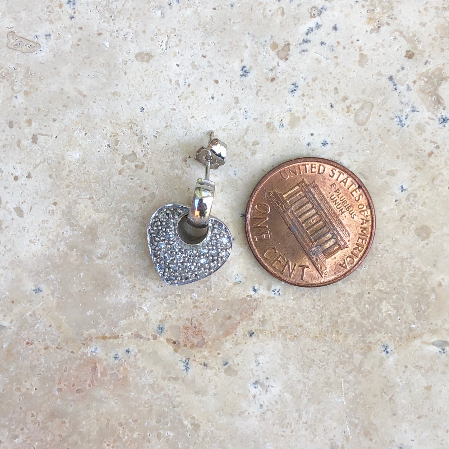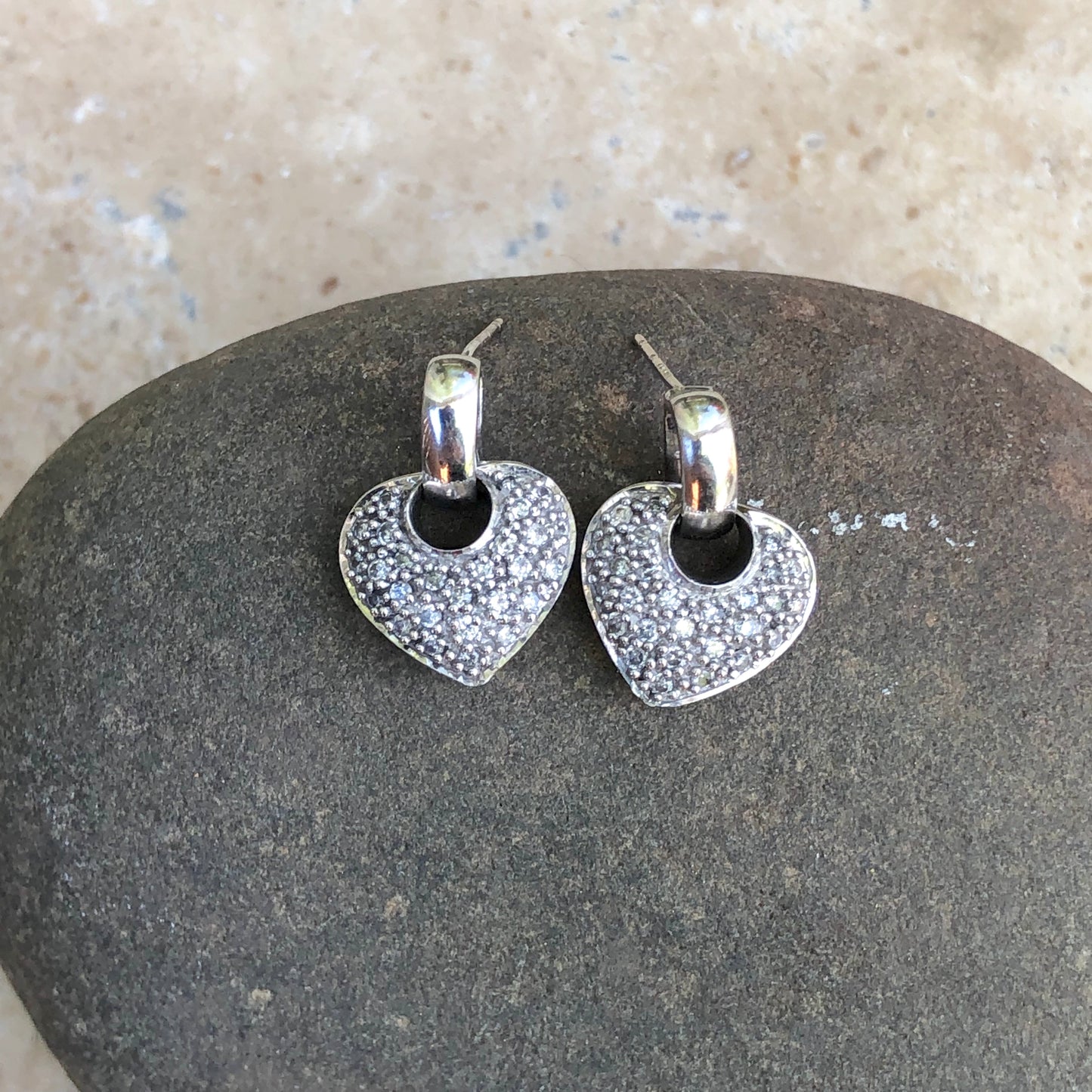 14KT white gold half-hoop/ post earrings + pave diamond removable heart charms. Beautiful, sparkling diamond earrings!