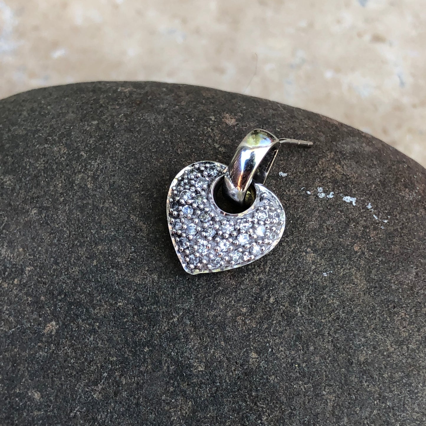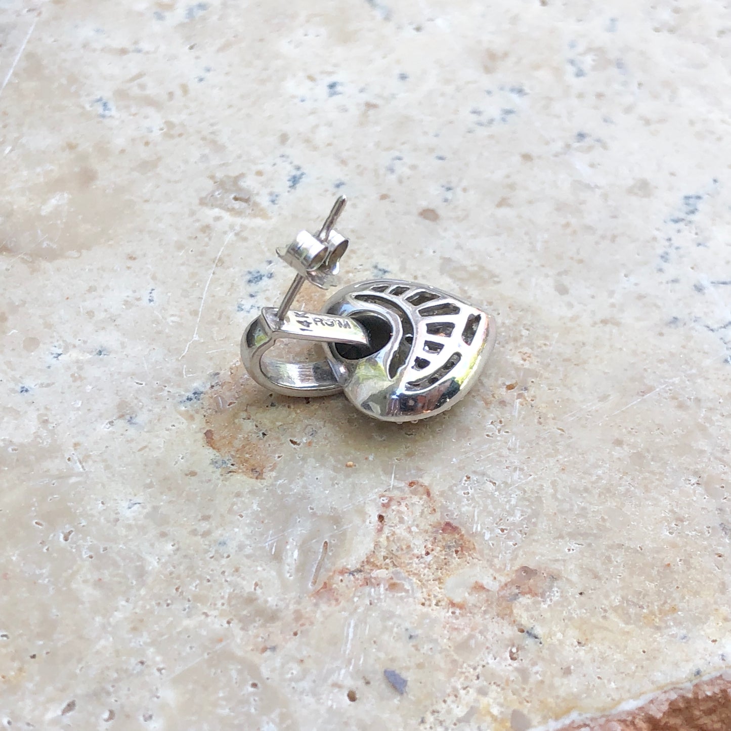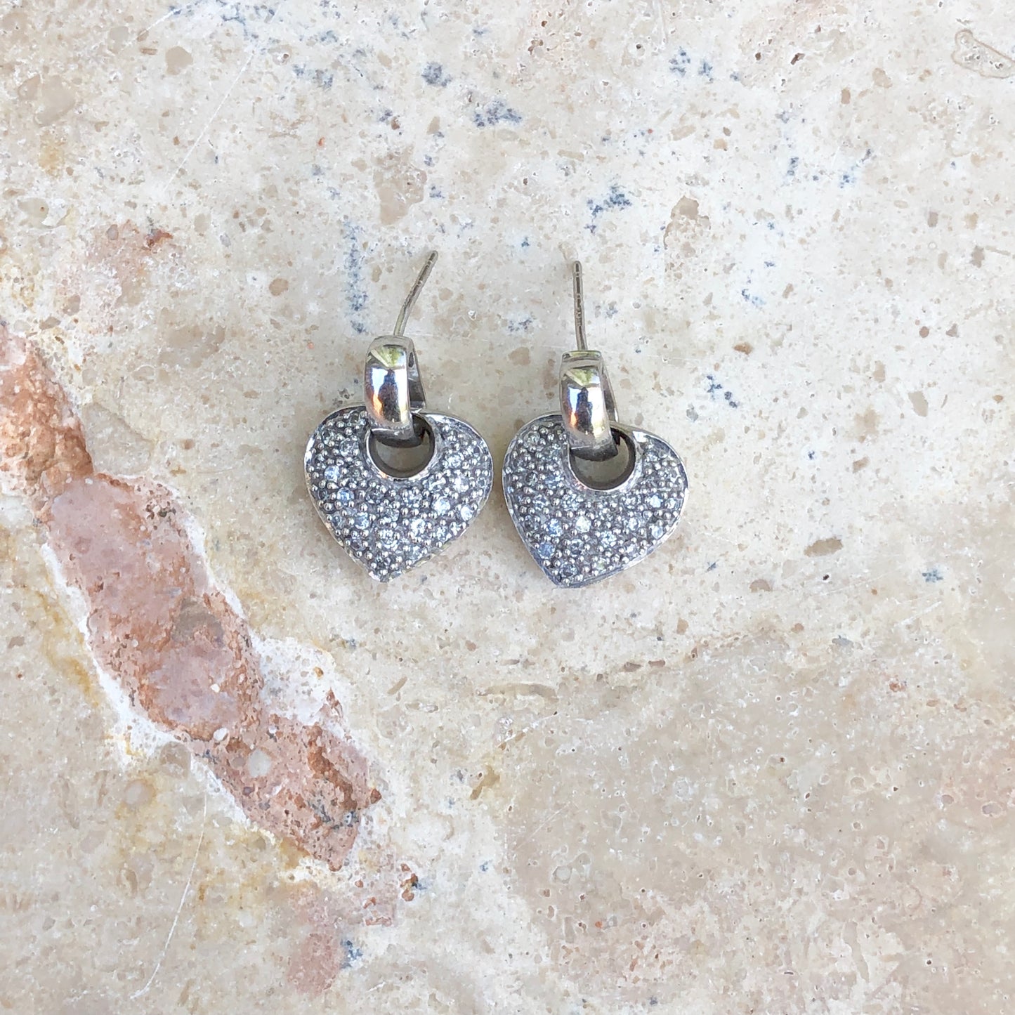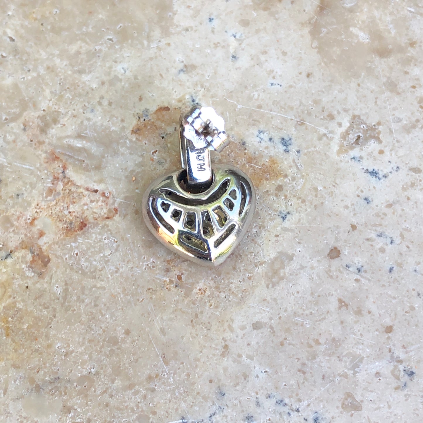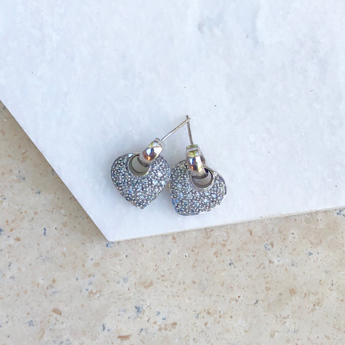 14KT white gold half-hoop/ post earrings + pave diamond removable heart charms. Beautiful, sparkling diamond earrings!