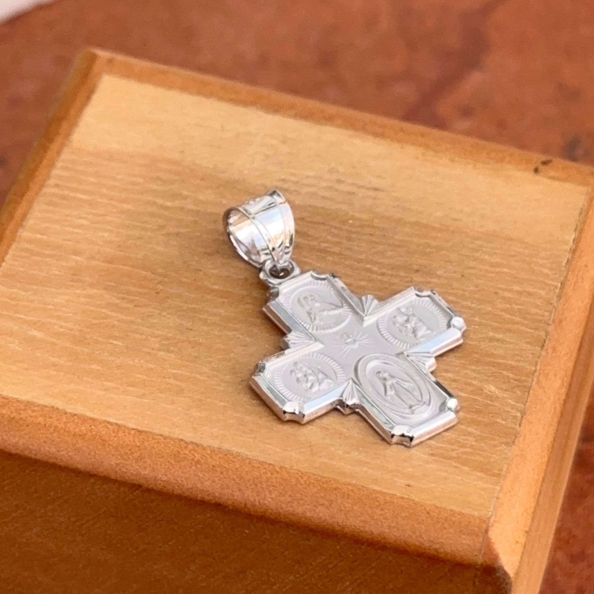 14KT White Gold Polished and Satin Engraved Four Way Cross Pendant. The Four Way Cross Medal includes the Sacred Heart at the top, St.Christopher on the right, Miraculous Mary on the bottom, and St.Joseph on the left. Also known as a cruciform.