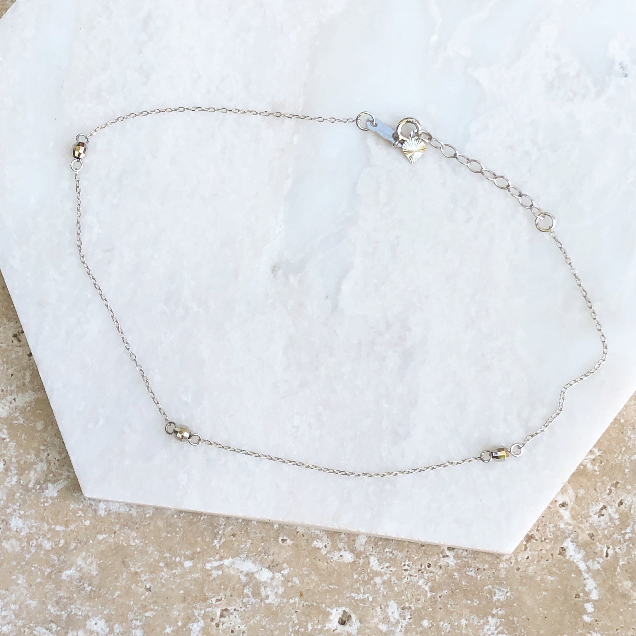 14KT white gold puffed rice beaded anklet. Sparkle up your ankles this season with a gold anklet- and never worry about it tarnishing!