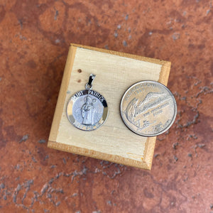 Polished + satin 14KT white gold round Saint Patrick "Pray for Us" medallion pendant charm. St. Patrick is the Patron Saint of Ireland and the Irish and engineers.