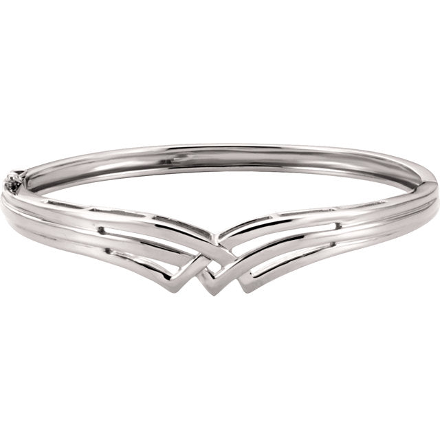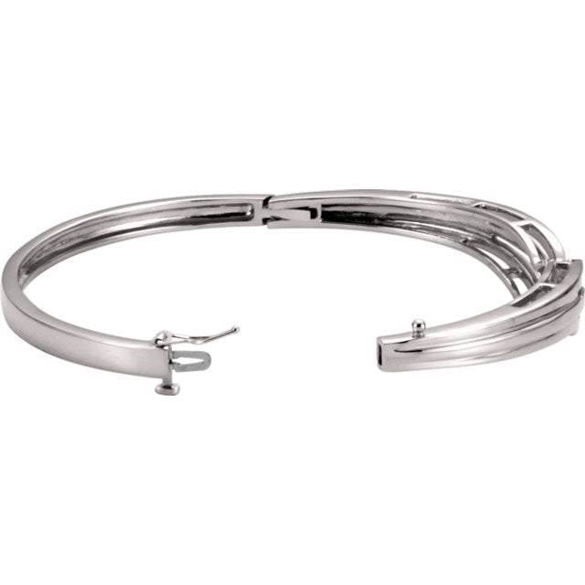 14KT polished white gold 3 weave design bangle bracelet with hinge. Pretty gold bangle bracelet to wear by itself or with stacking other bangles! Also available in yellow gold.