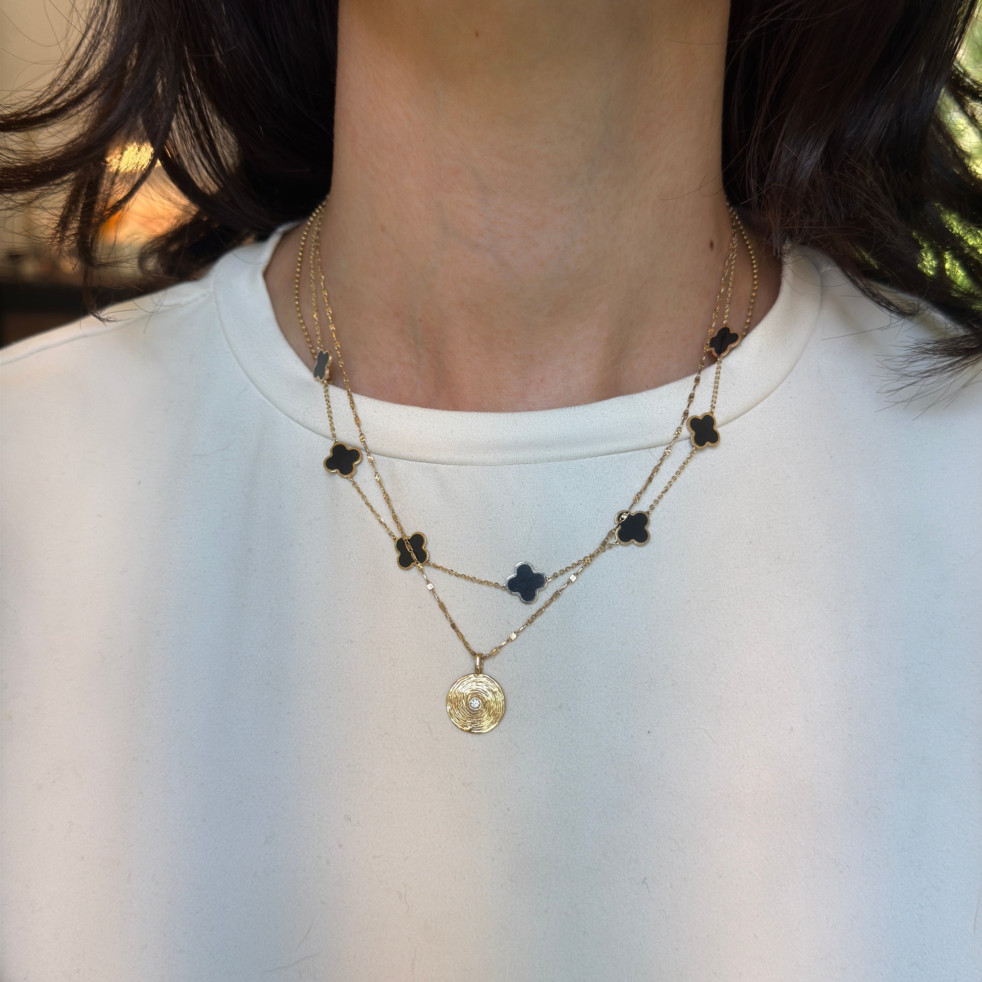 14KT Yellow Gold Genuine Black Onyx 4 Leaf Clover Station Charms Chain Necklace