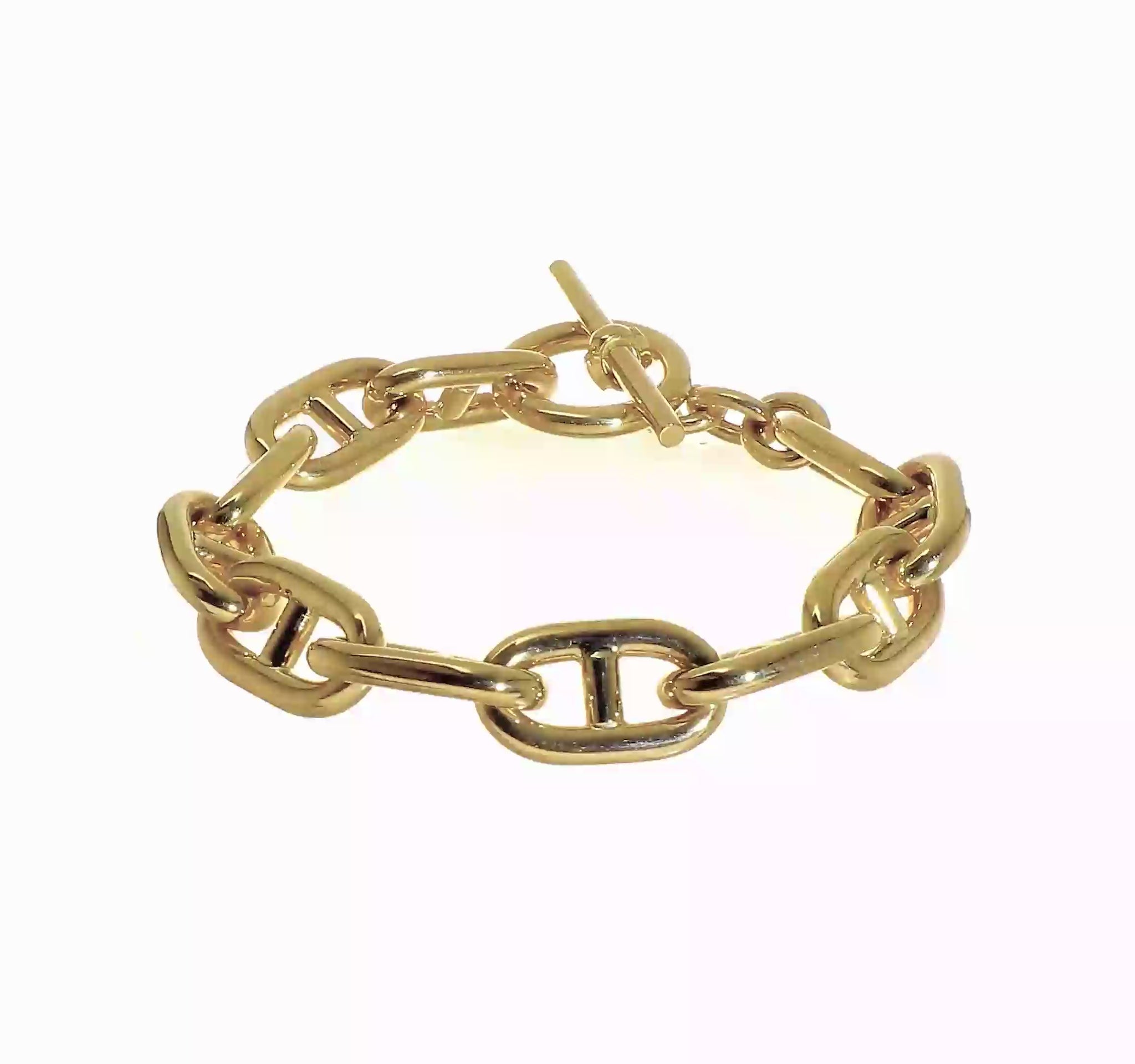 Gorgeous 14KT yellow gold puffed anchor style links bracelet with toggle clasp.