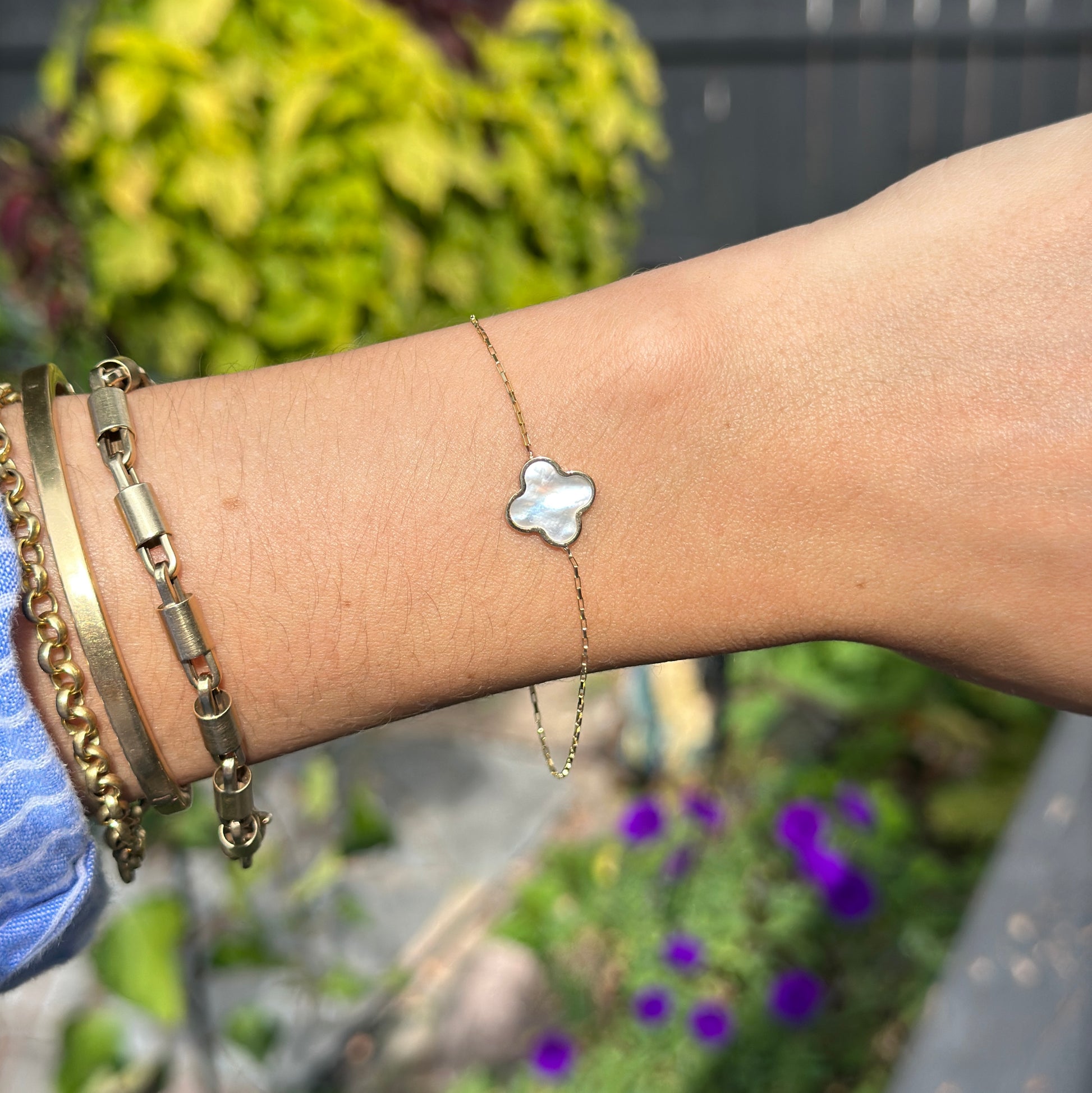 14KT Yellow Gold Genuine, Bezel-Set, White Mother of Pearl 4 Leaf Clover Station Charm Thin Chain Bracelet