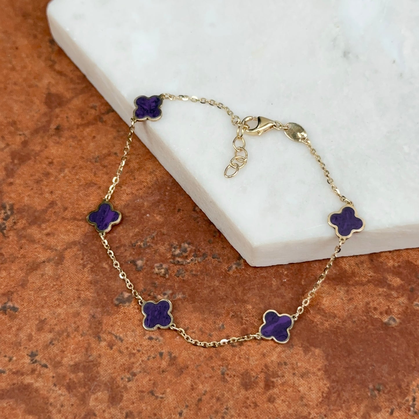 14KT Yellow Gold Genuine Purple Amethyst 4 Leaf Clover Station Charms Thin Chain Bracelet