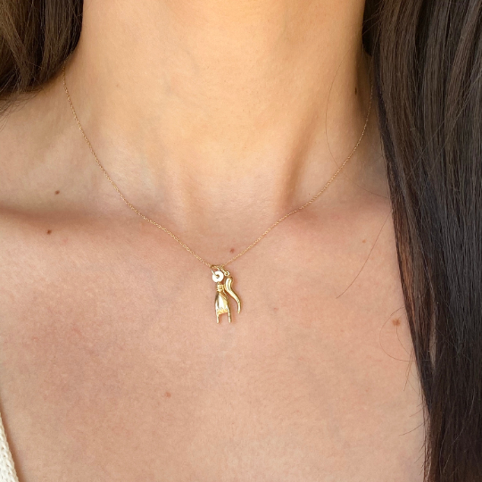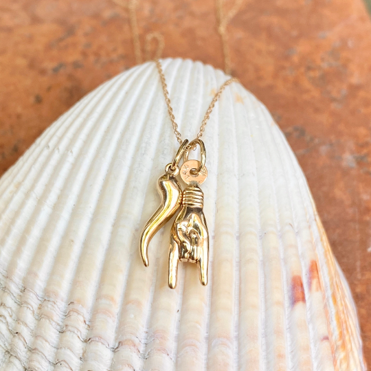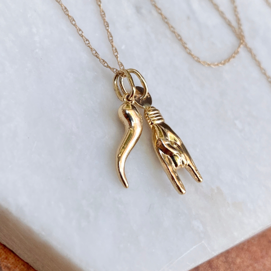 14K yellow gold thin, cable chain necklace with (2) pendant charms: (1) 14K Mano Cornuto pendant + (1) 14K Italian horn "Corno" pendant. The Mano charm represents a hand gesture in which the index and little fingers are extended while the middle and ring fingers are curled into the palm. The reference is to the horned head of an animal. The Mano Cornuto is often worn to provide protection from the evil eye or bad energies. The Italian Horn or "Cornicello" is said to protect you from evil energies! Also available in larger charms size.
