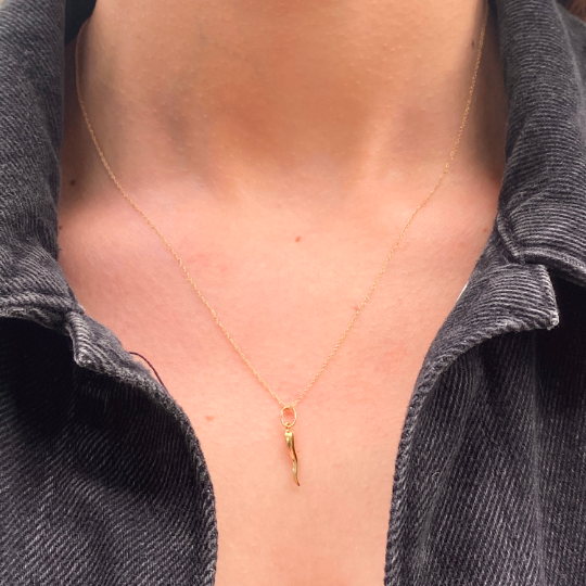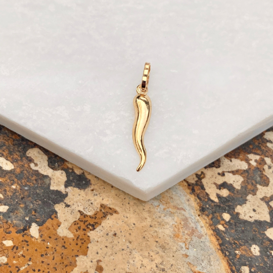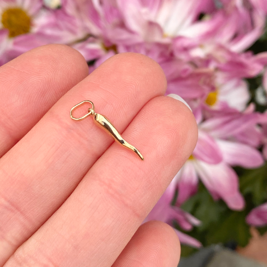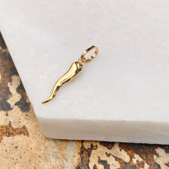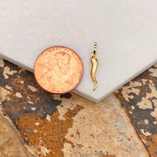14KT yellow gold "Cornicello"/ "Corno" Italian horn charm pendant. Called the "Cornicello" Italian meaning, little horn. Wearing the cornicello is said to protect your against evil + bring good luck!