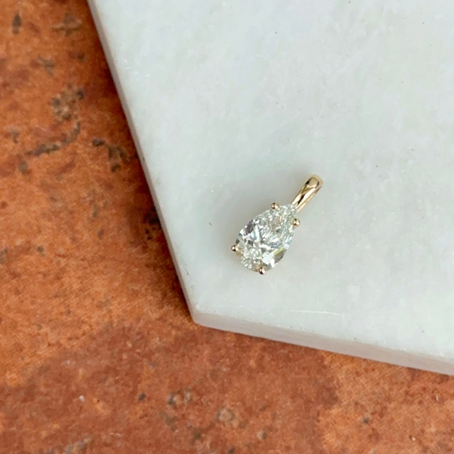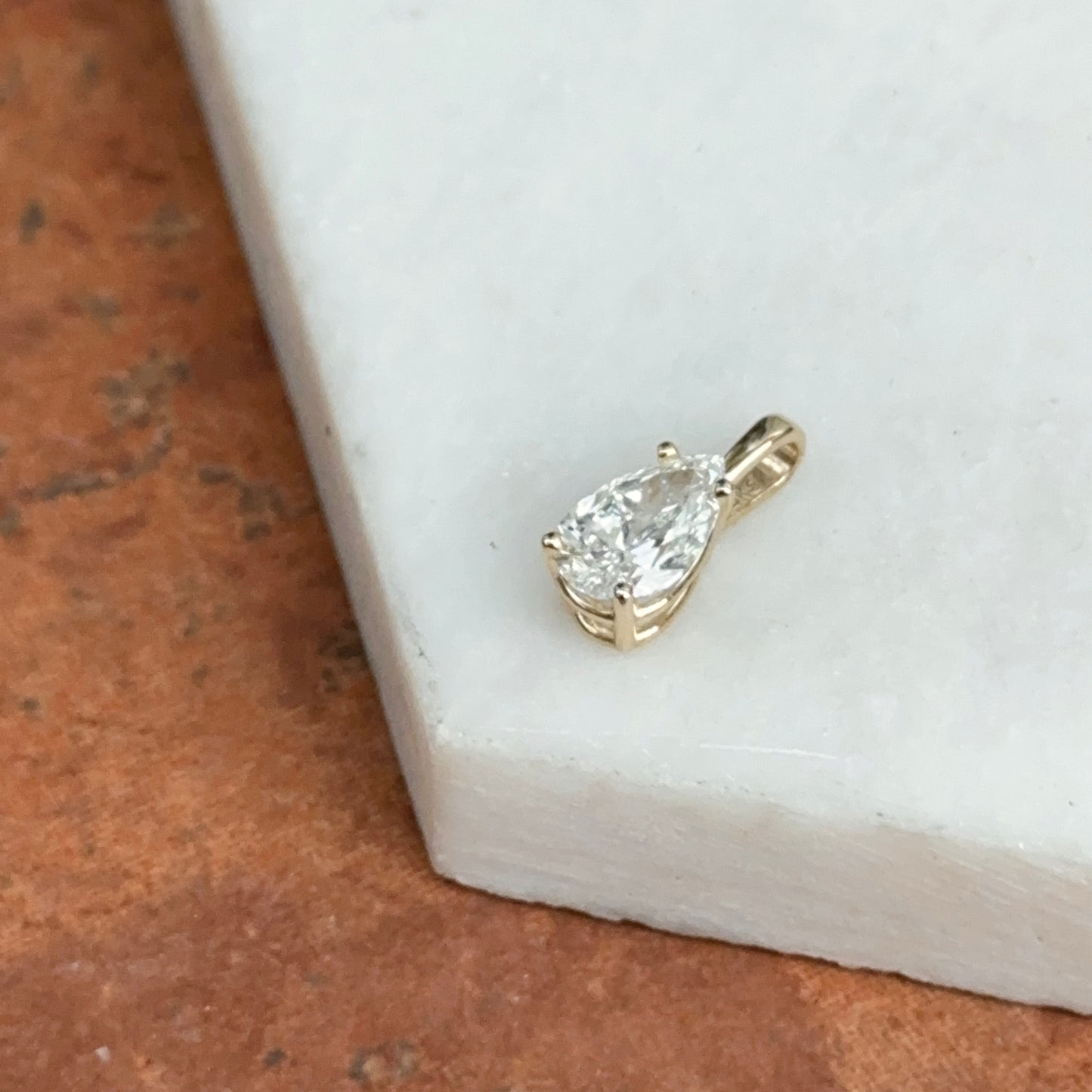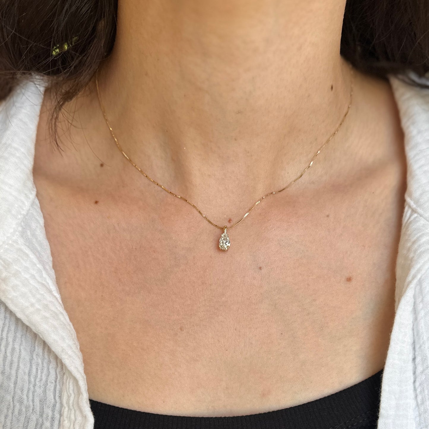 14KT Yellow Gold 4-Prong Basket Setting Pendant with Pear-Shape Lab-Created Diamond. A breathtaking yet minimal diamond pendant! Minimally set with the illusion the diamond is floating on the neckline!