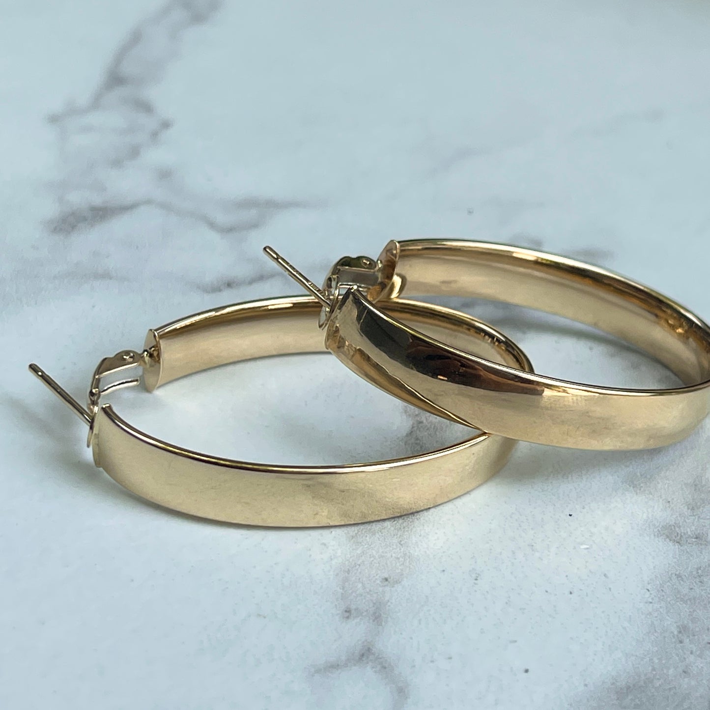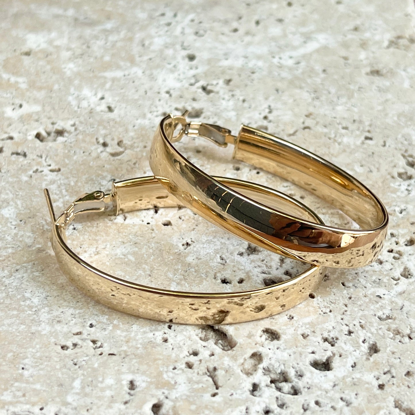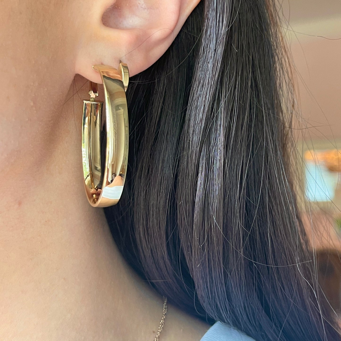 14KT yellow gold polished large oval hoop earrings. Create your own style earrings by adding charms or wear plain!