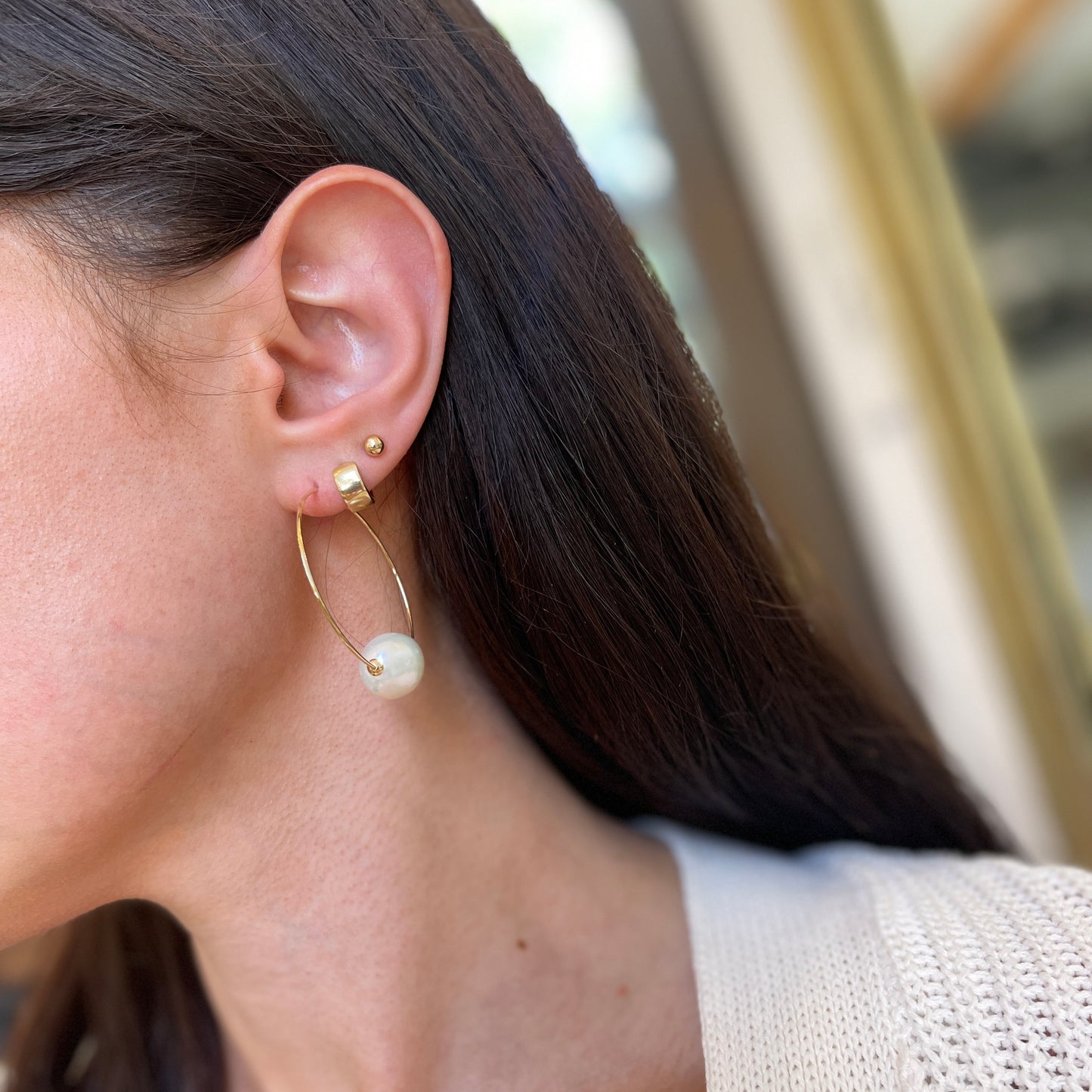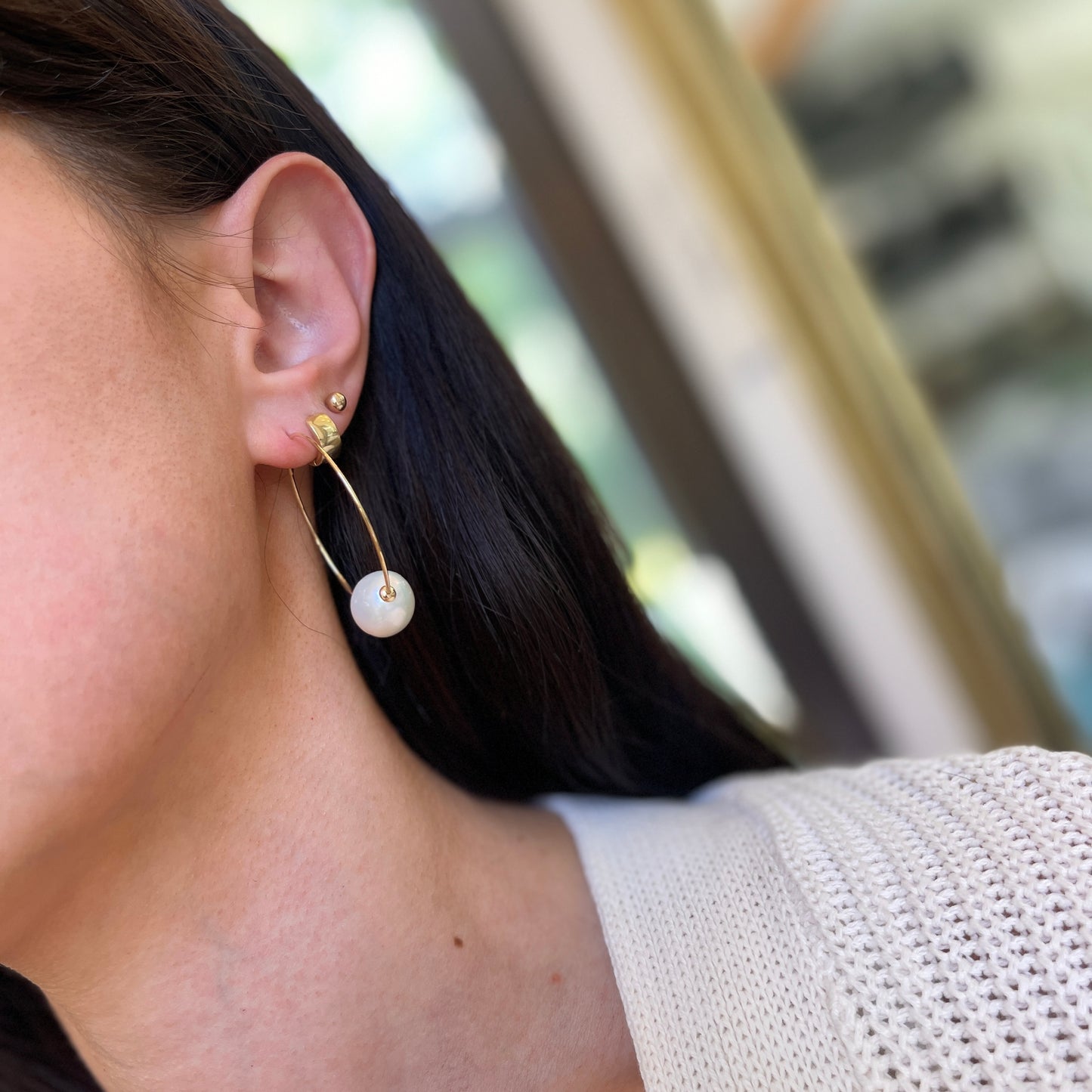 14KT yellow gold endless hoop earrings with white, stationary, baroque pearl charms.
