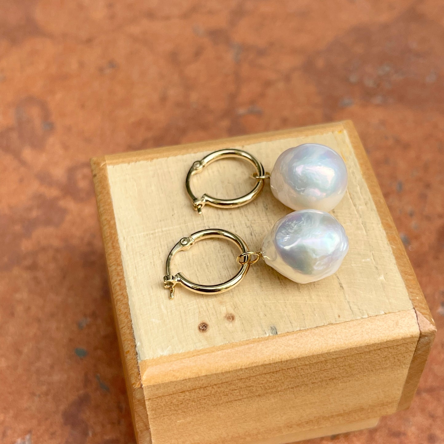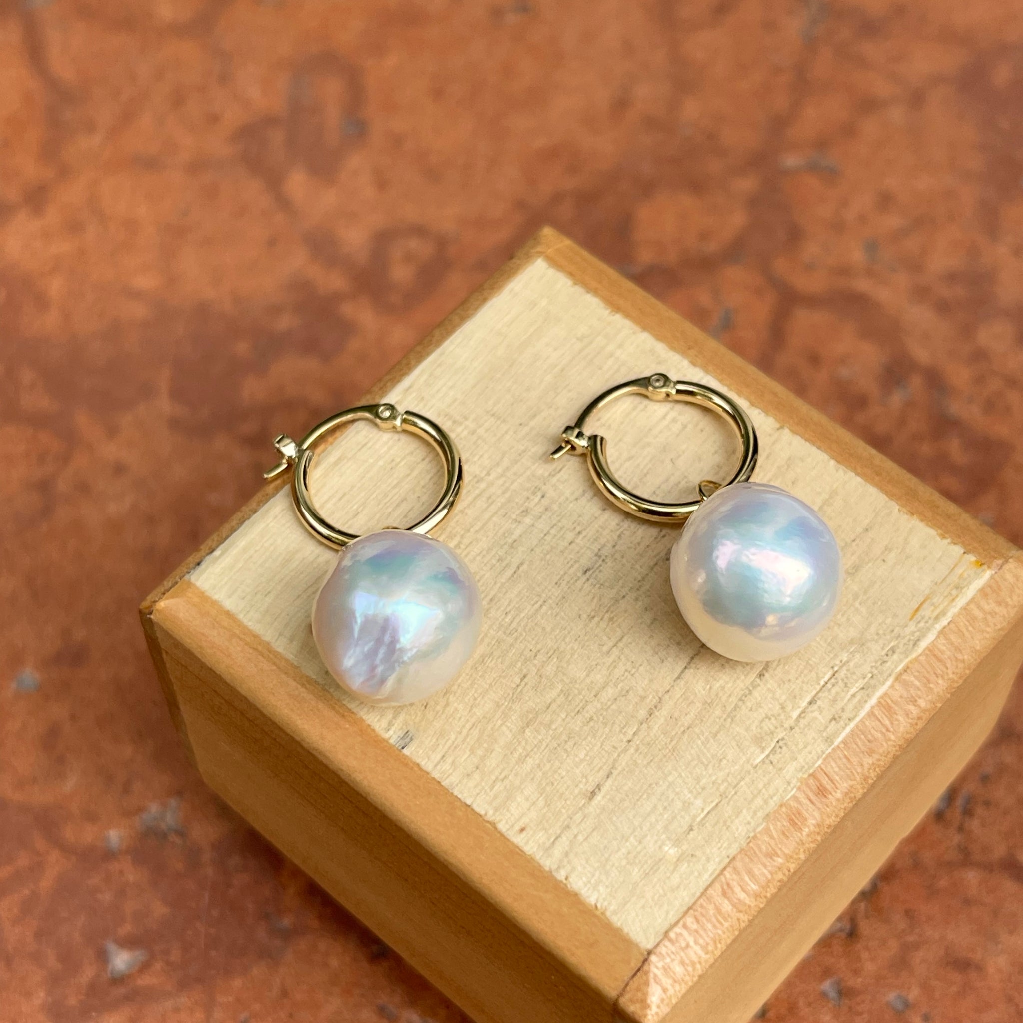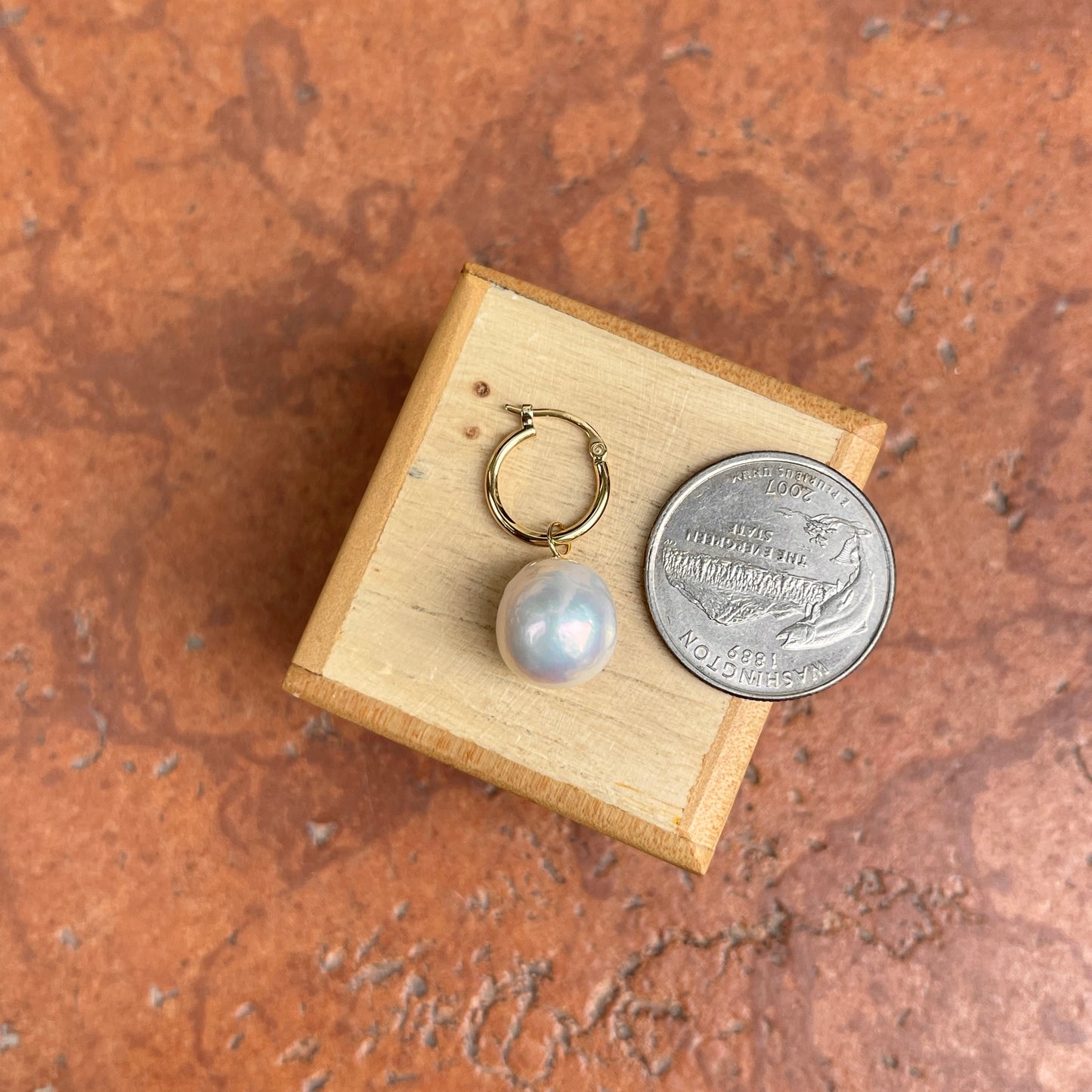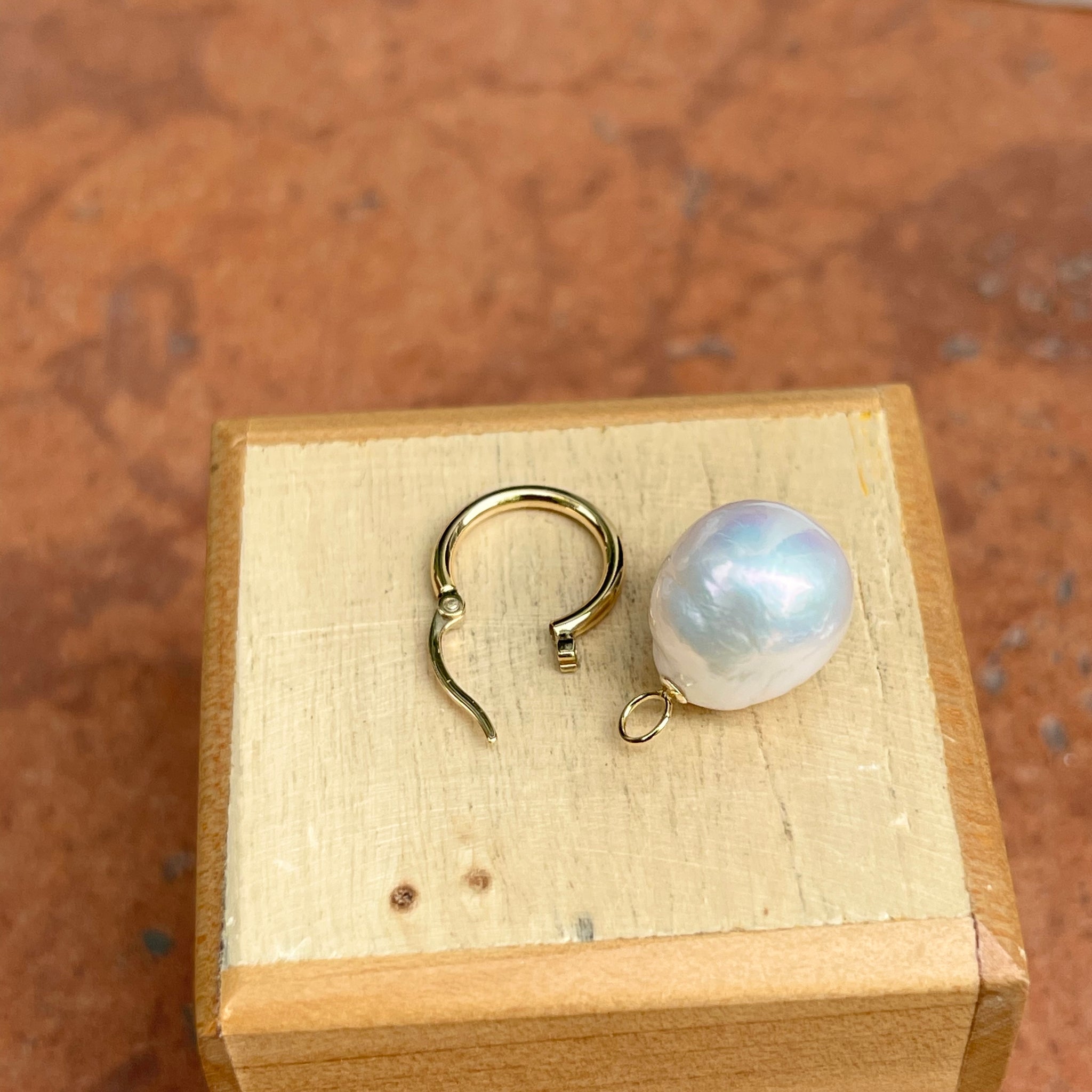 14KT Yellow Gold Baroque White Pearl Charm Hoop Earrings