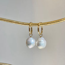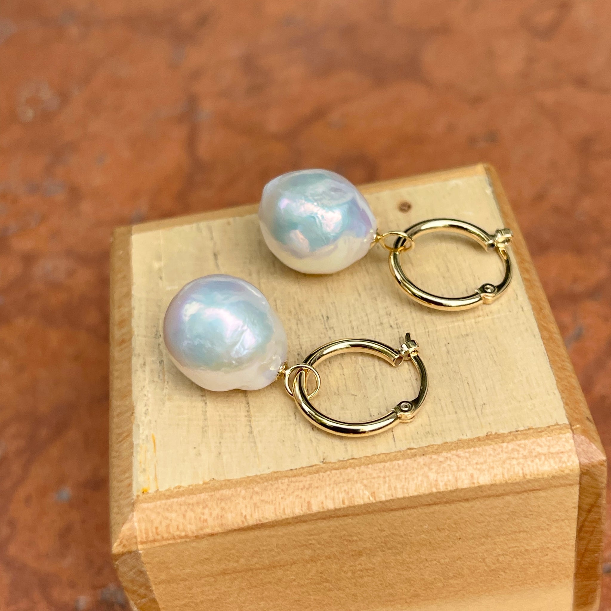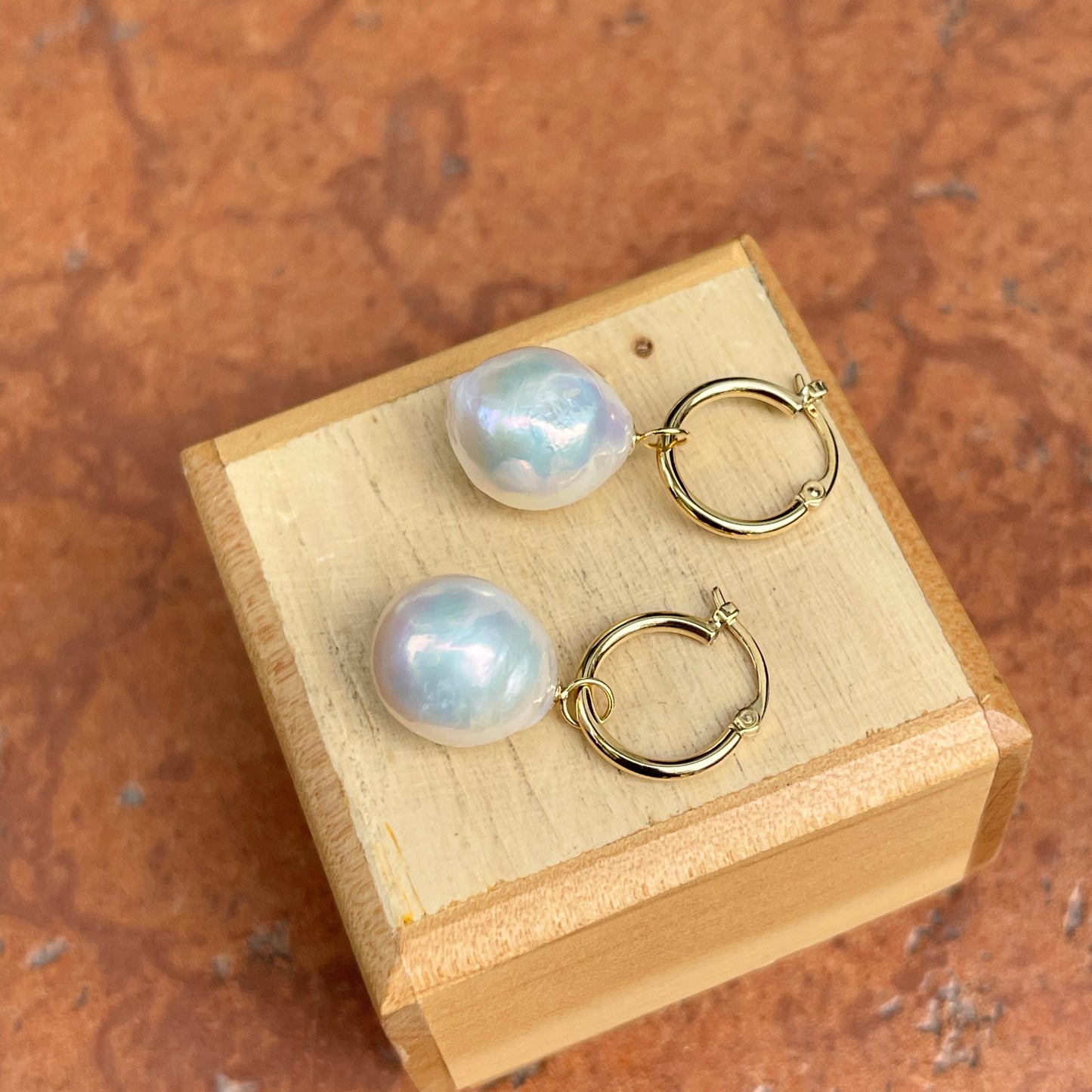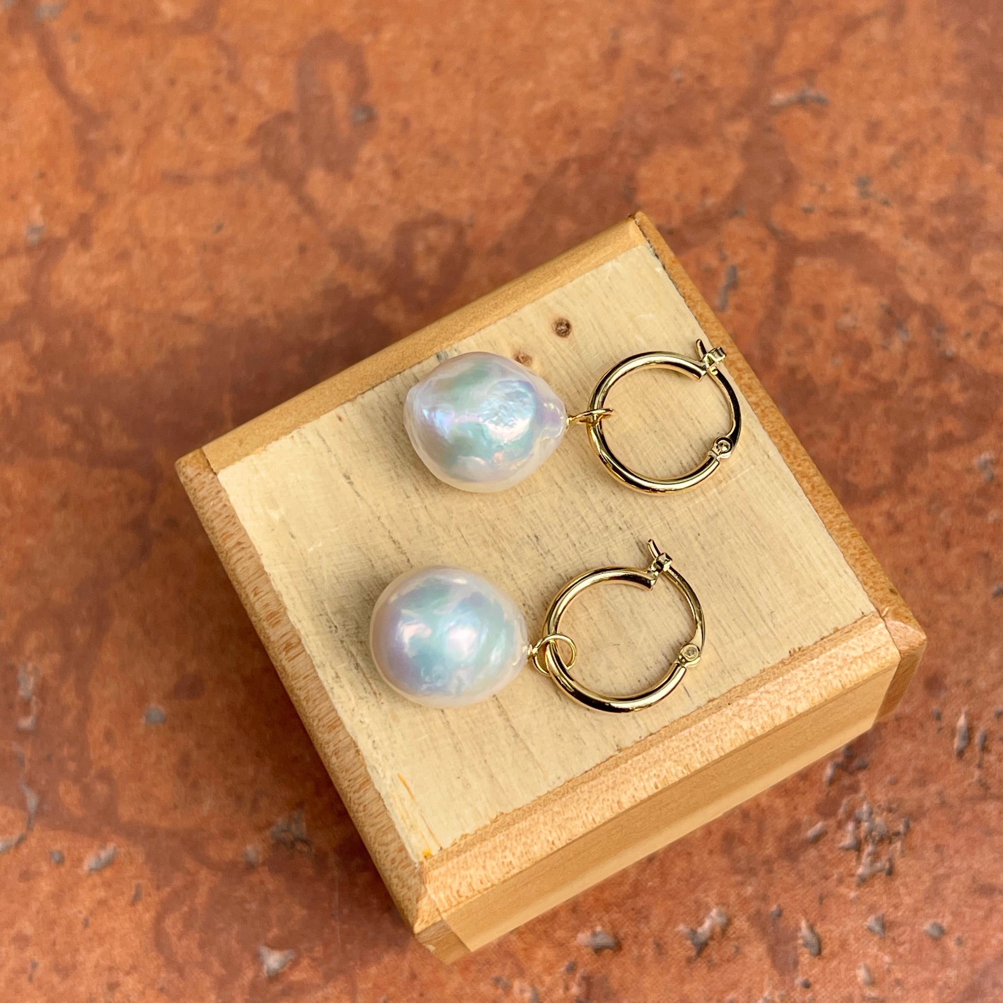 14KT Yellow Gold Baroque White Pearl Charm Hoop Earrings