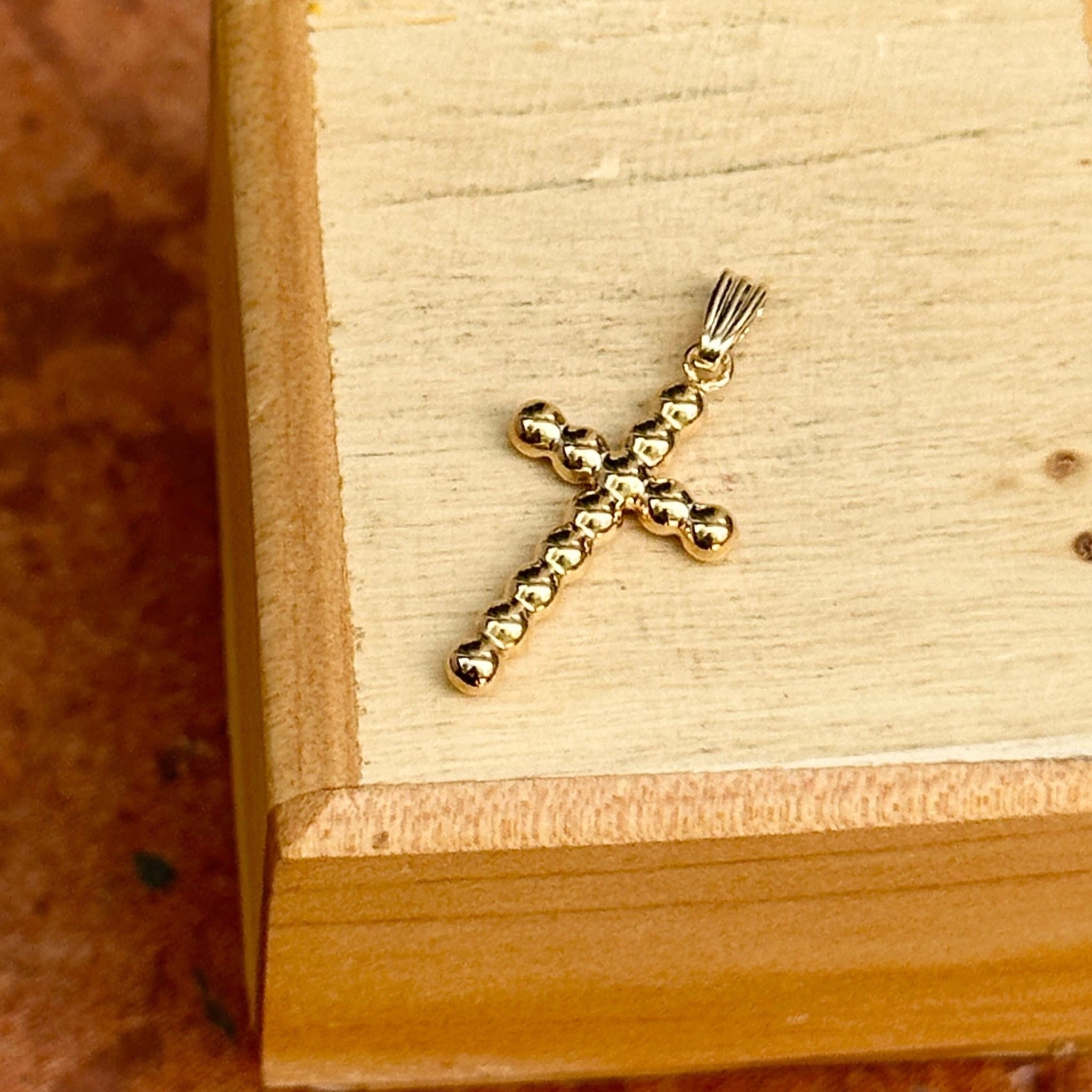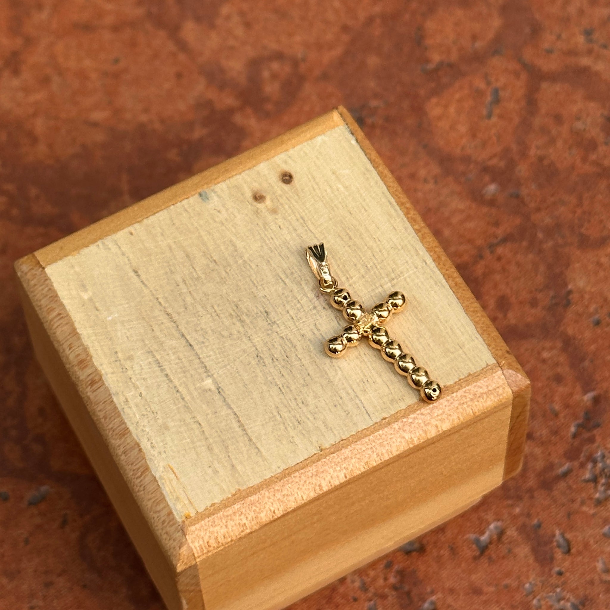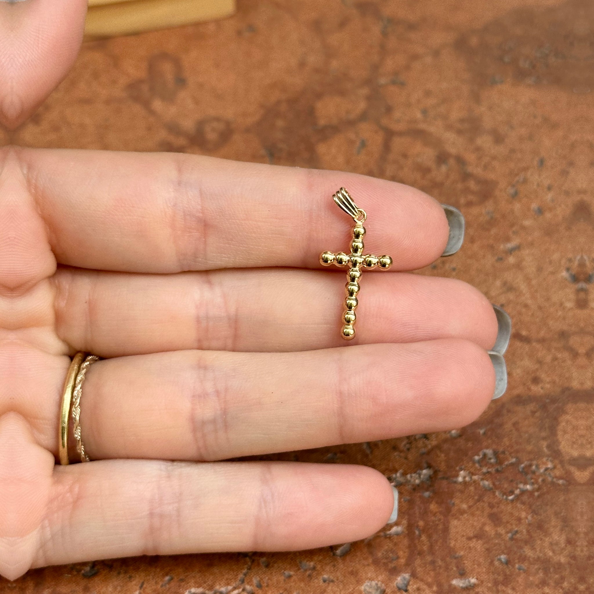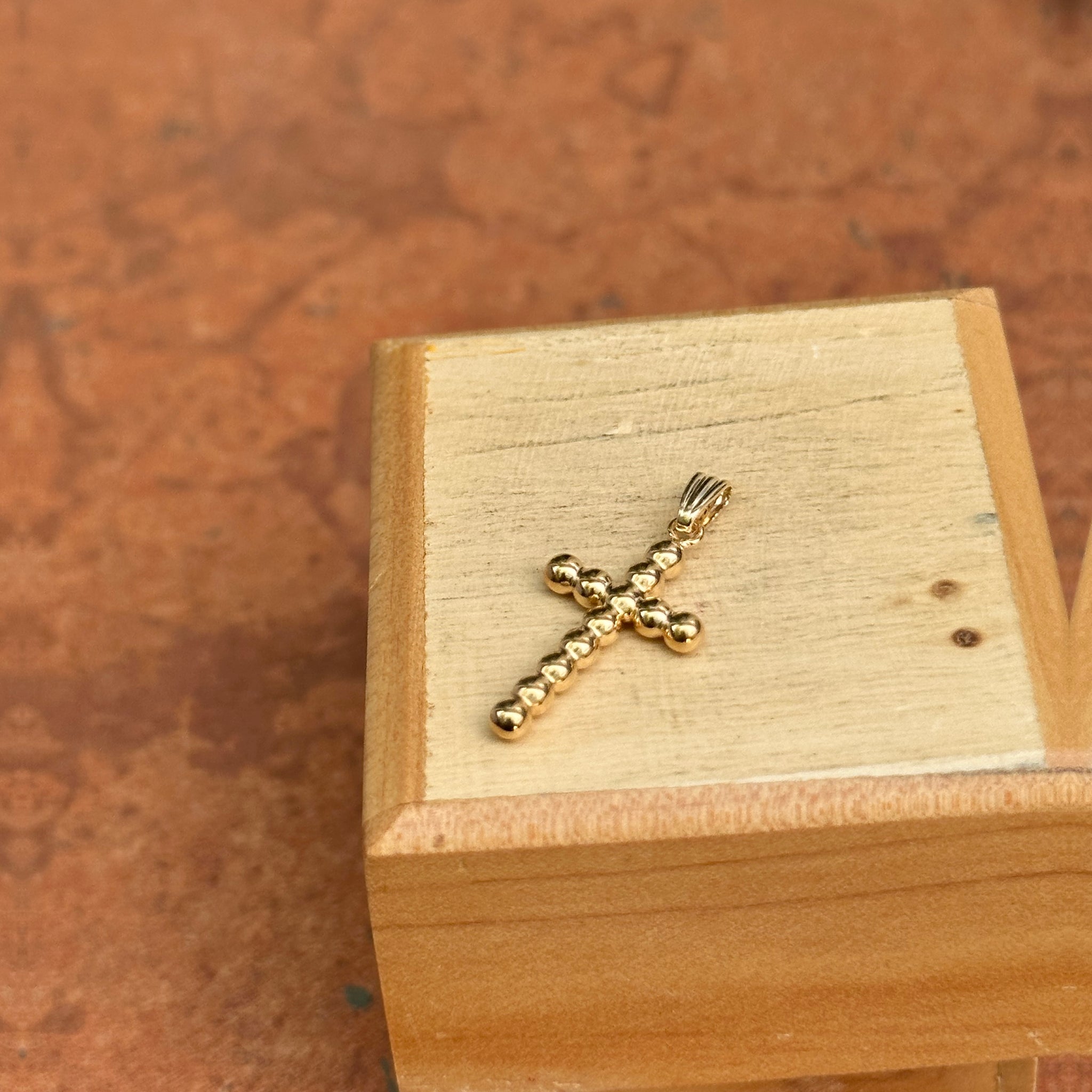 14KT yellow gold shiny-finish beaded cross pendant charm.