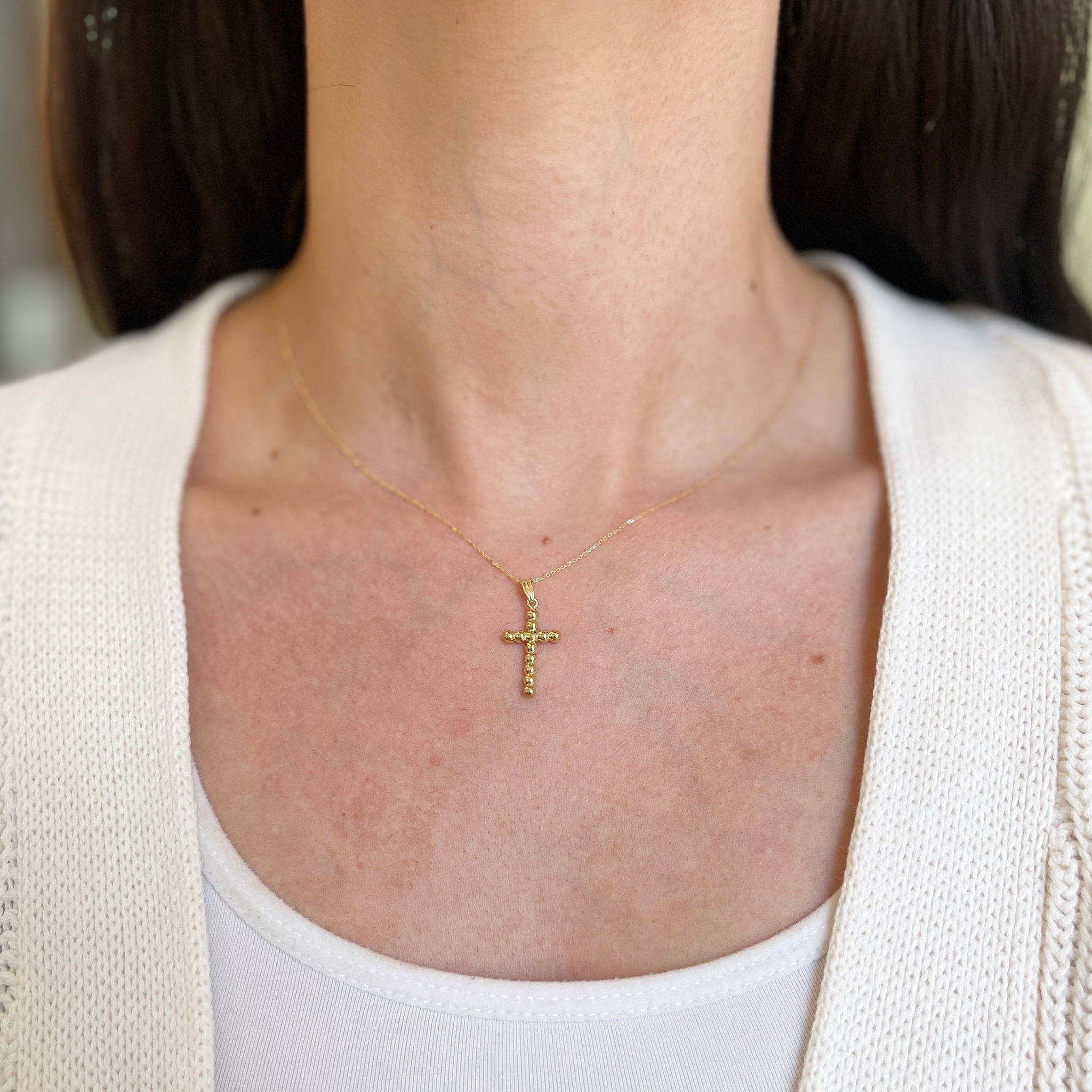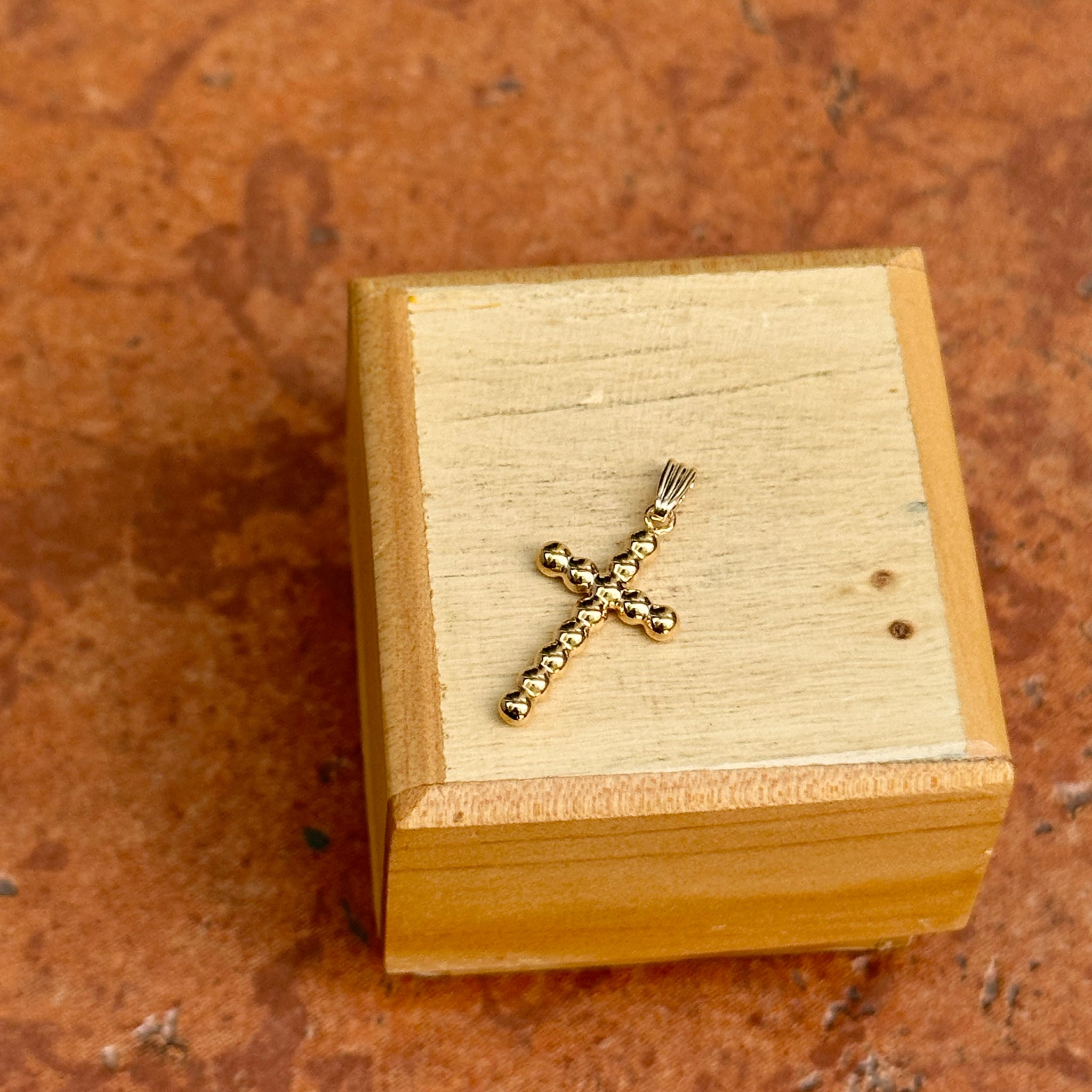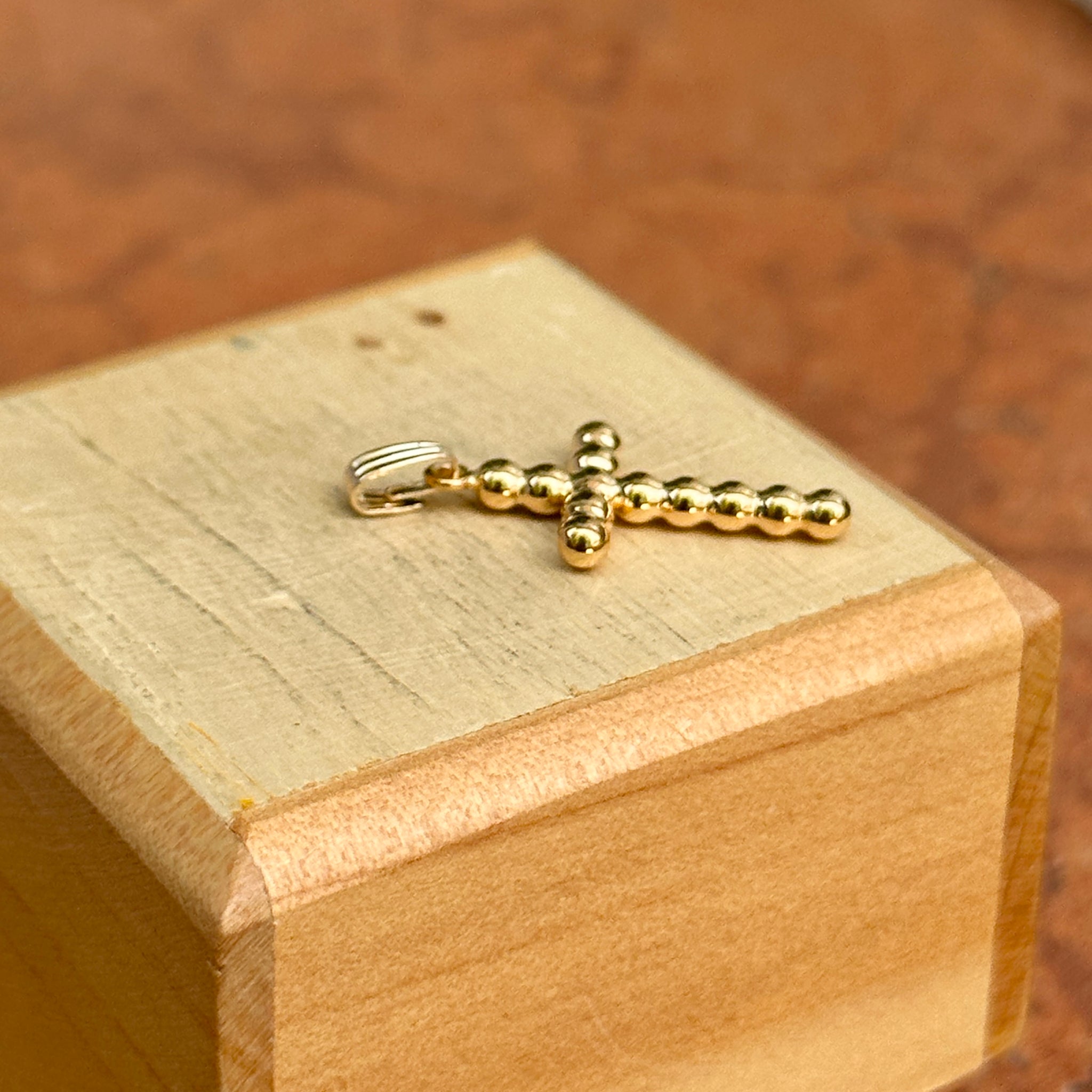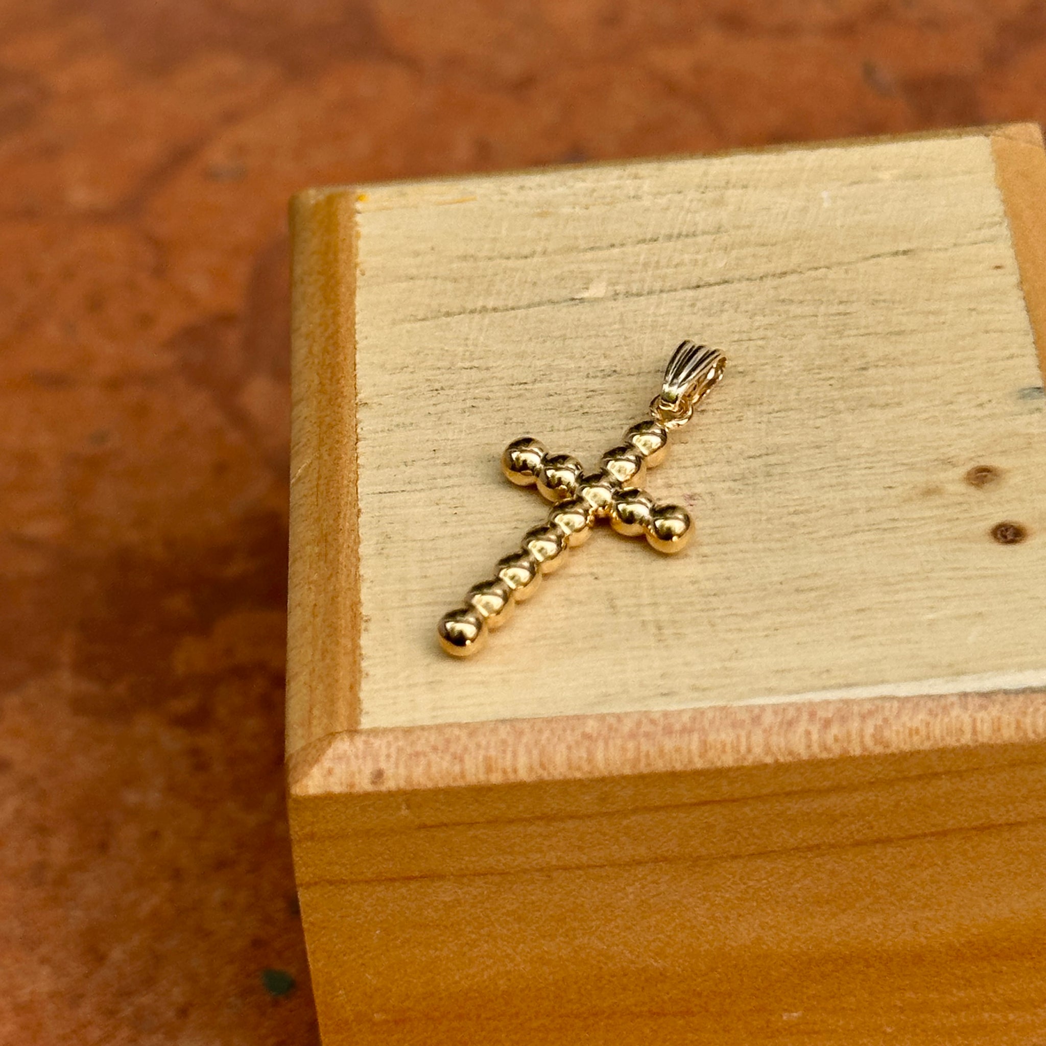 14KT yellow gold shiny-finish beaded cross pendant charm.