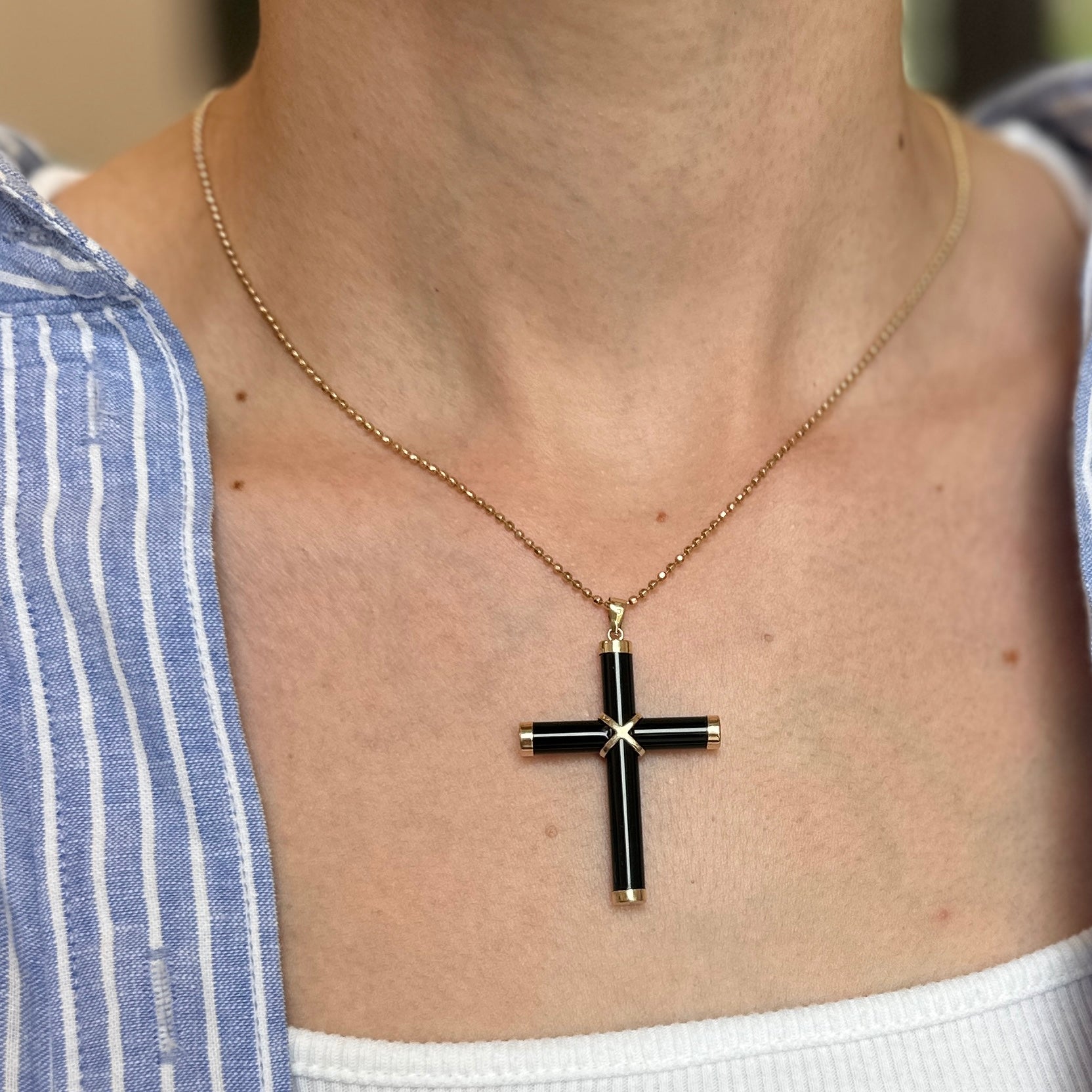 14K yellow gold detailed, genuine, black onyx cross pendant