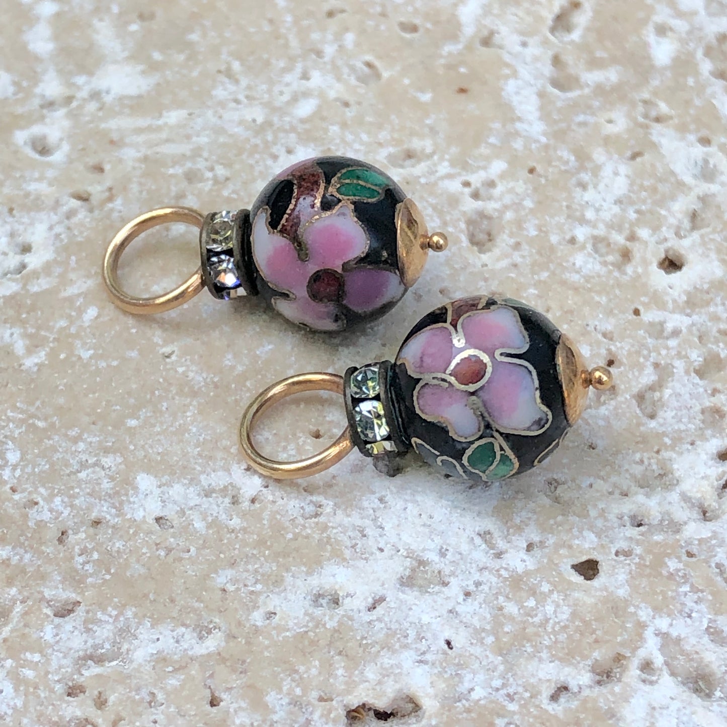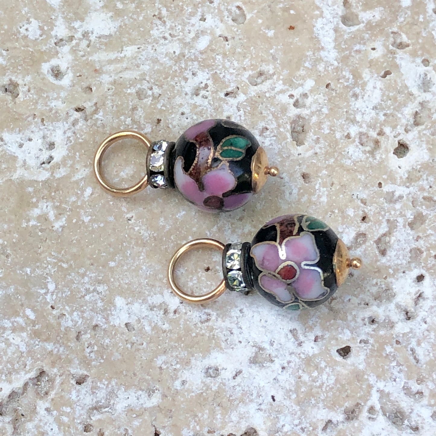 14KT yellow gold round pink/black multi-colored cloisonne earring charms with cubic zirconia stone detail. Charming little earring charms you can slide onto hoop earrings or other wire earrings! Hoops sold separately.