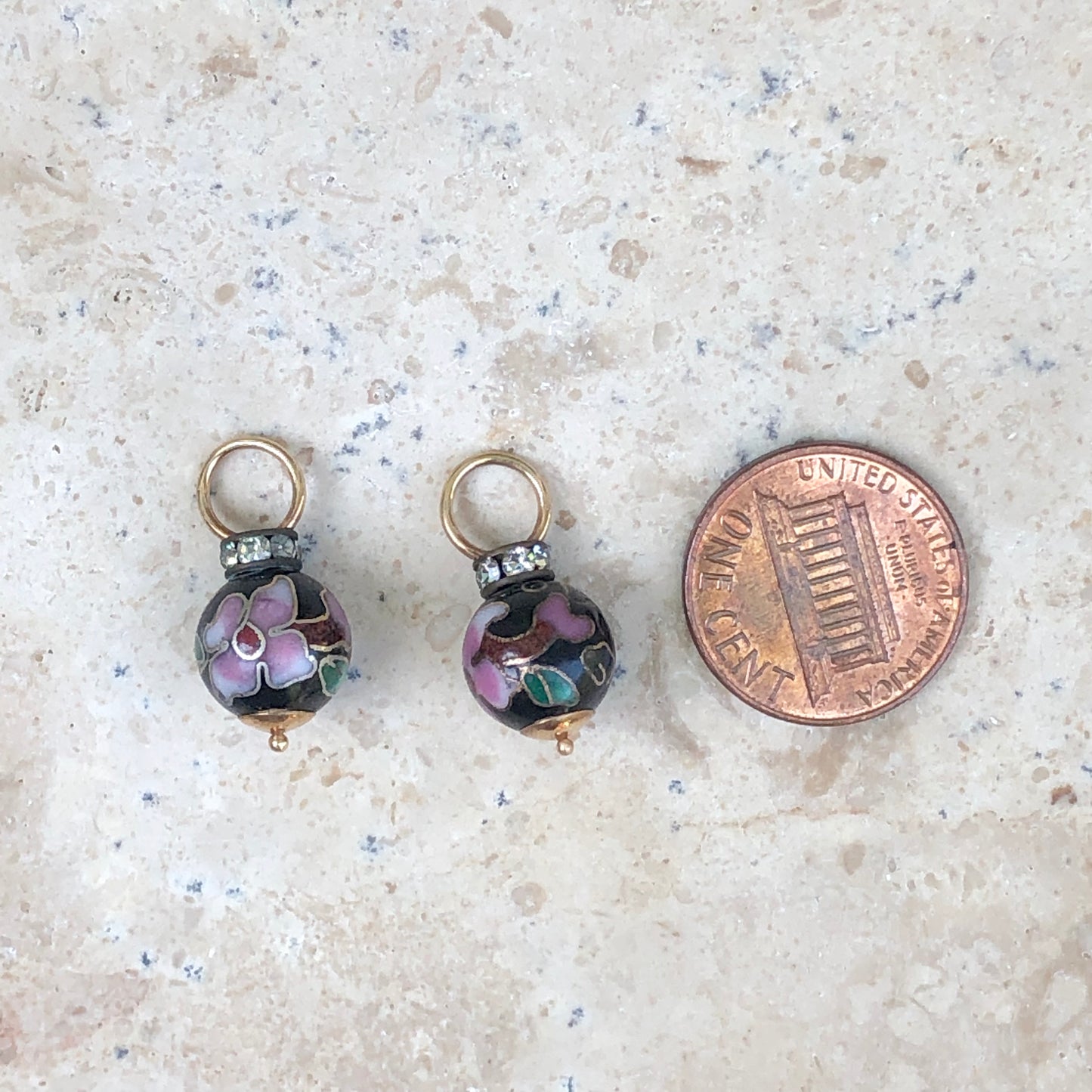 14KT Yellow Gold Black + Pink Multi Color CZ Cloisonne Ball Earring Charms
