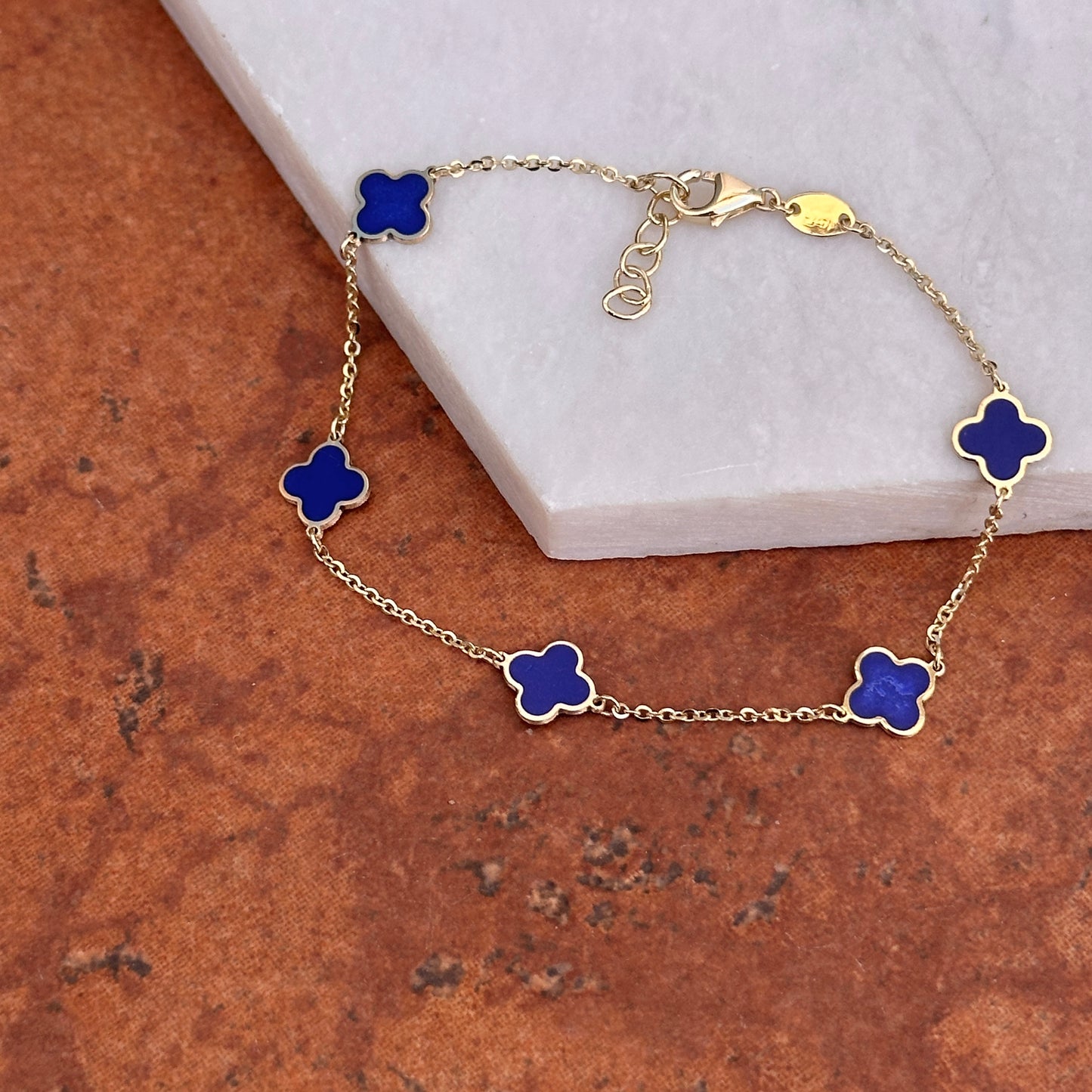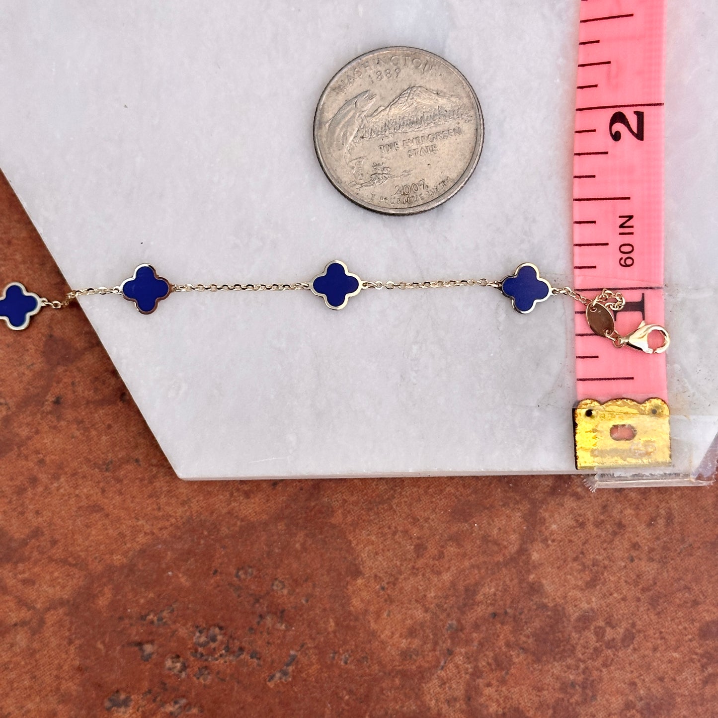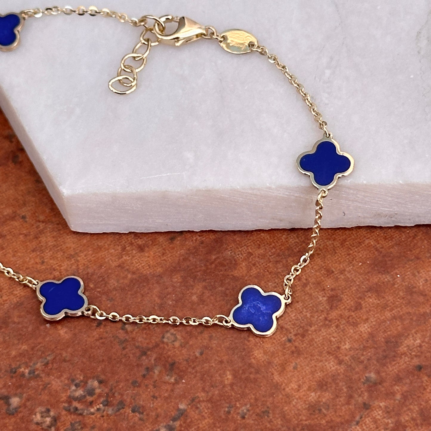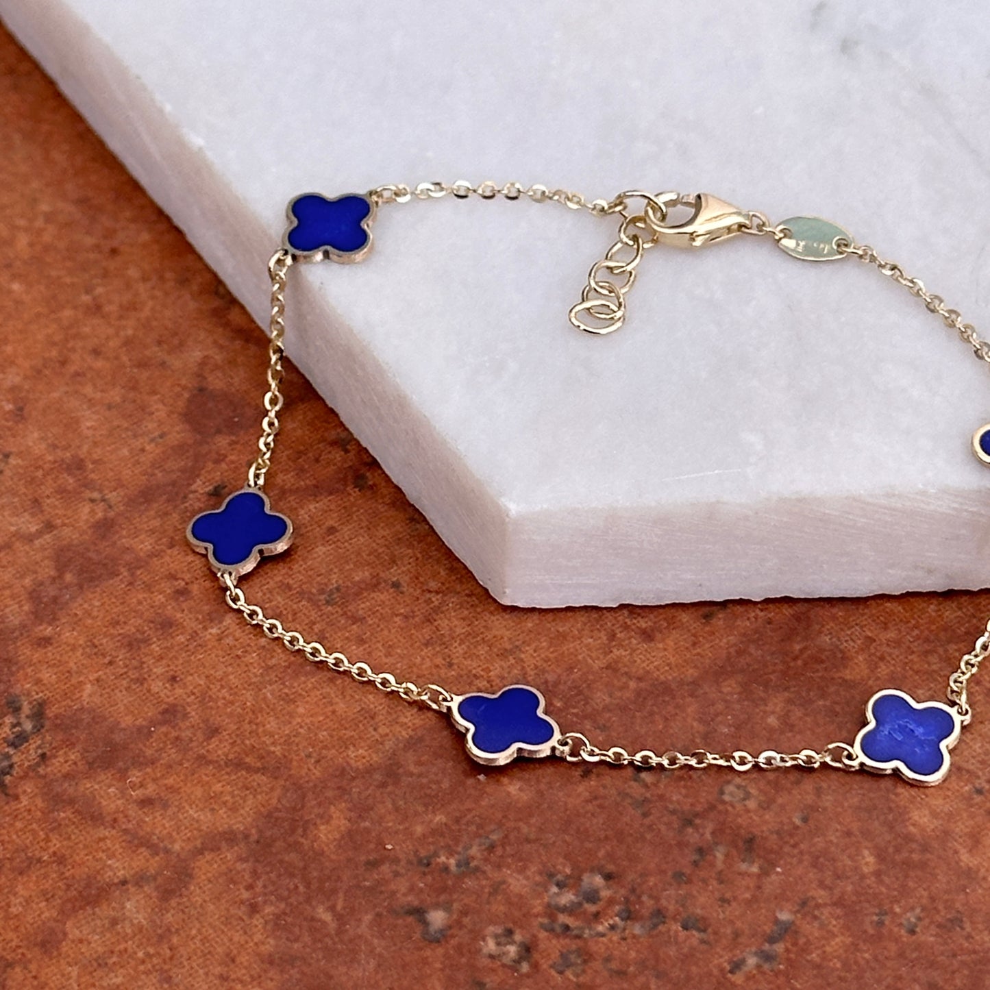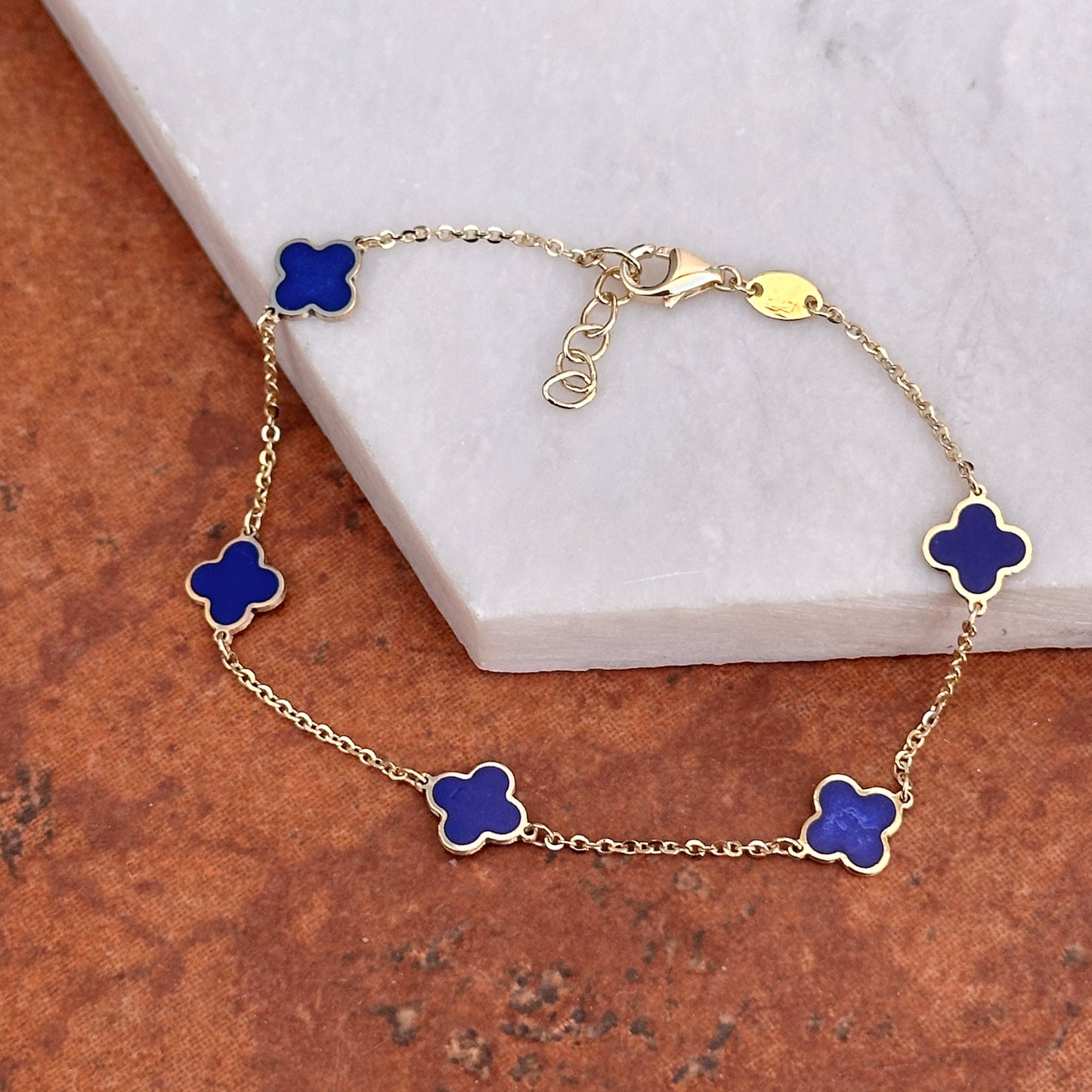 14K yellow gold blue lapis 4 leaf clover station charms thin chain bracelet. Great, minimal gold bracelet for layering!