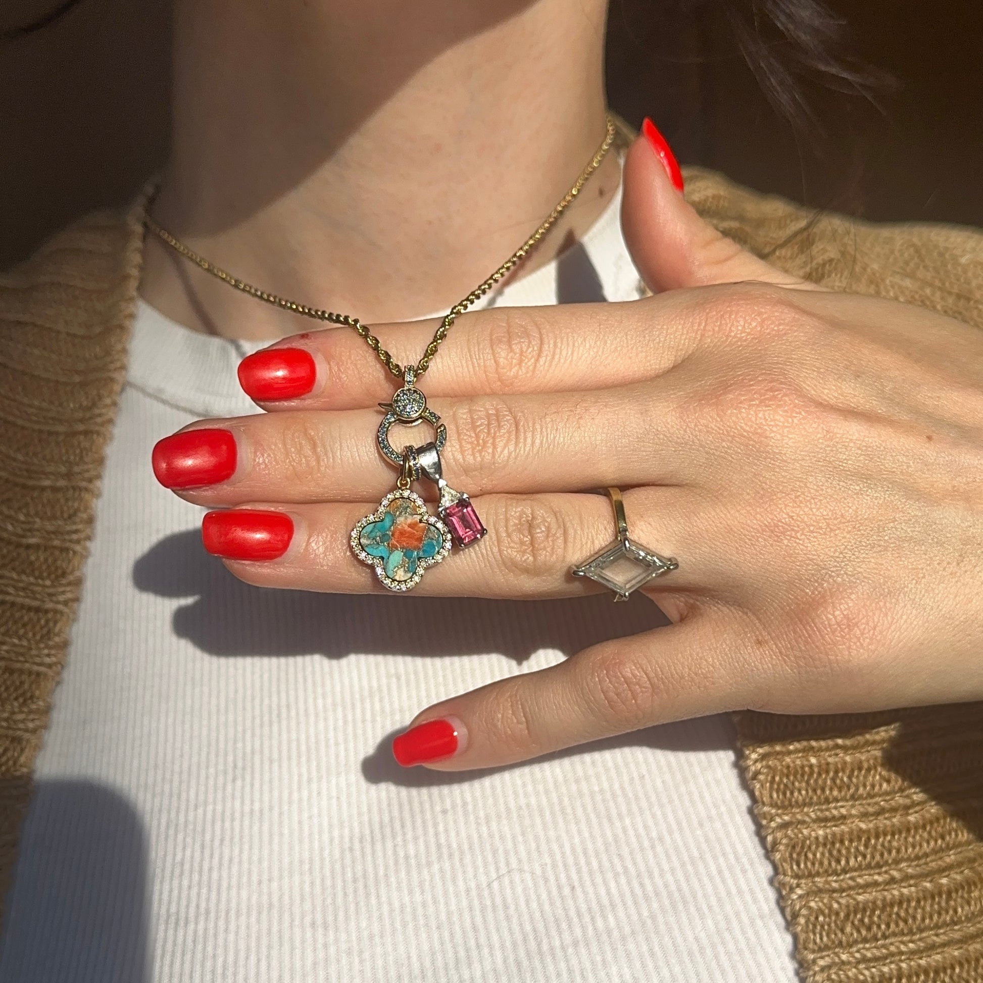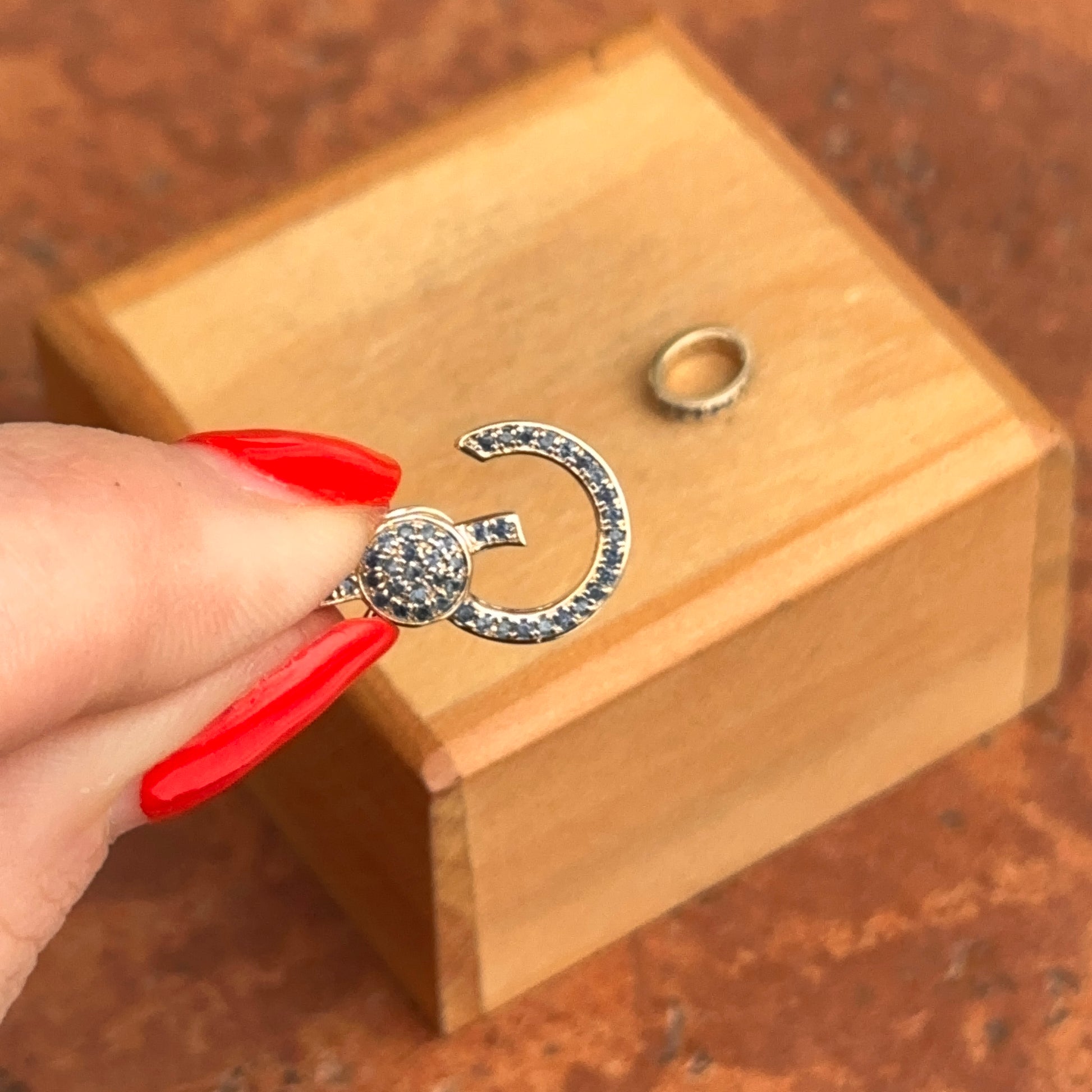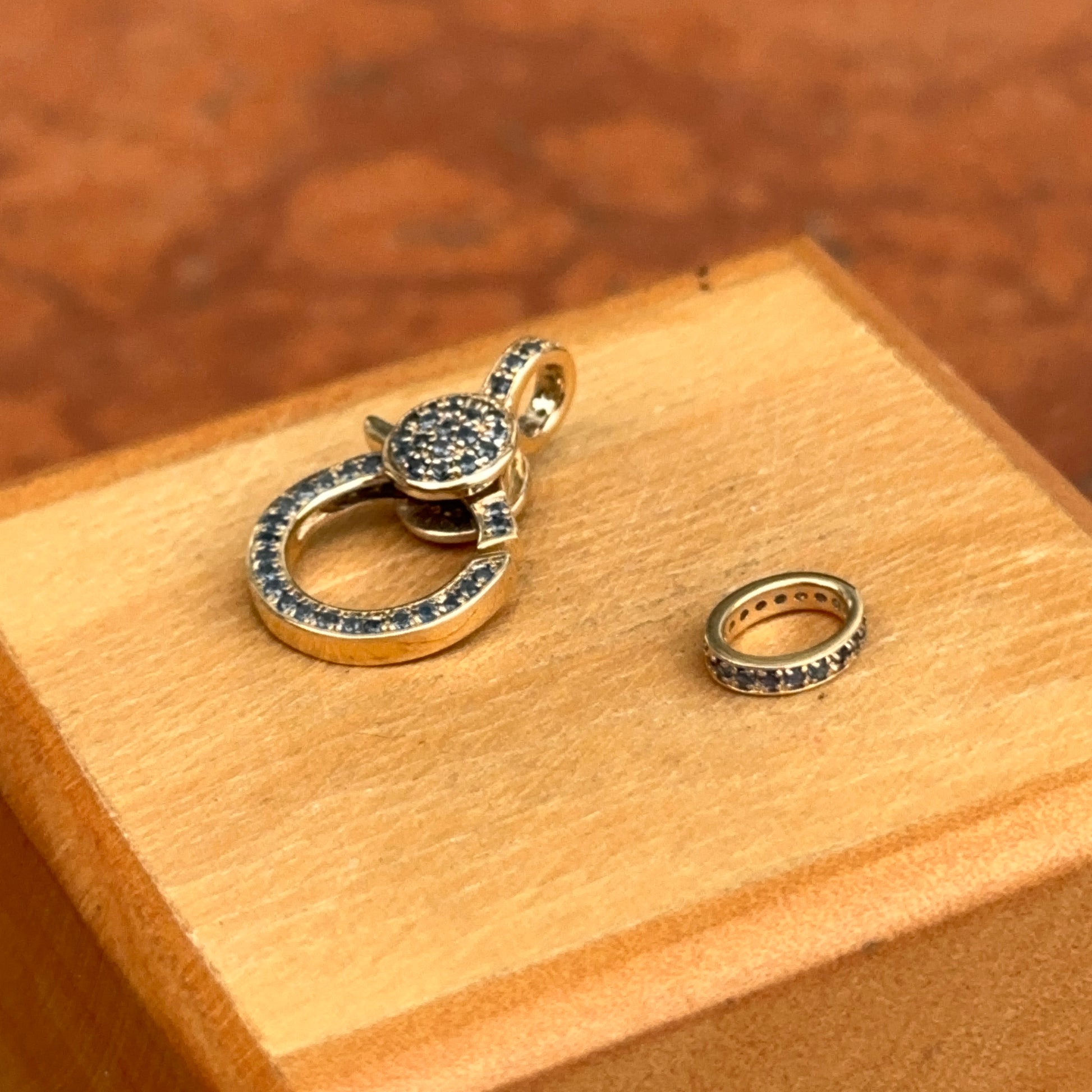 14K yellow gold large lobster lock pendant with pave set blue sapphires. A handy and gorgeous piece- use a pendant holder for all your charms into 1 pendant! This pendant also includes a 14k yellow gold sapphire oval roundel spacer to put in-between pendants!