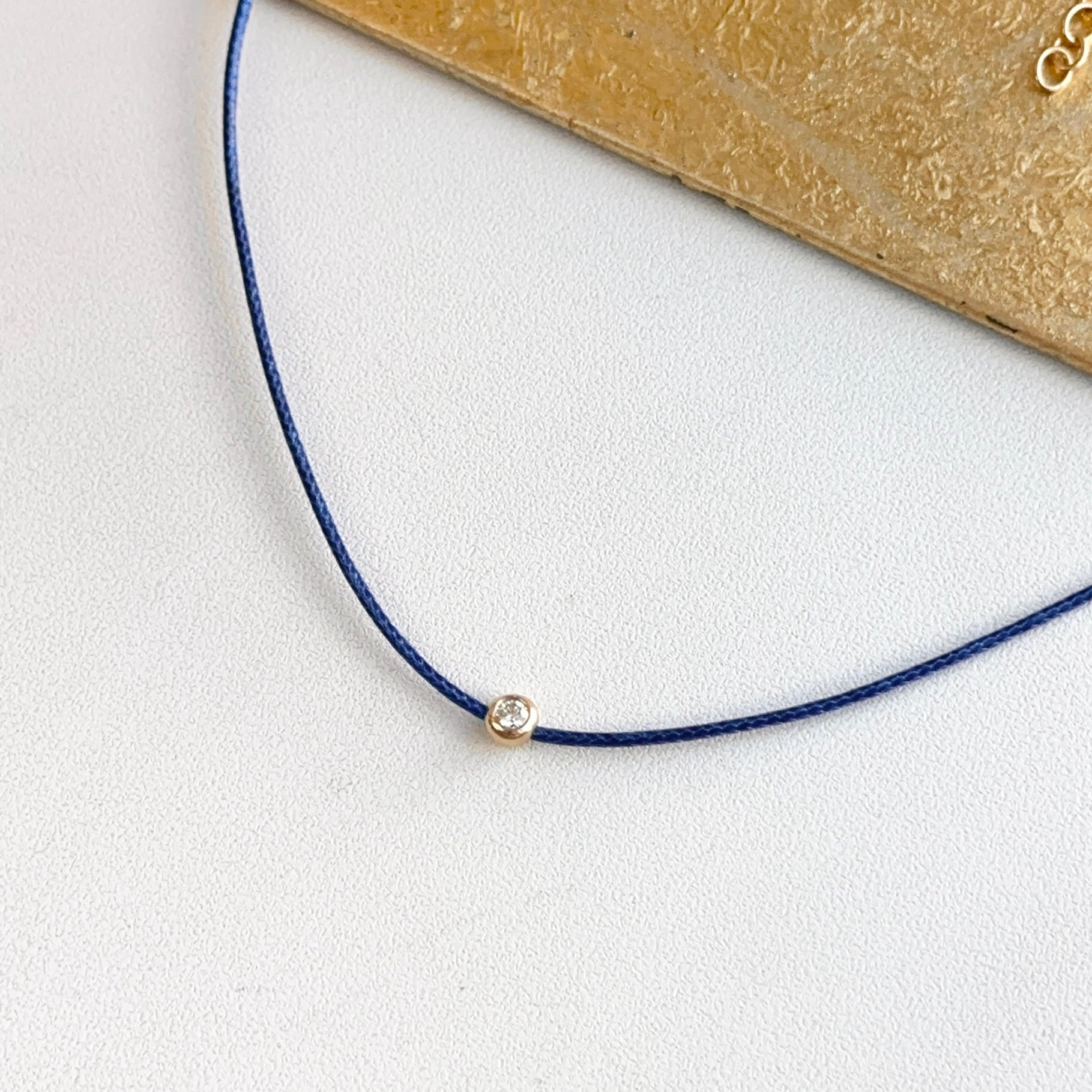 14K Yellow Gold + Blue Silk Cord Necklace with Bezel-Set Diamond Slide Pendant