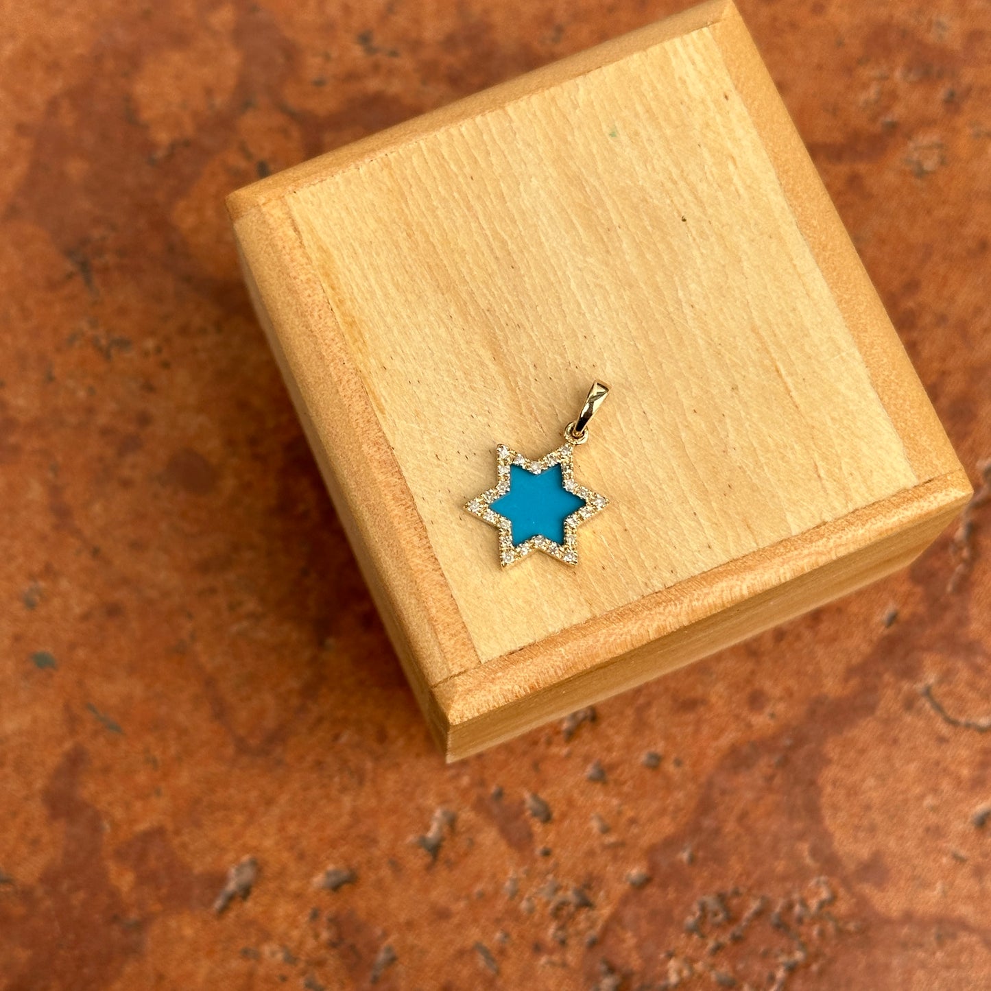 14KT yellow gold blue turquoise + pave diamond outline Star of David pendant charm.
