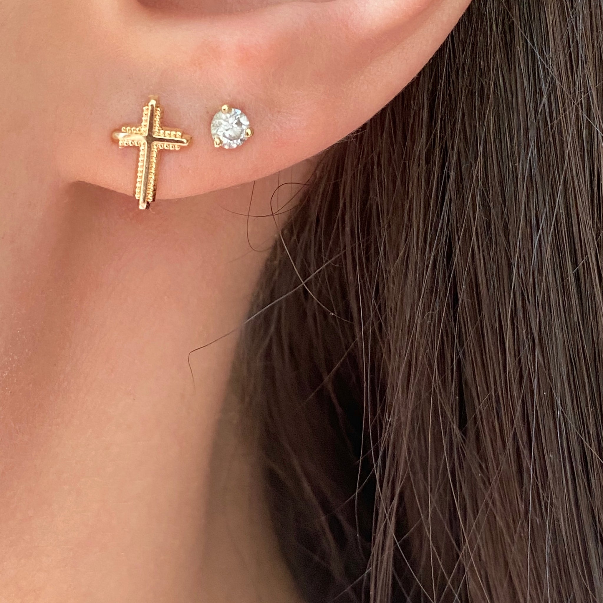 Polished 14KT yellow gold mini cross post stud earrings with bubbled, texture. Pretty, lightweight cross studs ideal for children or someone looking for a minimal stud.