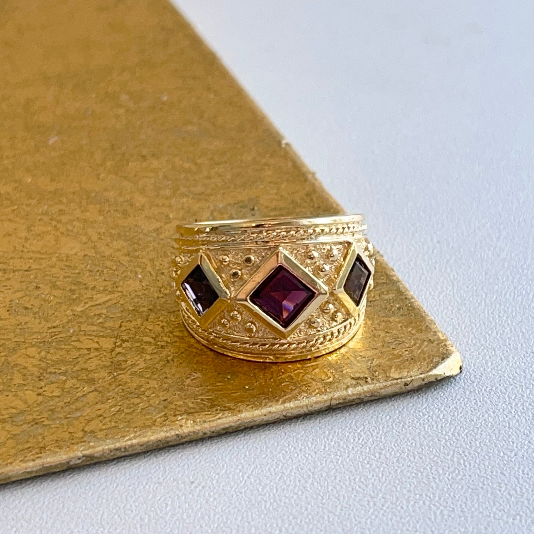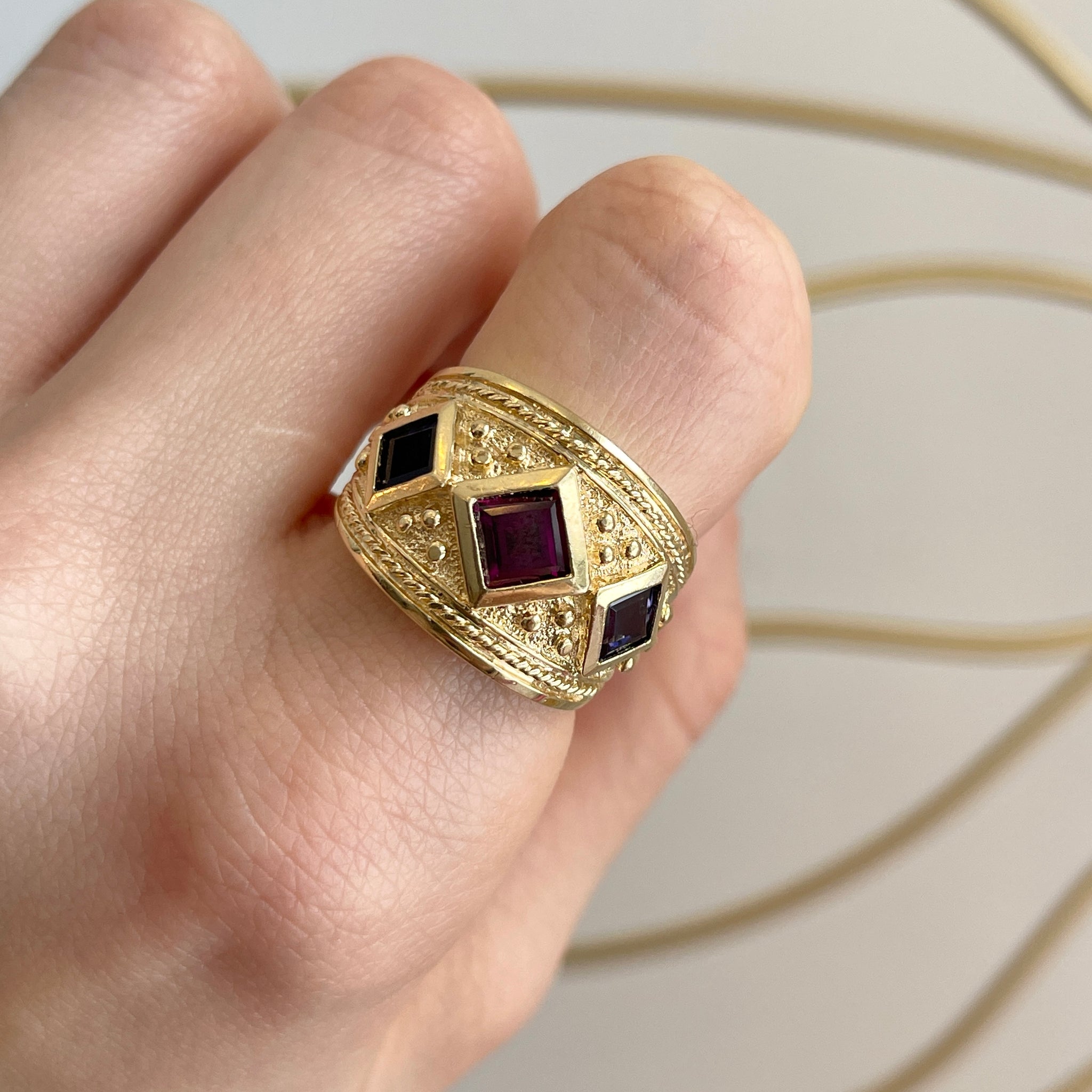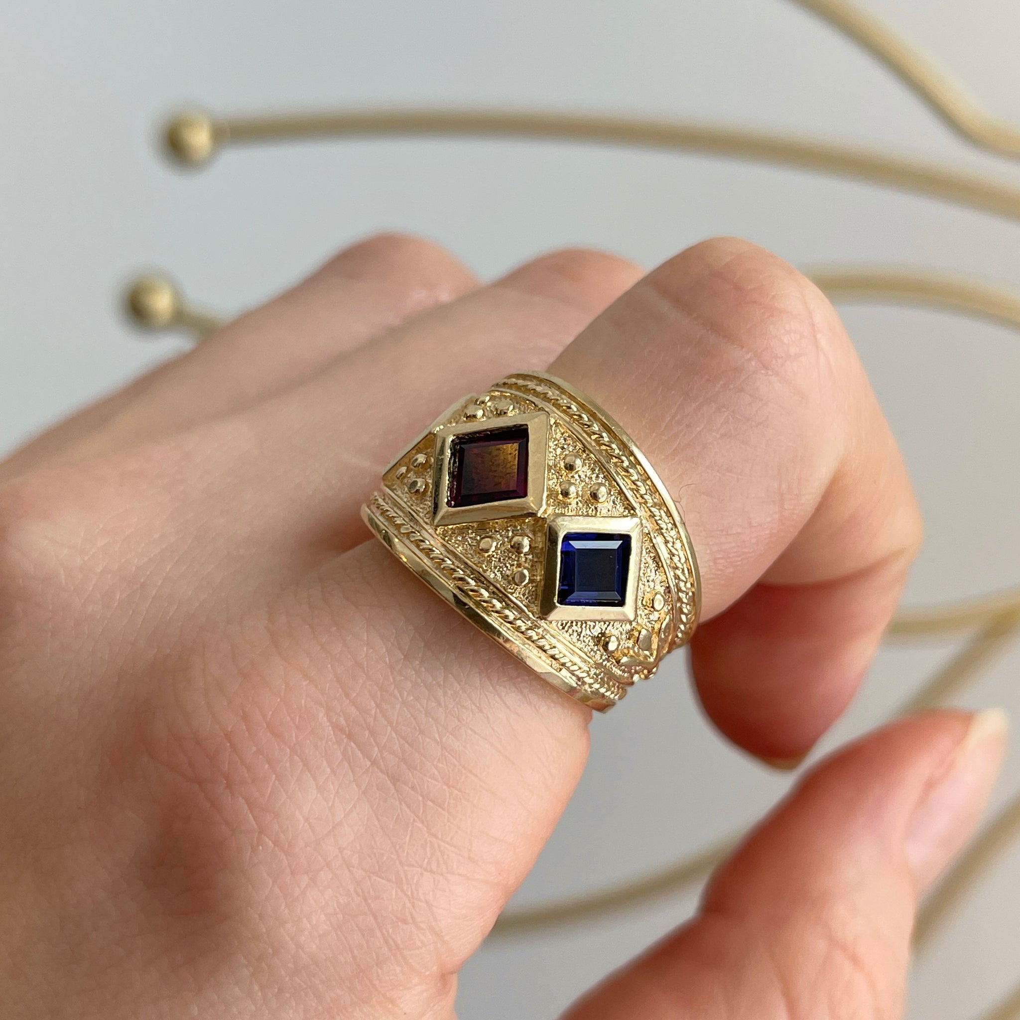 14KT yellow gold Byzantine/ Etruscan design, textured matte-finish, artistic, cigar band ring with genuine, square amethyst + blue Iolite gemstones. New and can be customized (additional fees apply).