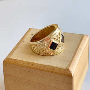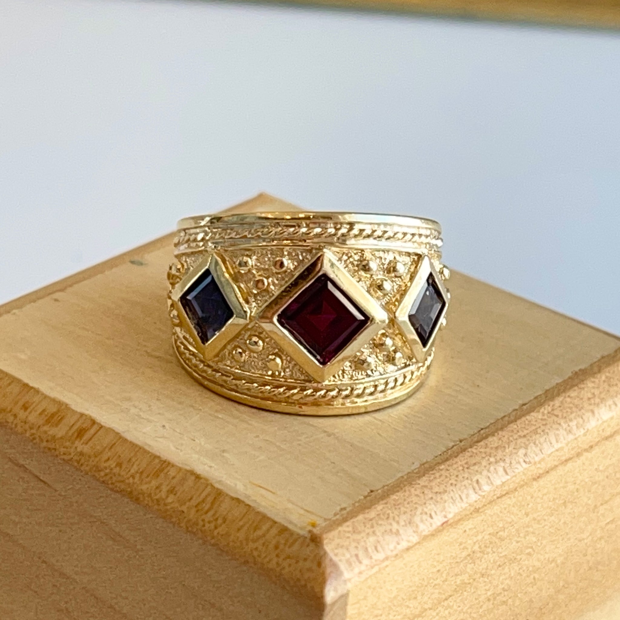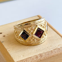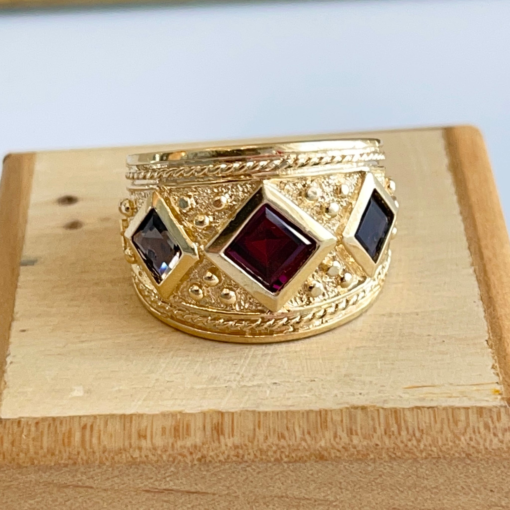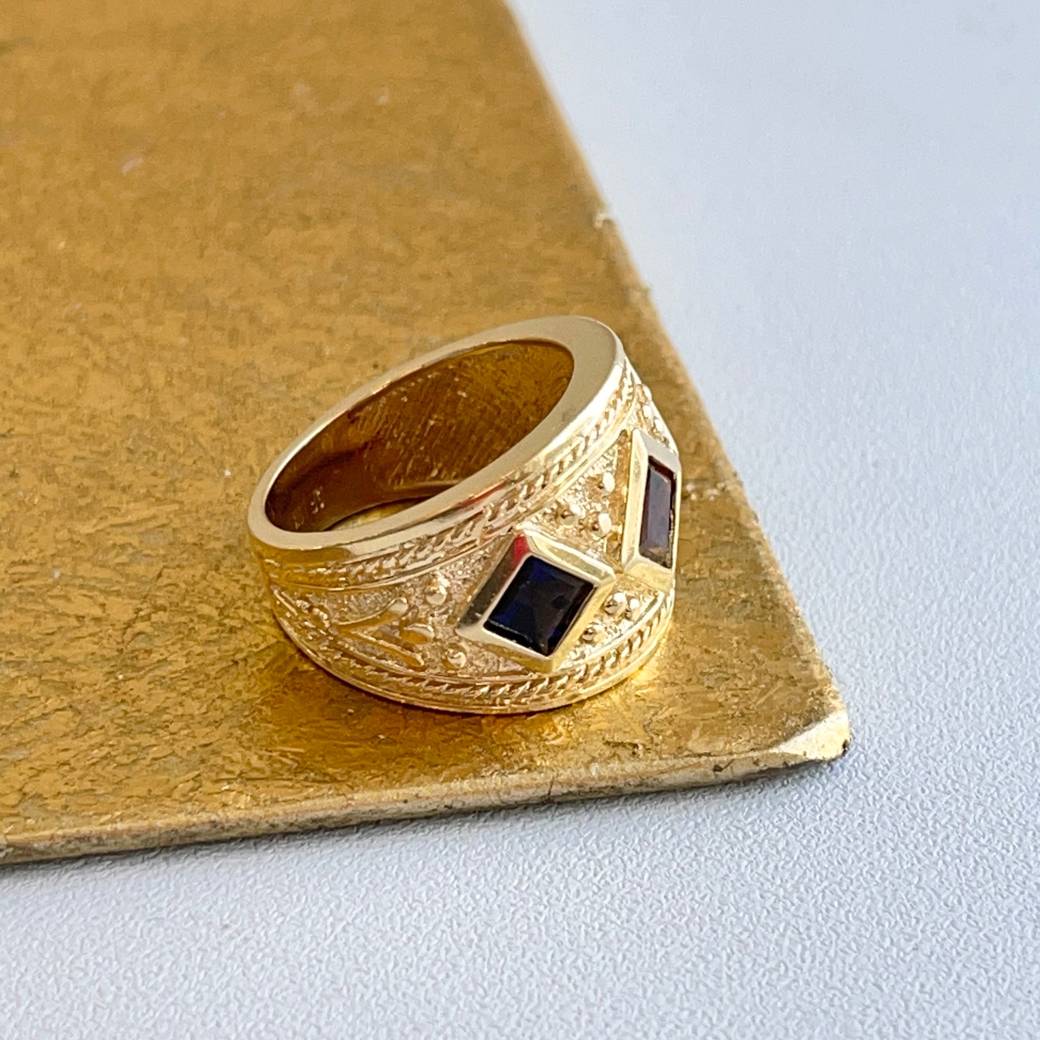 14KT yellow gold Byzantine/ Etruscan design, textured matte-finish, artistic, cigar band ring with genuine, square amethyst + blue Iolite gemstones. New and can be customized (additional fees apply).