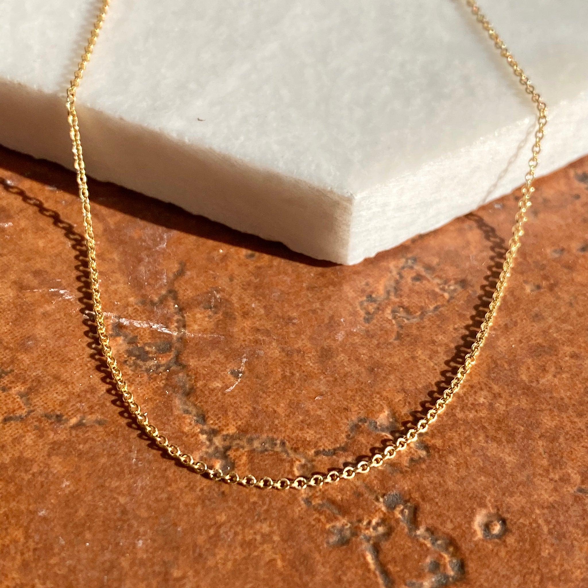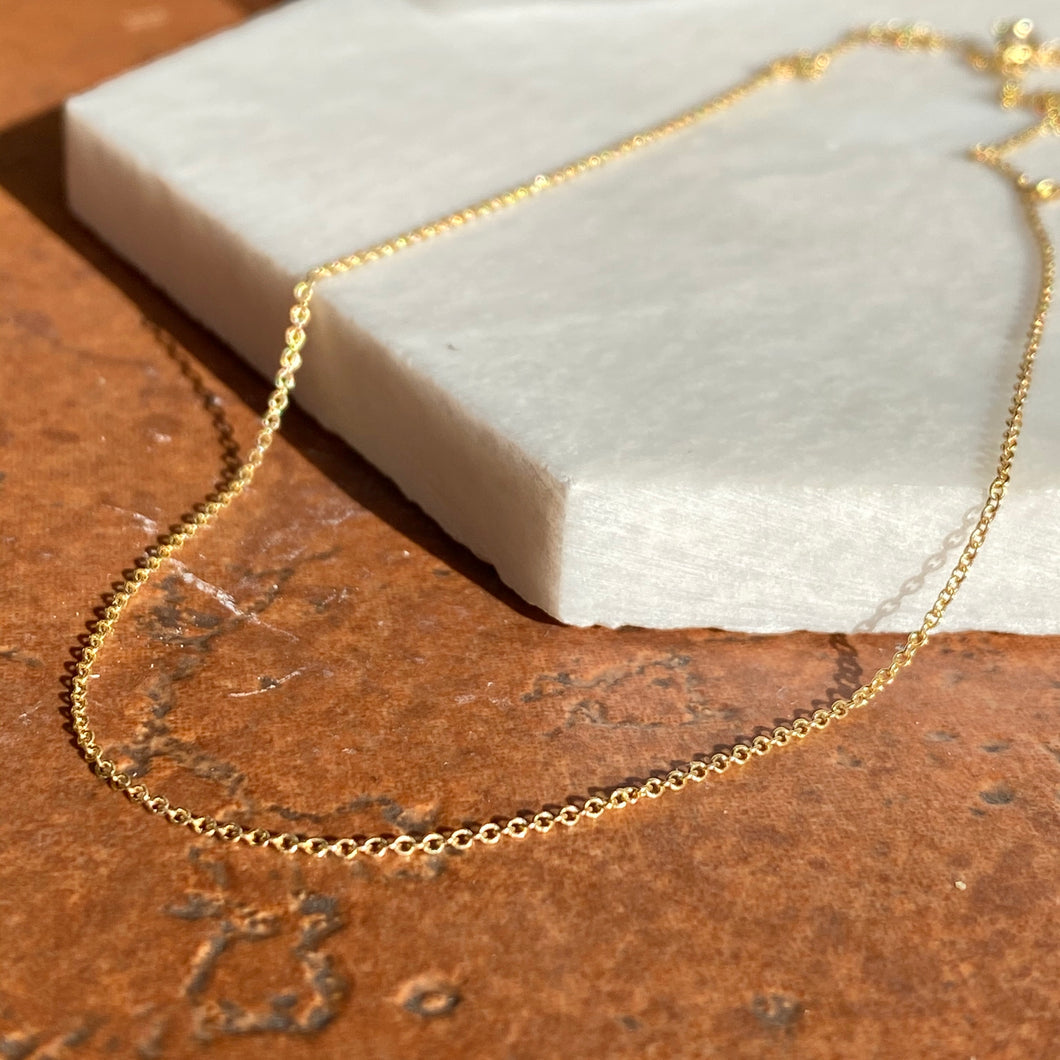 14KT yellow gold cable chain necklace. The perfect, everyday gold chain necklace great for adding on pendants to.