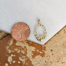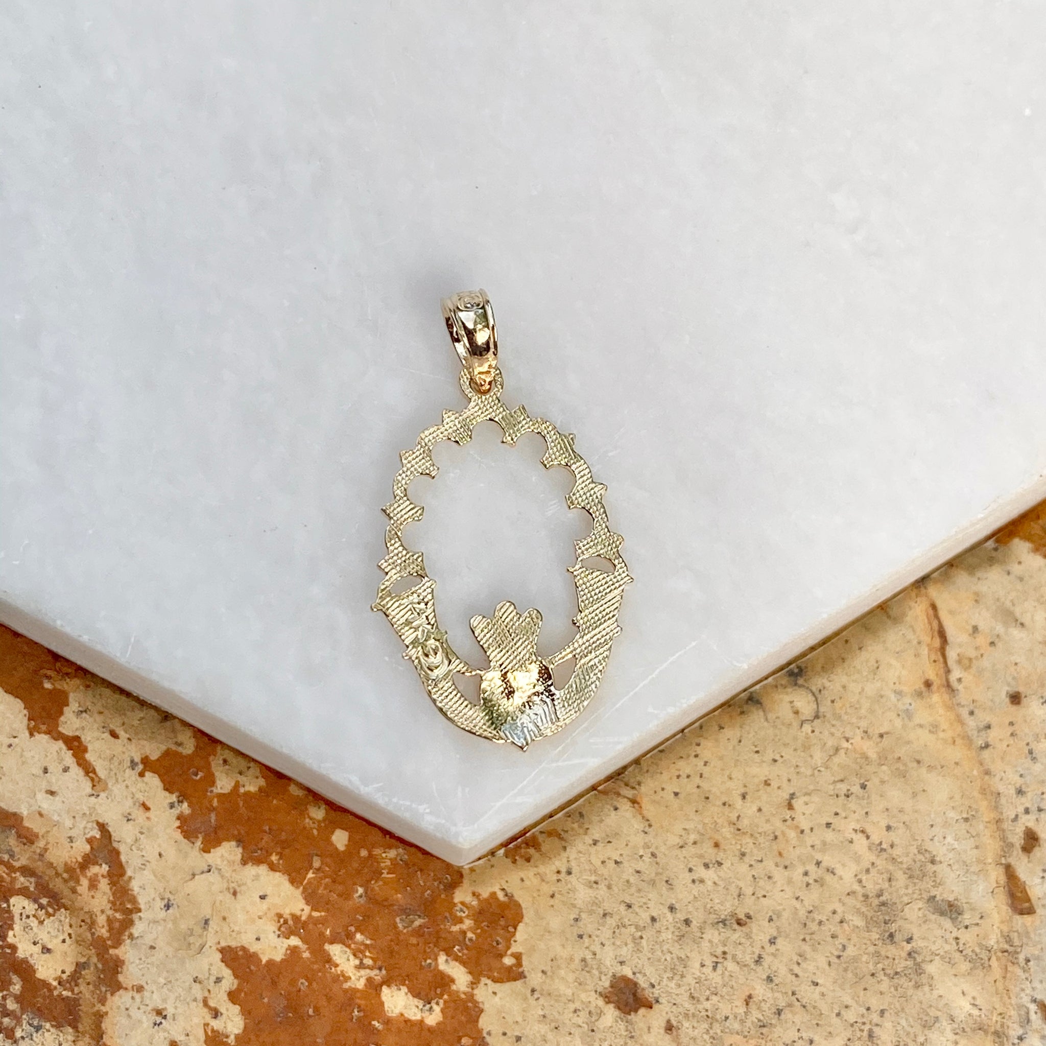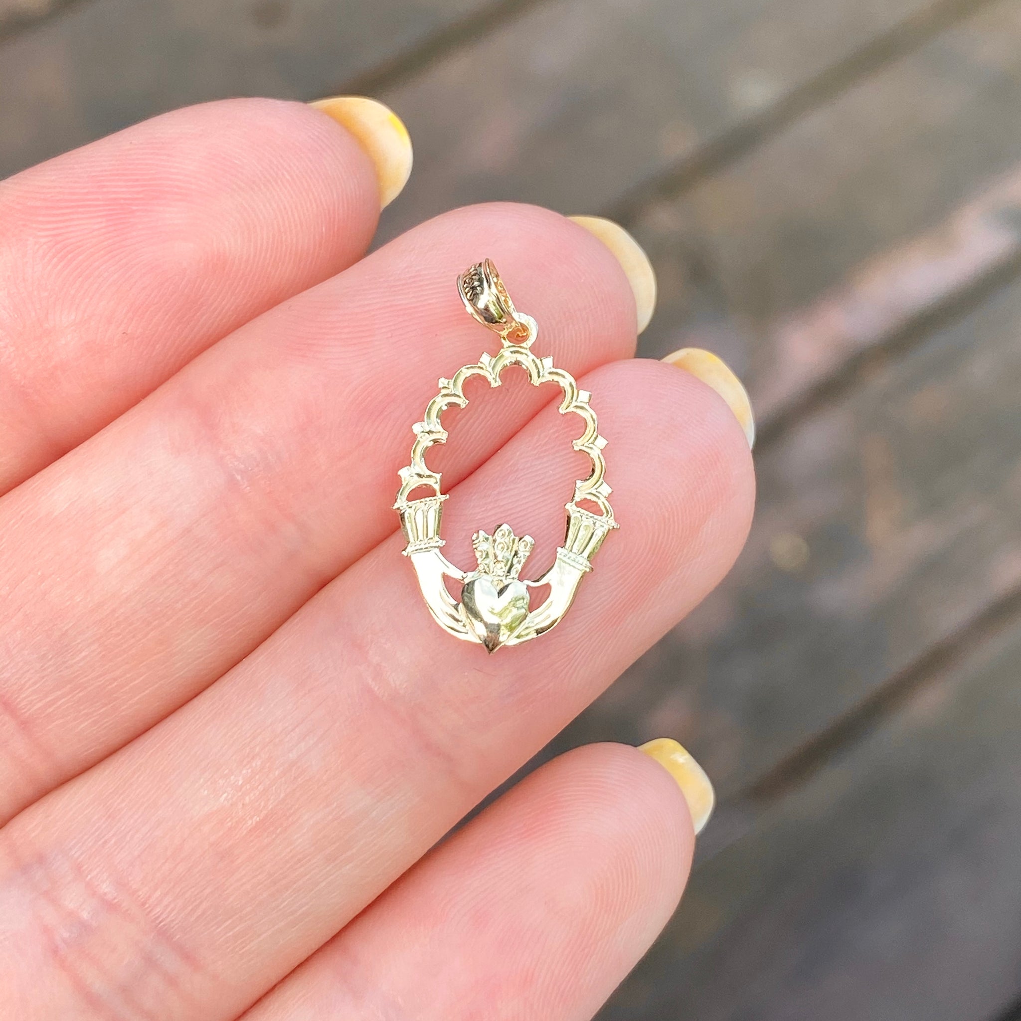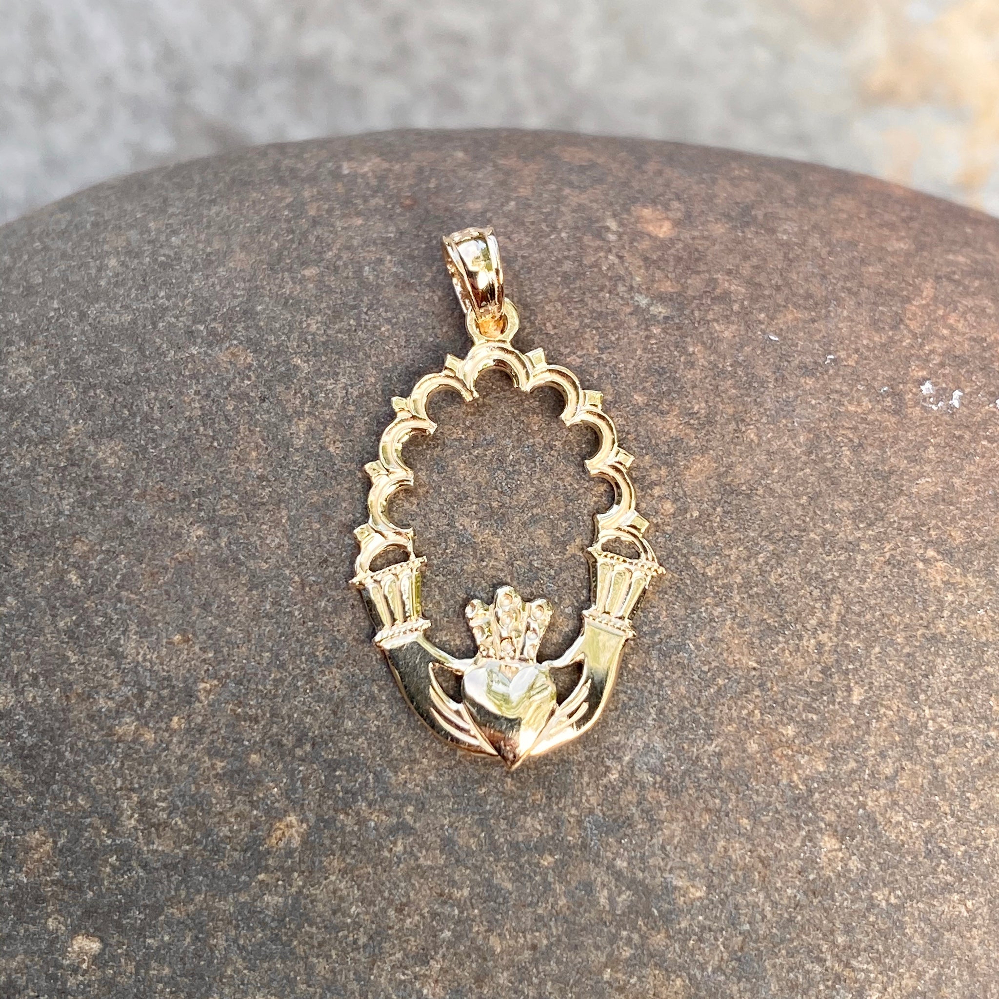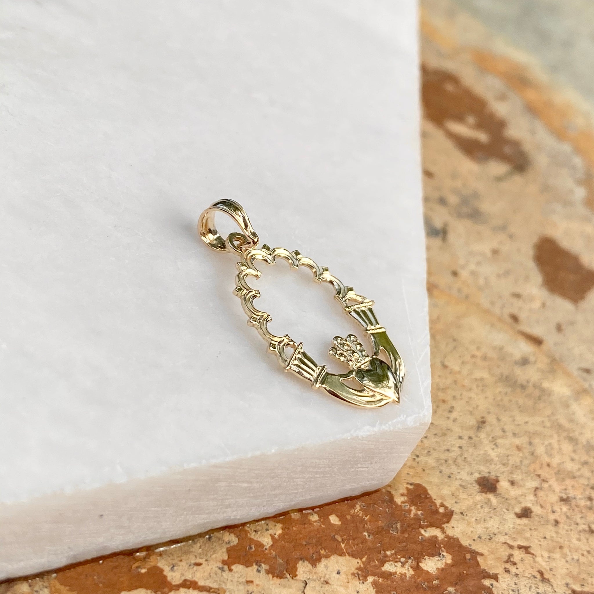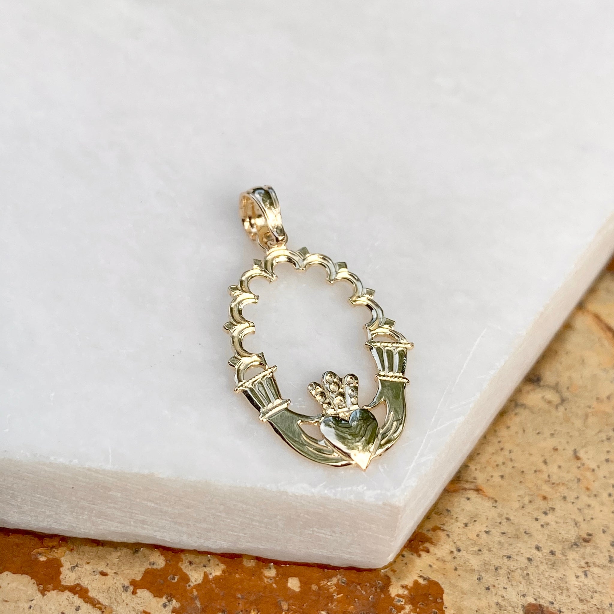 Polished 14KT yellow gold Celtic Claddagh with lace trim oval, open pendant charm. The Claddagh meaning is all about love, loyalty, and friendship. The two hands represent friendship, a heart symbolizes love and the crown on top is for loyalty.
