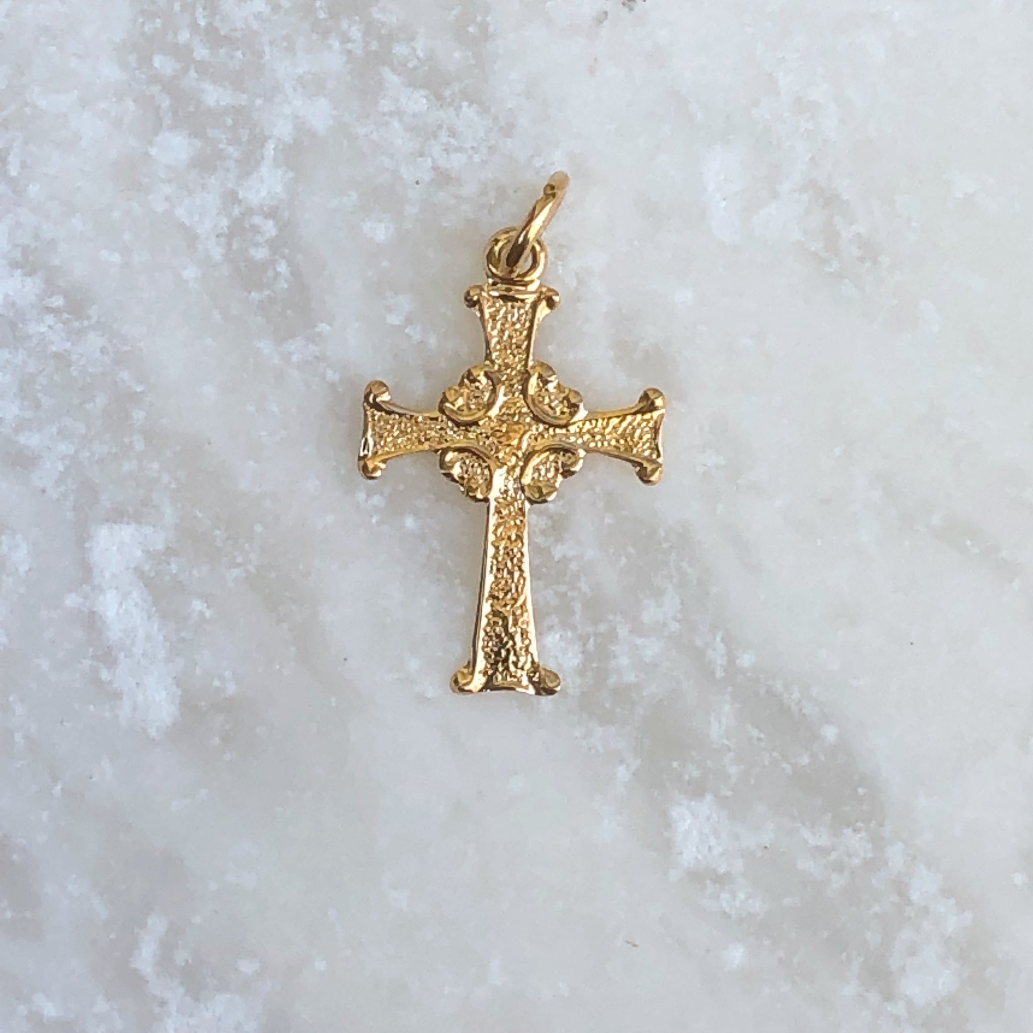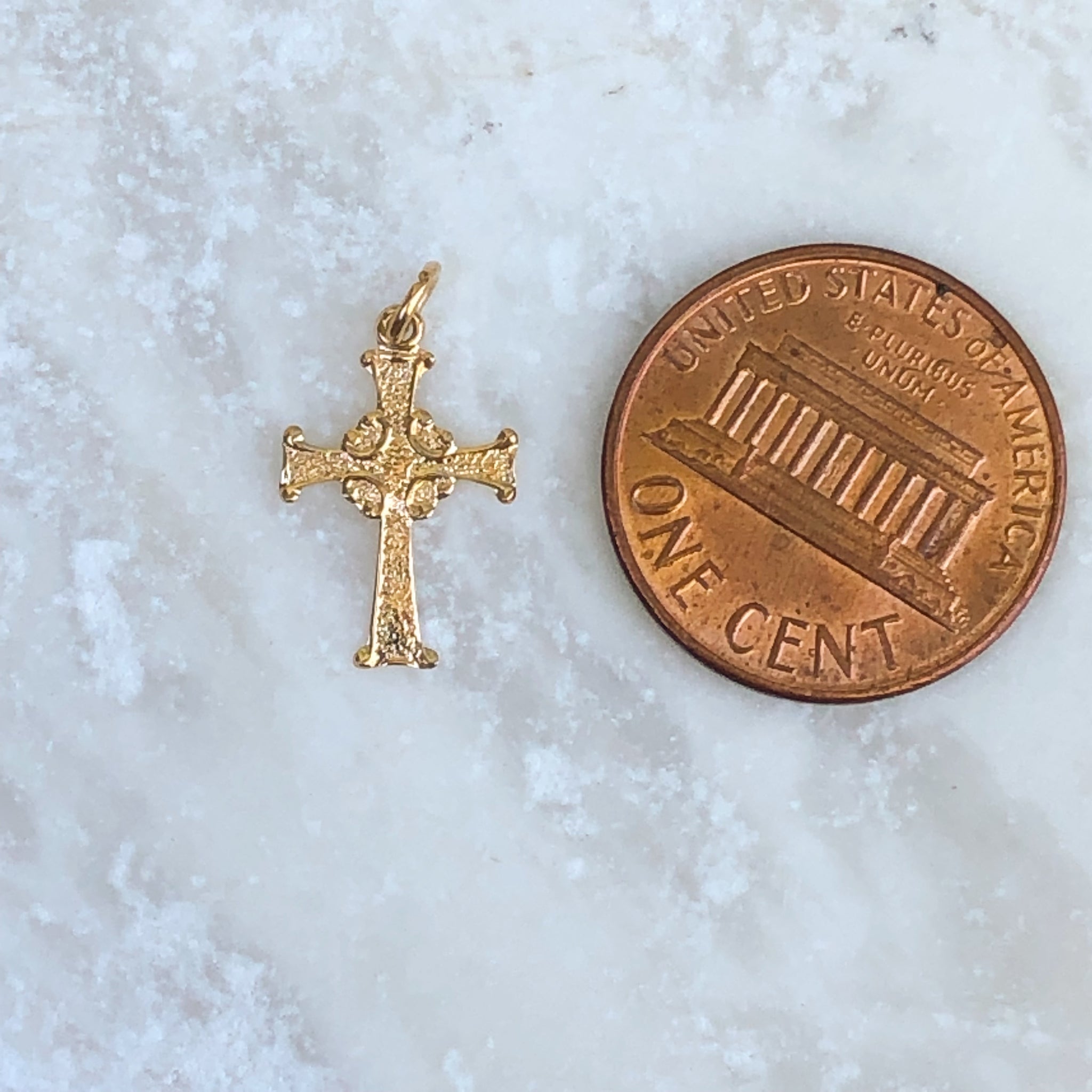 14KT yellow gold solid, polished, small Celtic Irish/Scottish cross pendant charm. Wear alone on a necklace chain or add onto a charm bracelet! Chain sold separately.