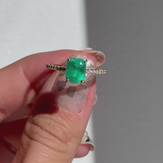 14KT Yellow Gold Colombian Emerald-Cut Emerald + Diamond Hidden Halo Ring