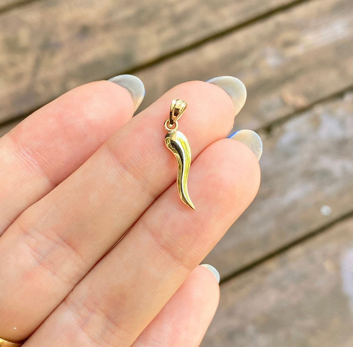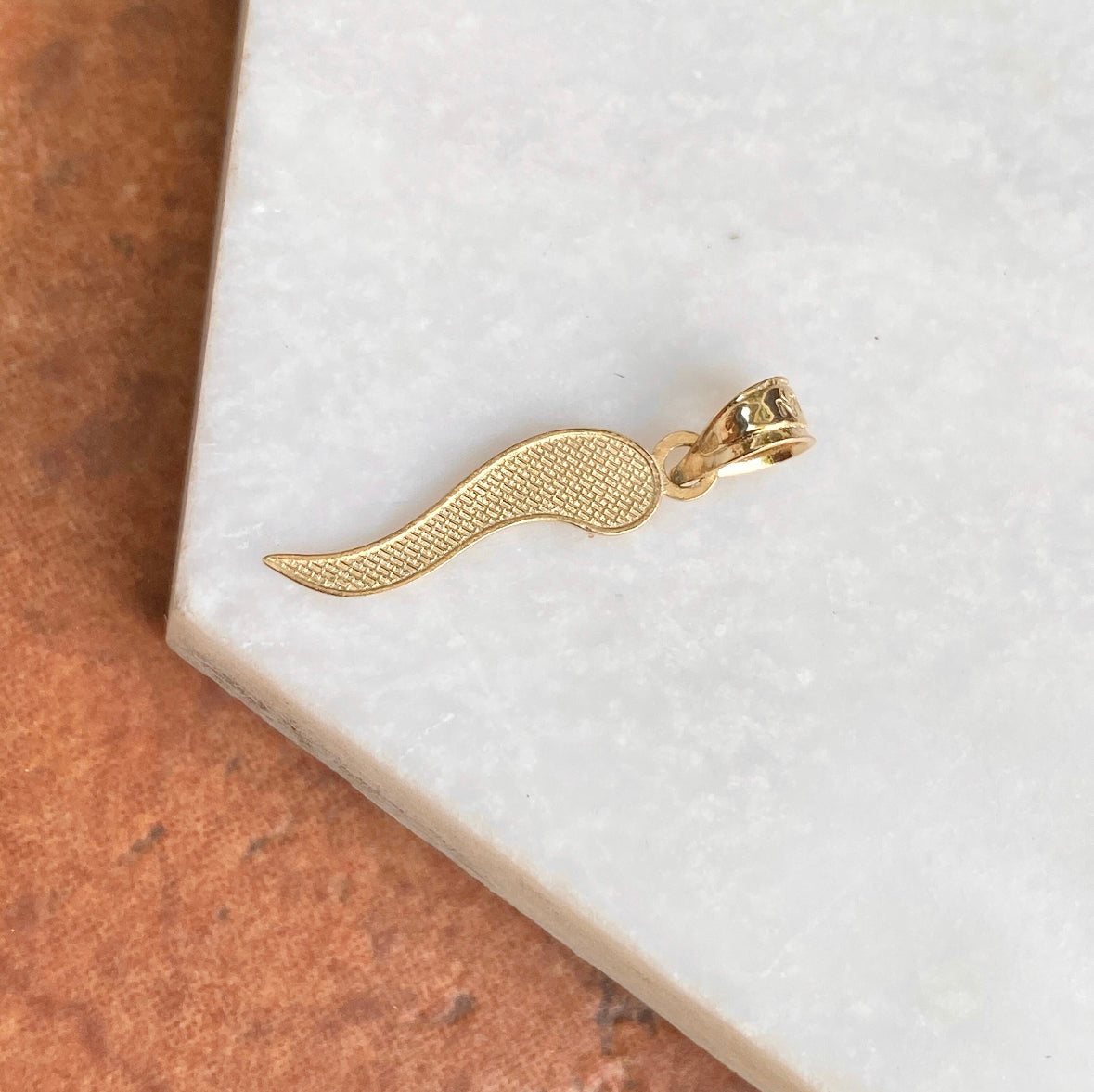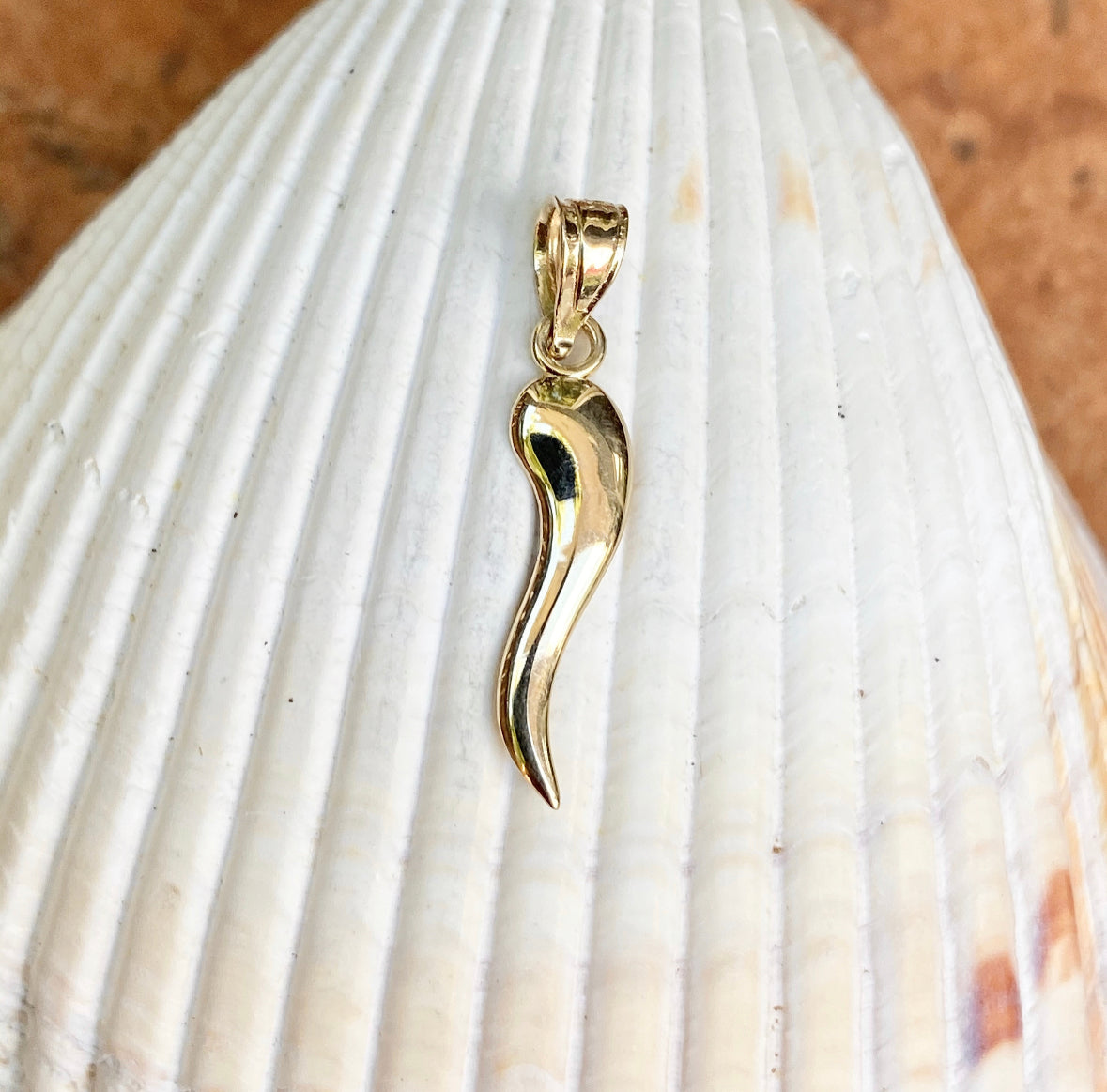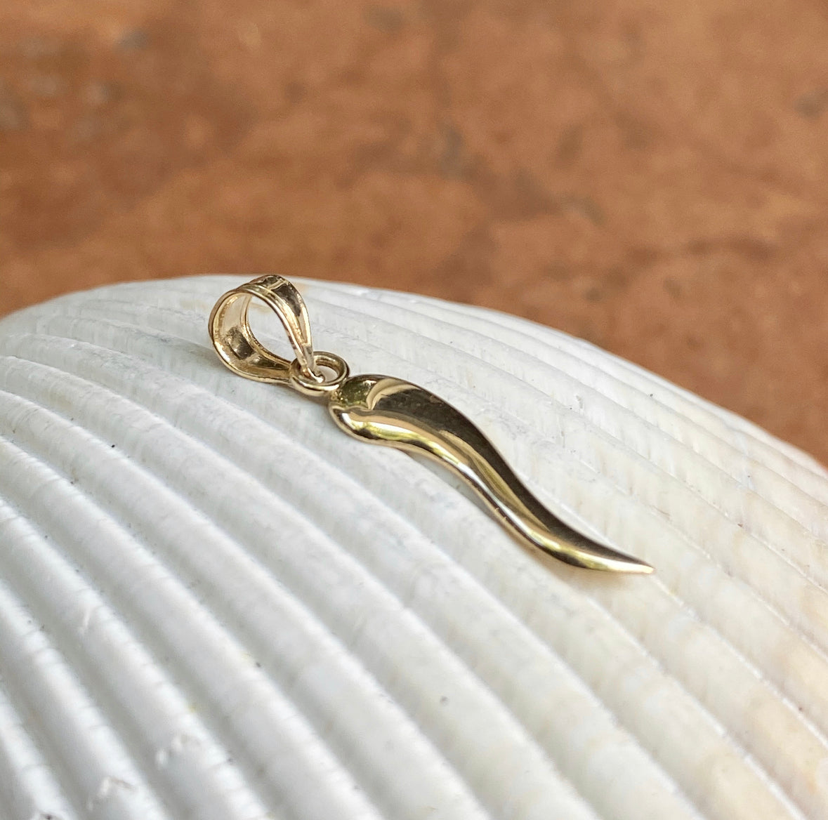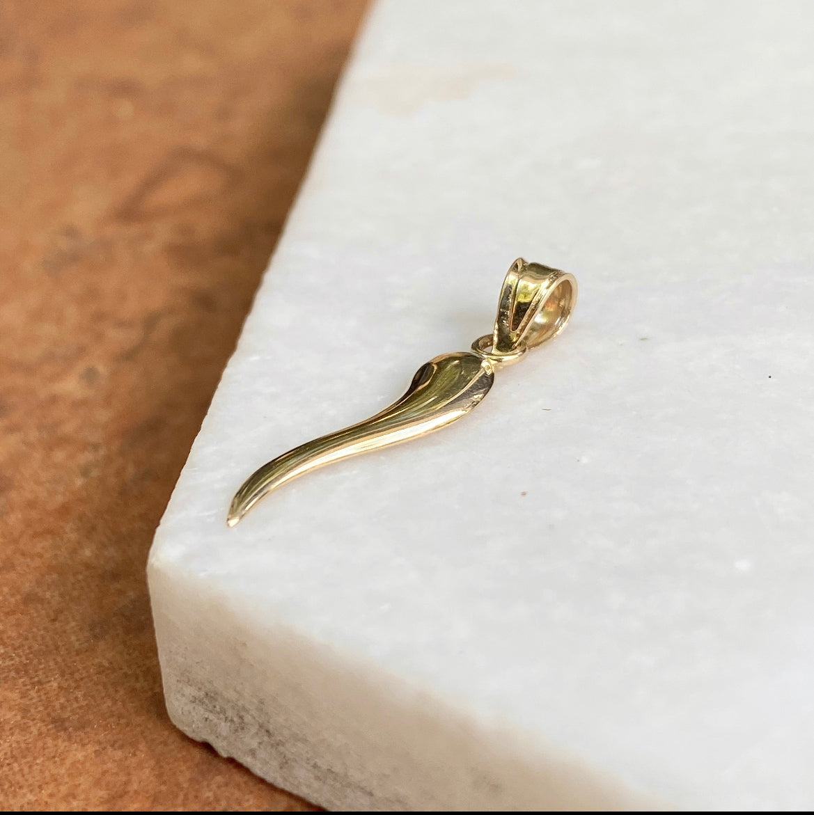 14KT yellow gold polished-finished Italian Horn pendant charm. Called the "Cornicello" Italian meaning, little horn, is a symbol often worn to protect against evil spirits.