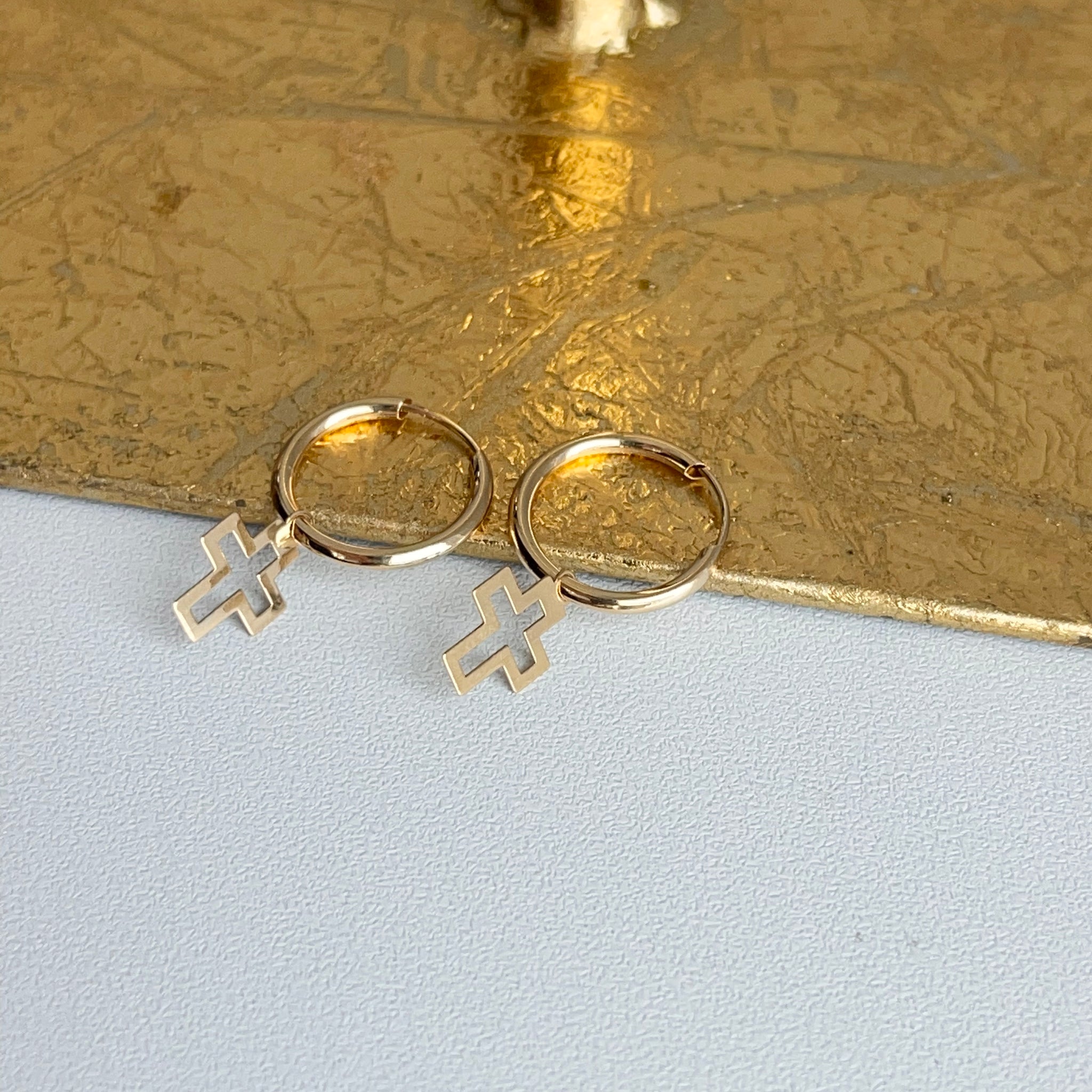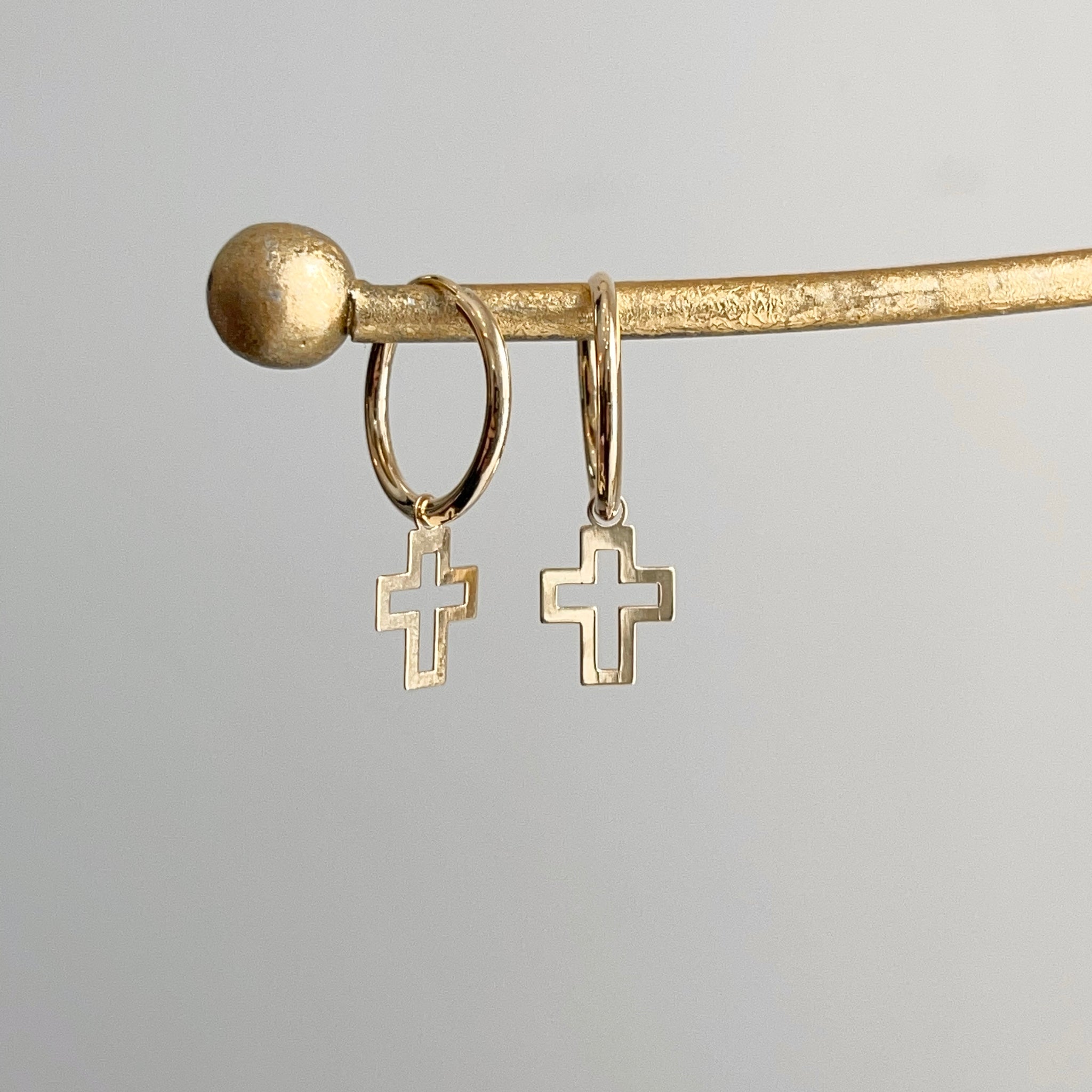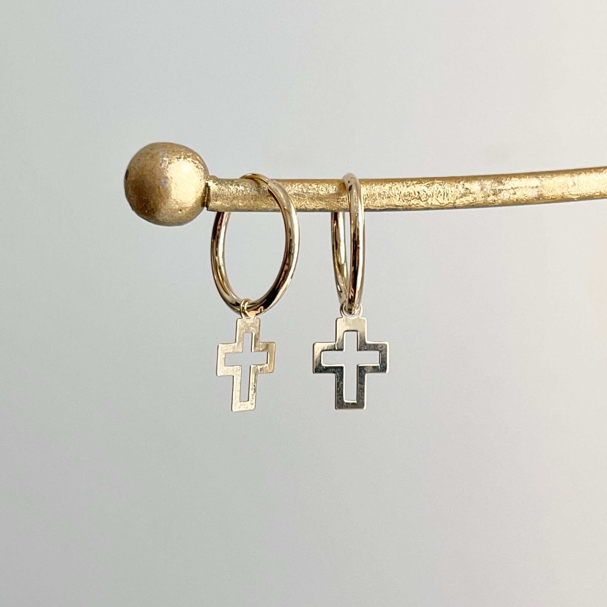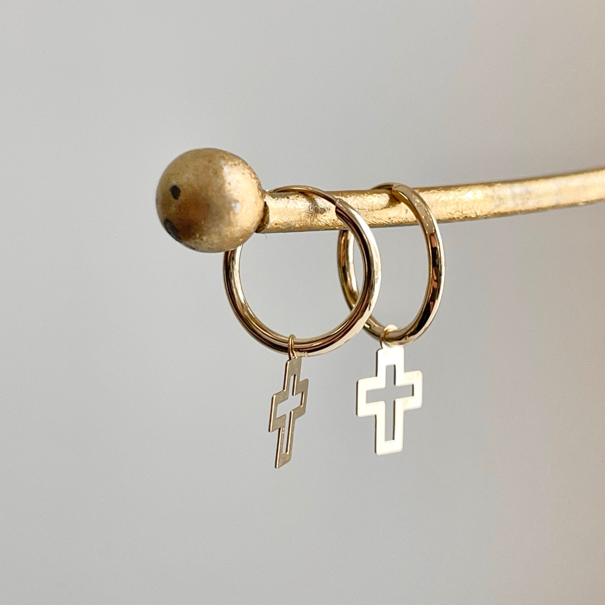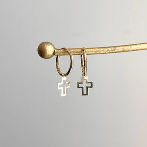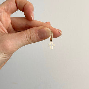 14KT yellow gold endless hoop earrings with cut-out cross charms. Cross charms slide along the hoop earrings + you can take the charms off and put on other hoops as well!