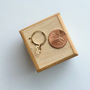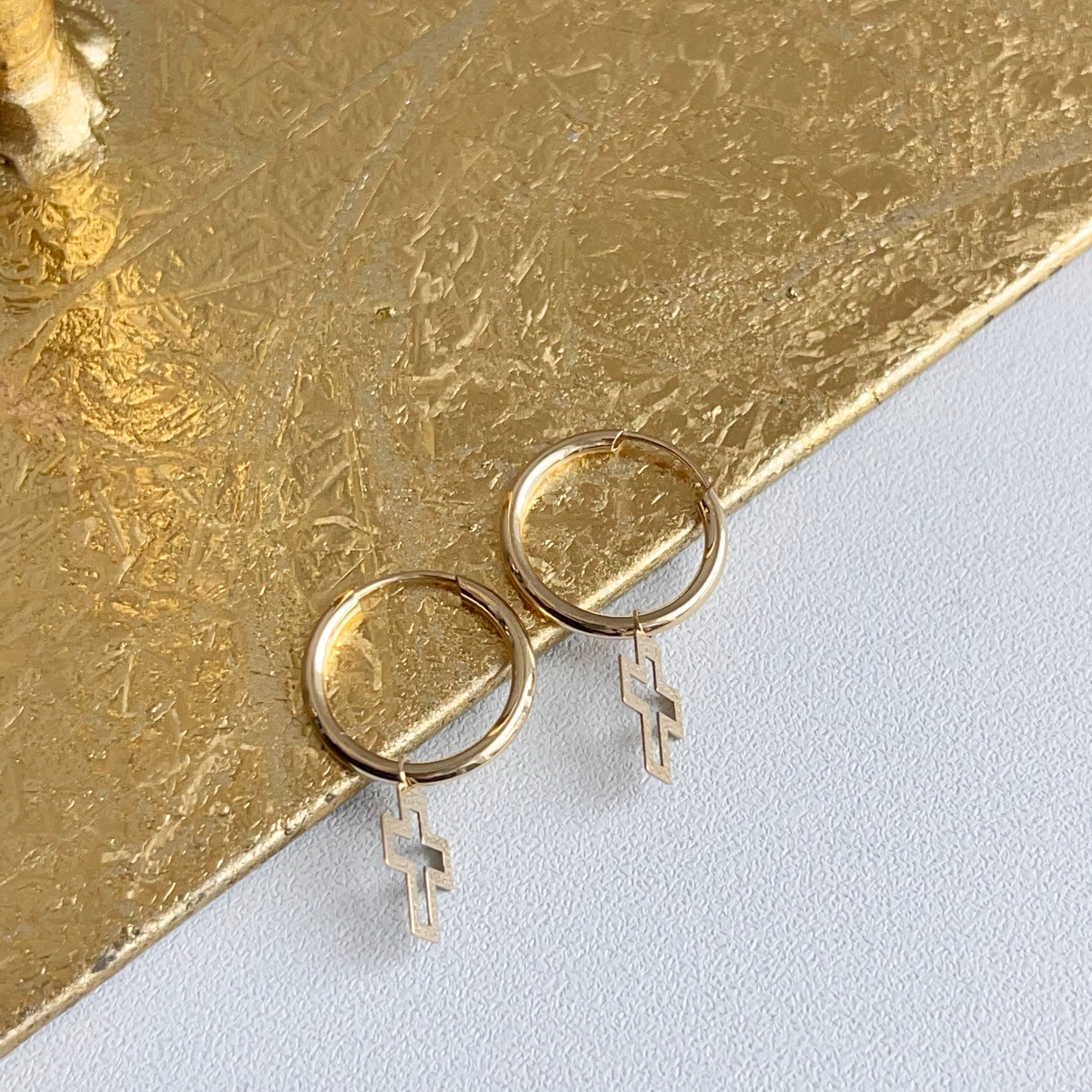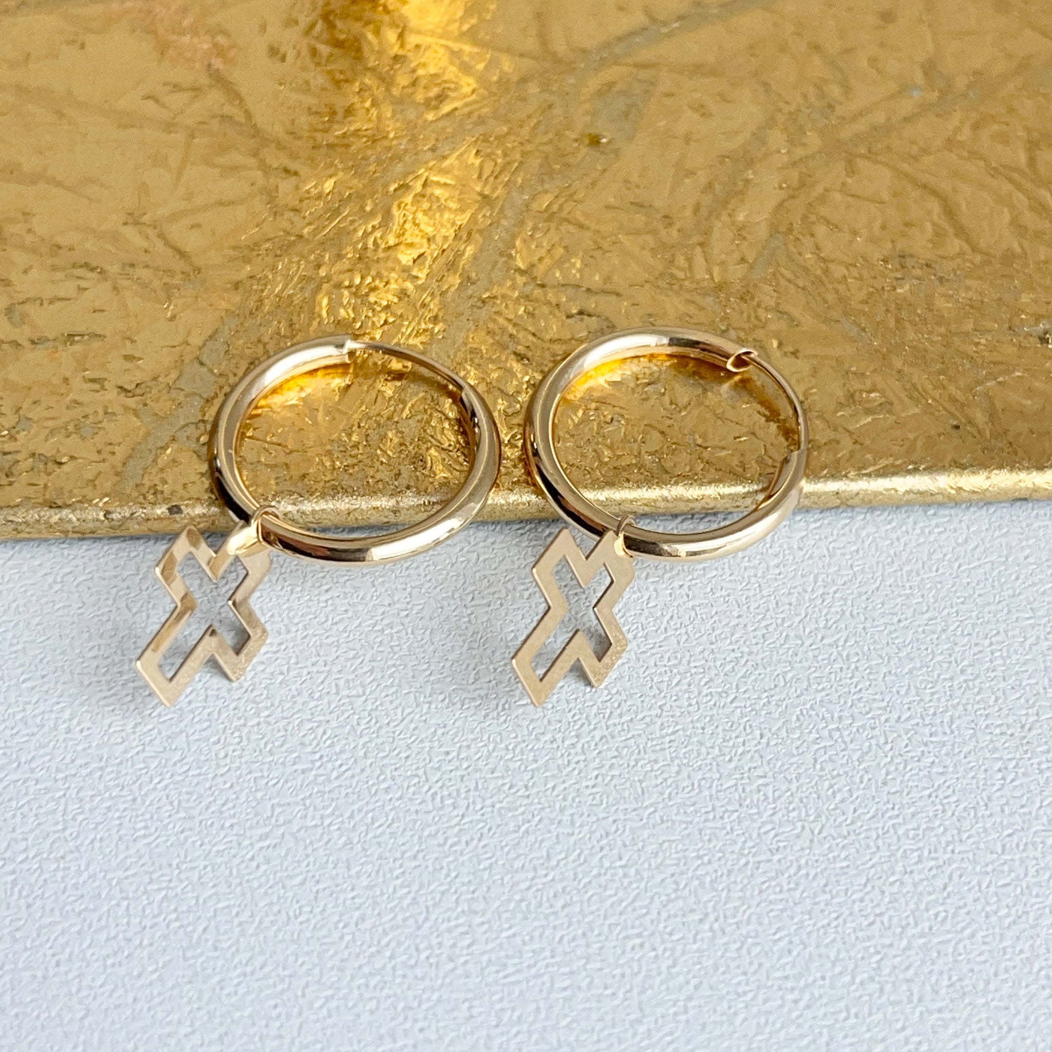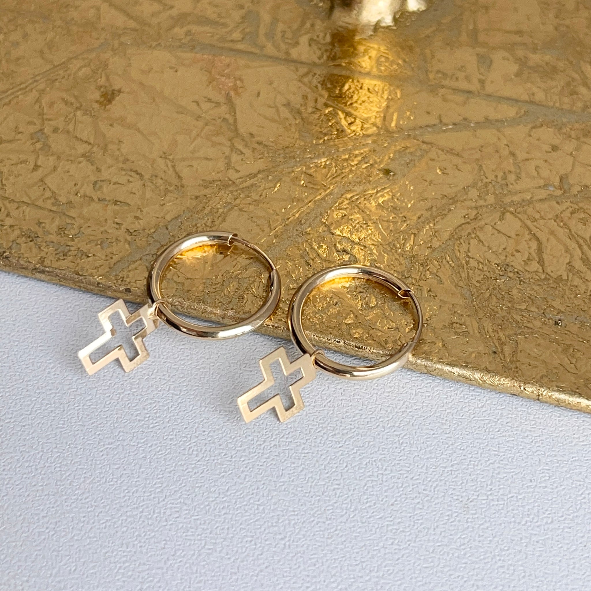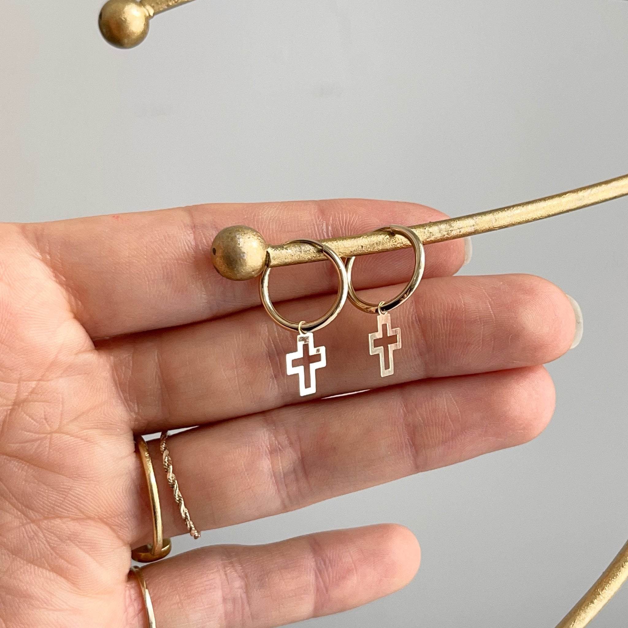 14KT yellow gold endless hoop earrings with cut-out cross charms. Cross charms slide along the hoop earrings + you can take the charms off and put on other hoops as well!
