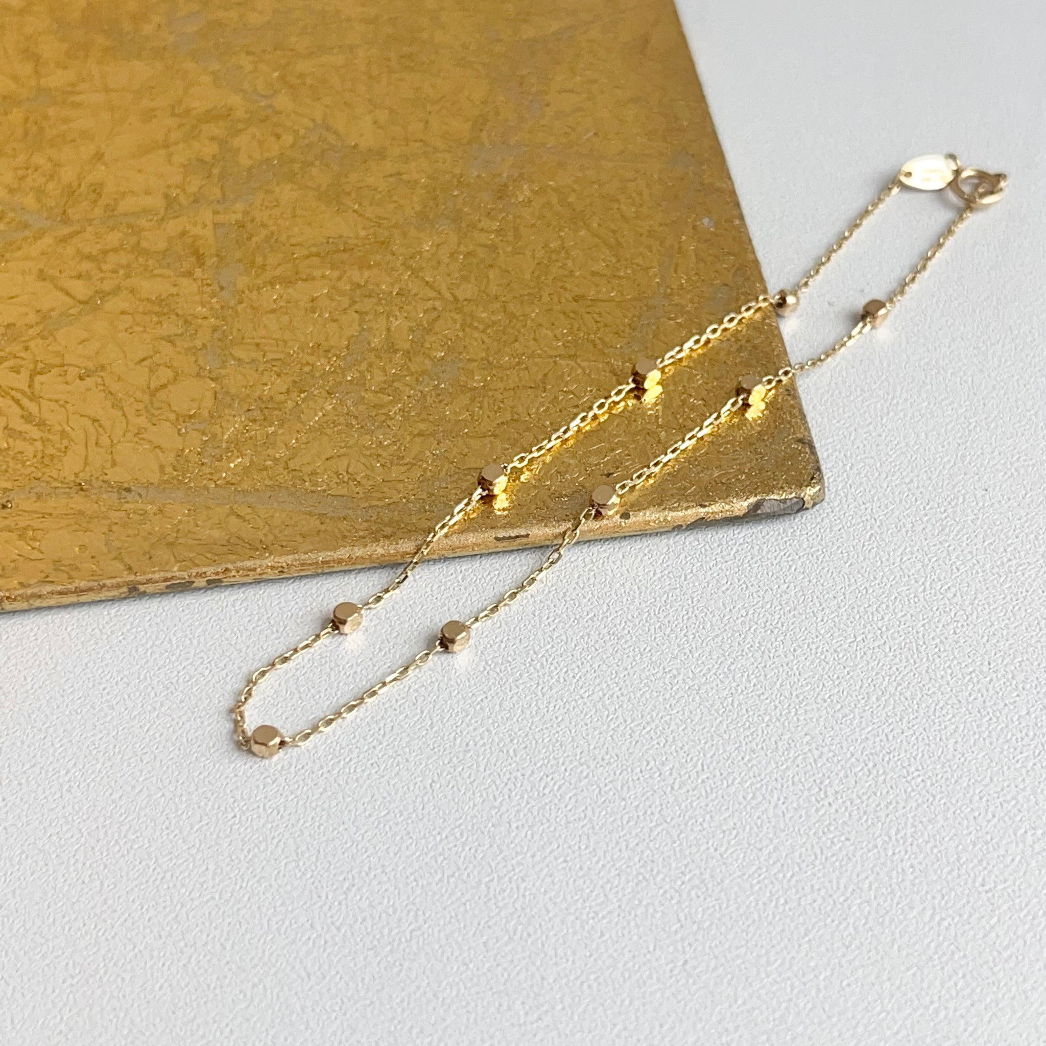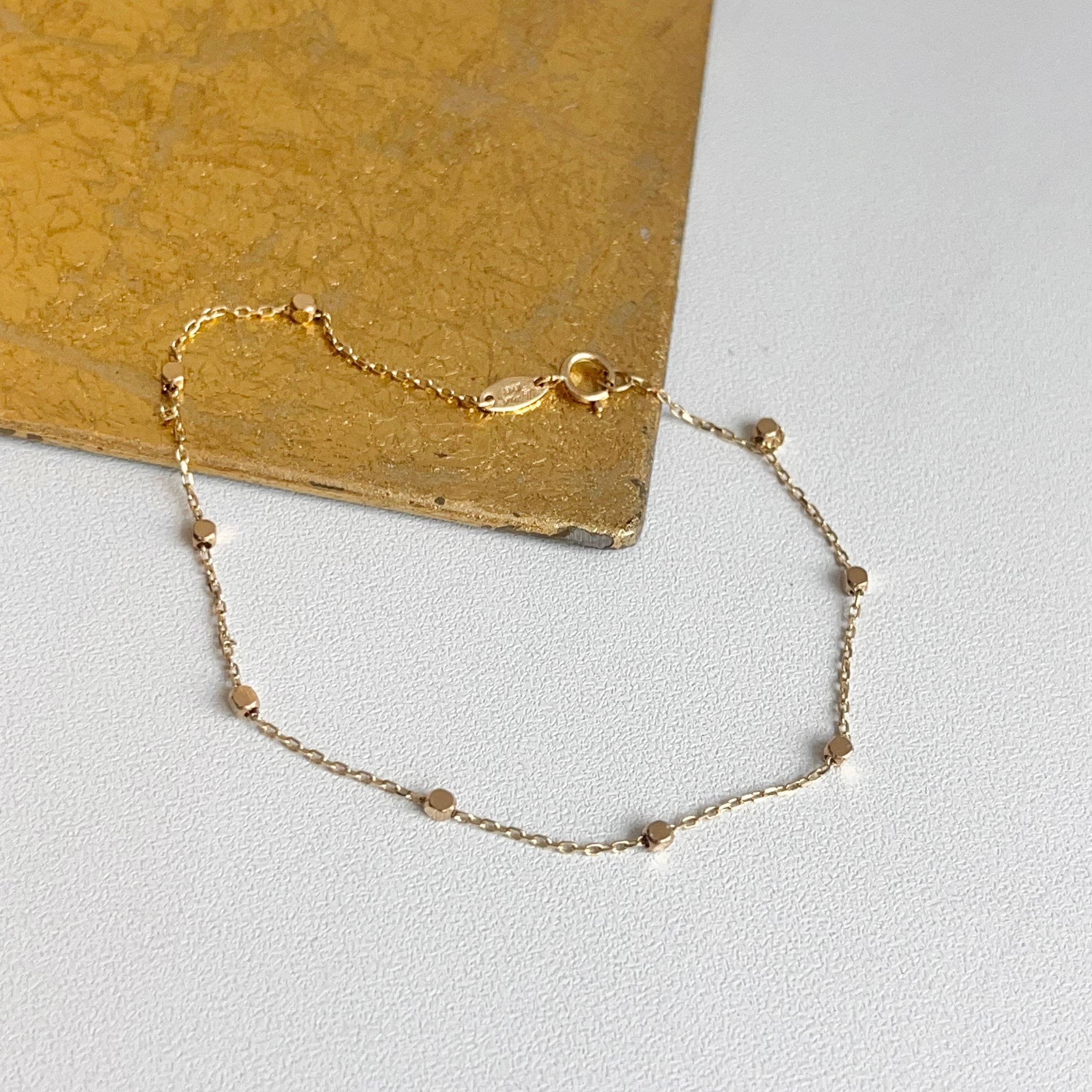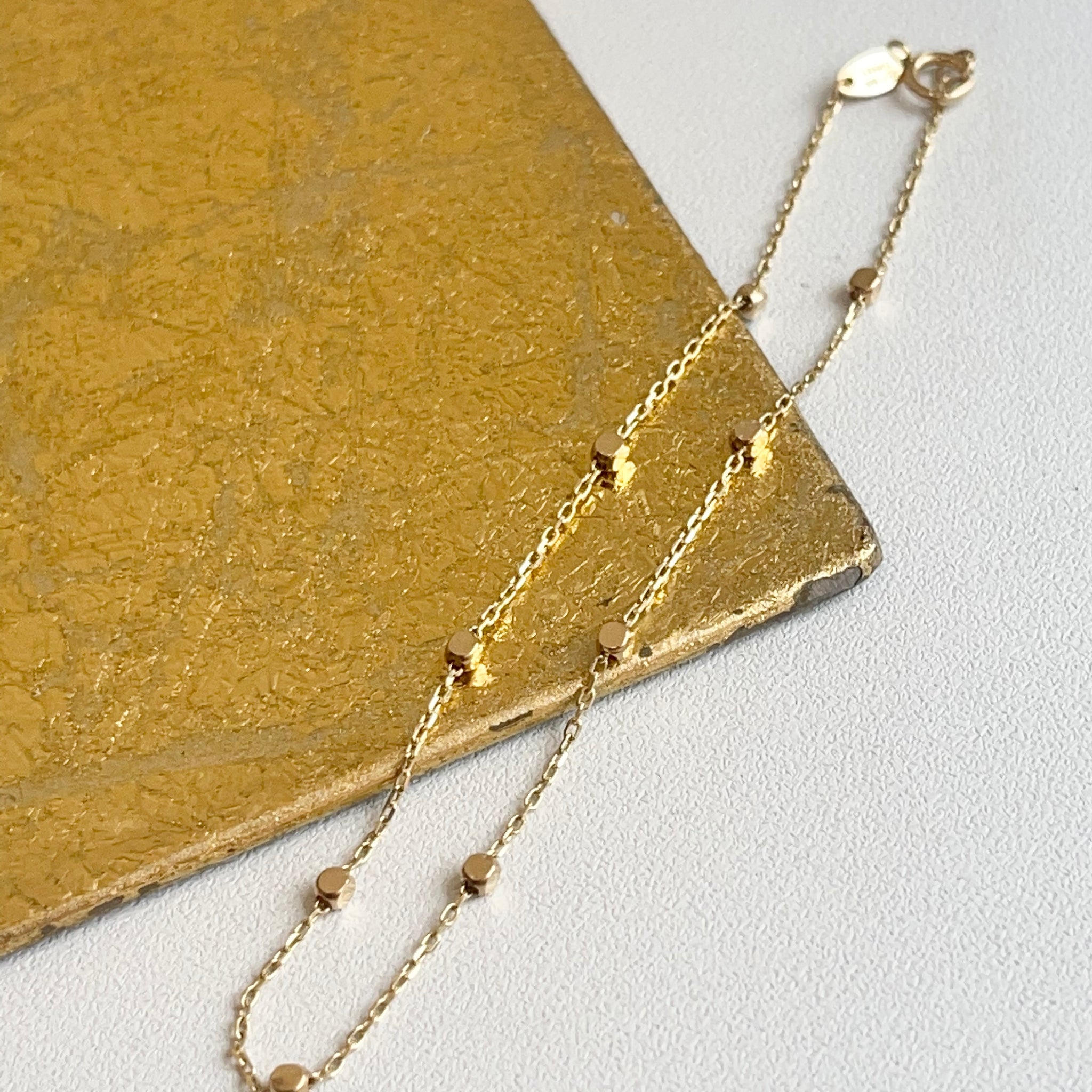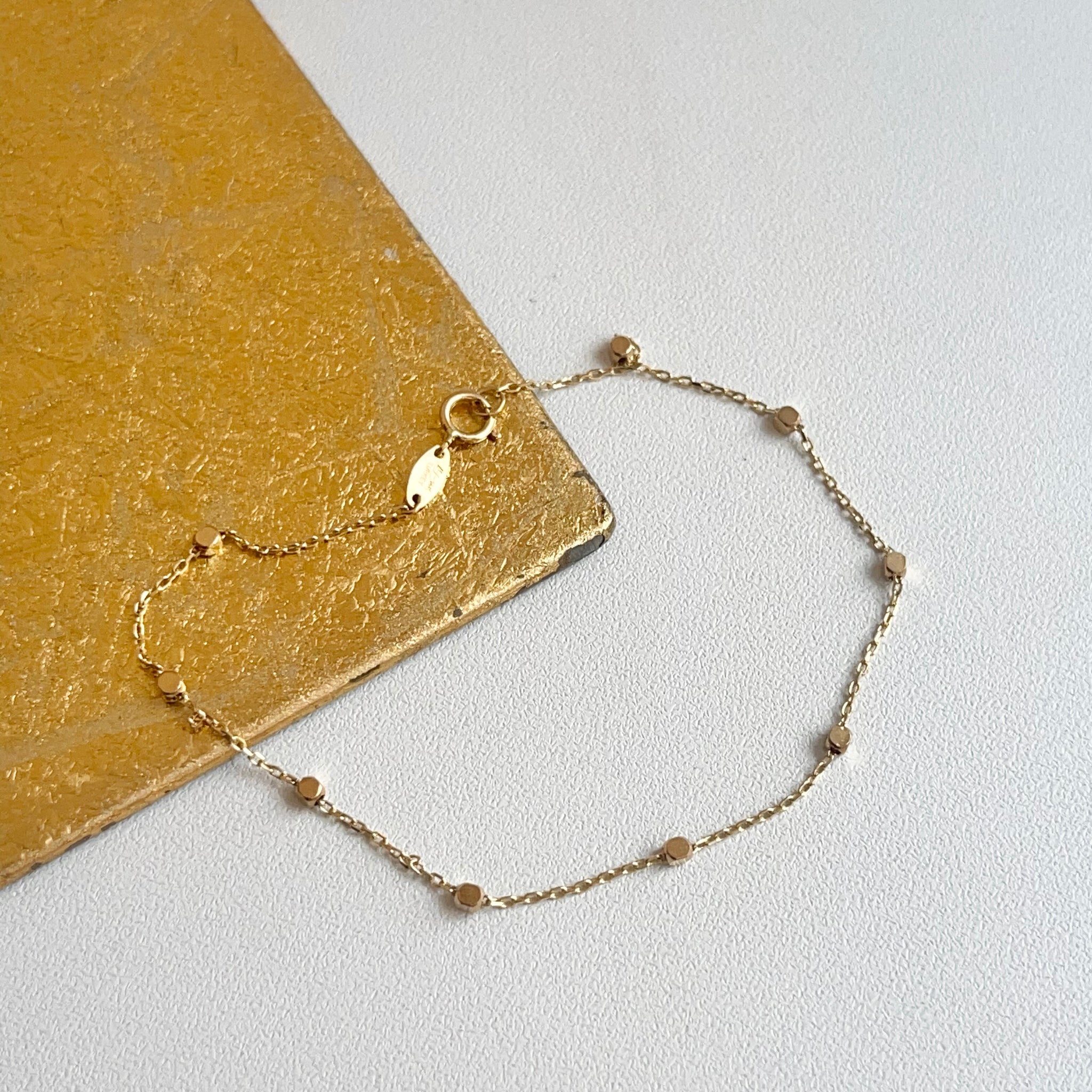 14KT yellow gold square/cube station chain link bracelet. A thin + minimal style bracelet perfect for layering.