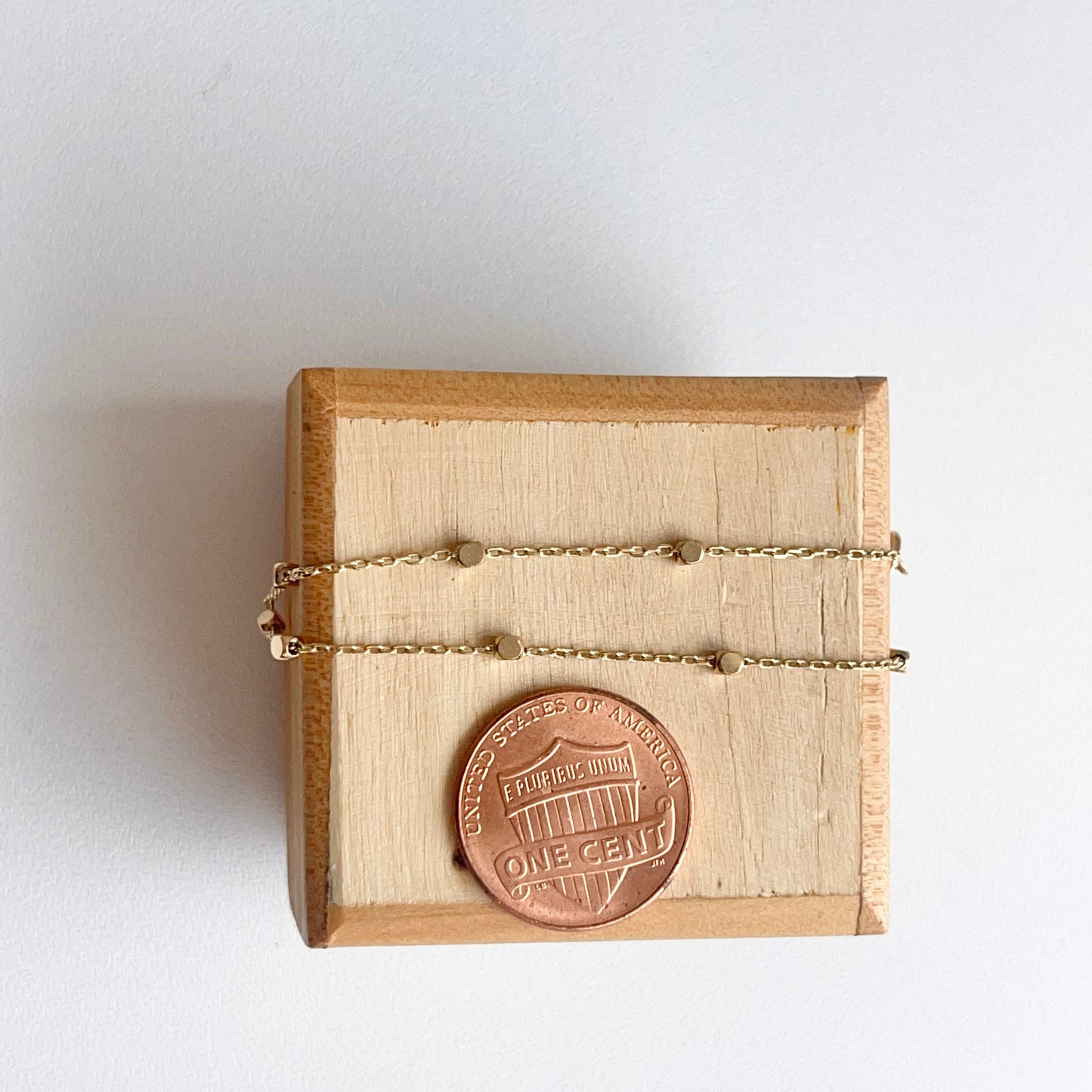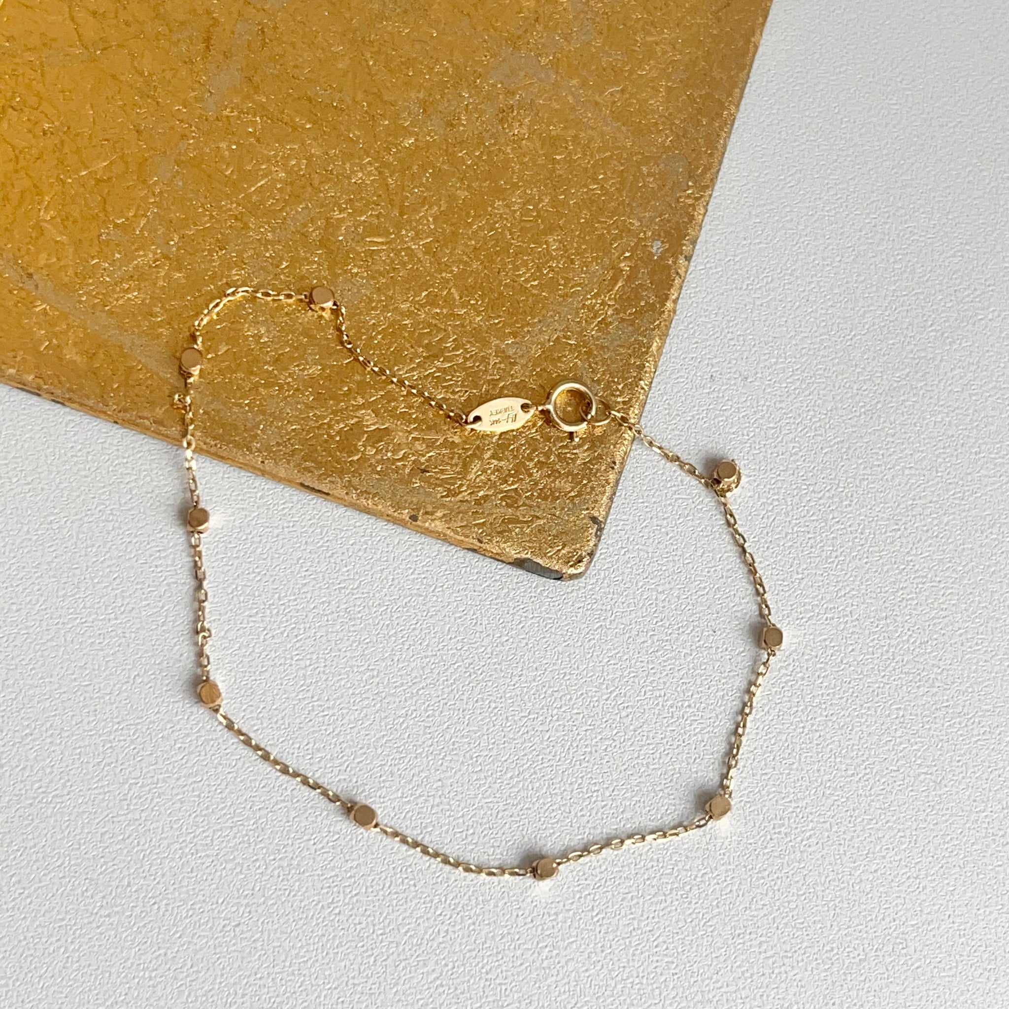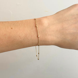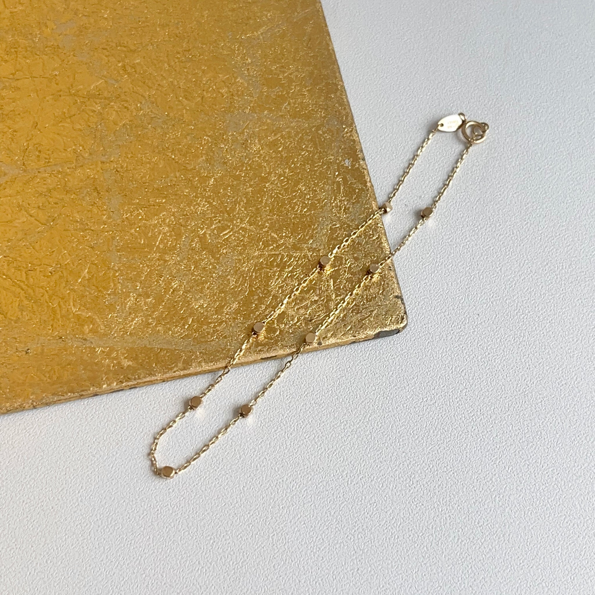 14KT yellow gold square/cube station chain link bracelet. A thin + minimal style bracelet perfect for layering.