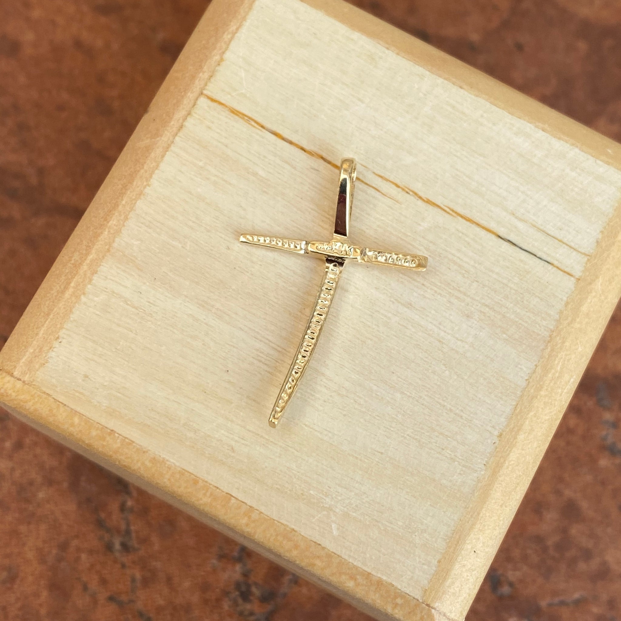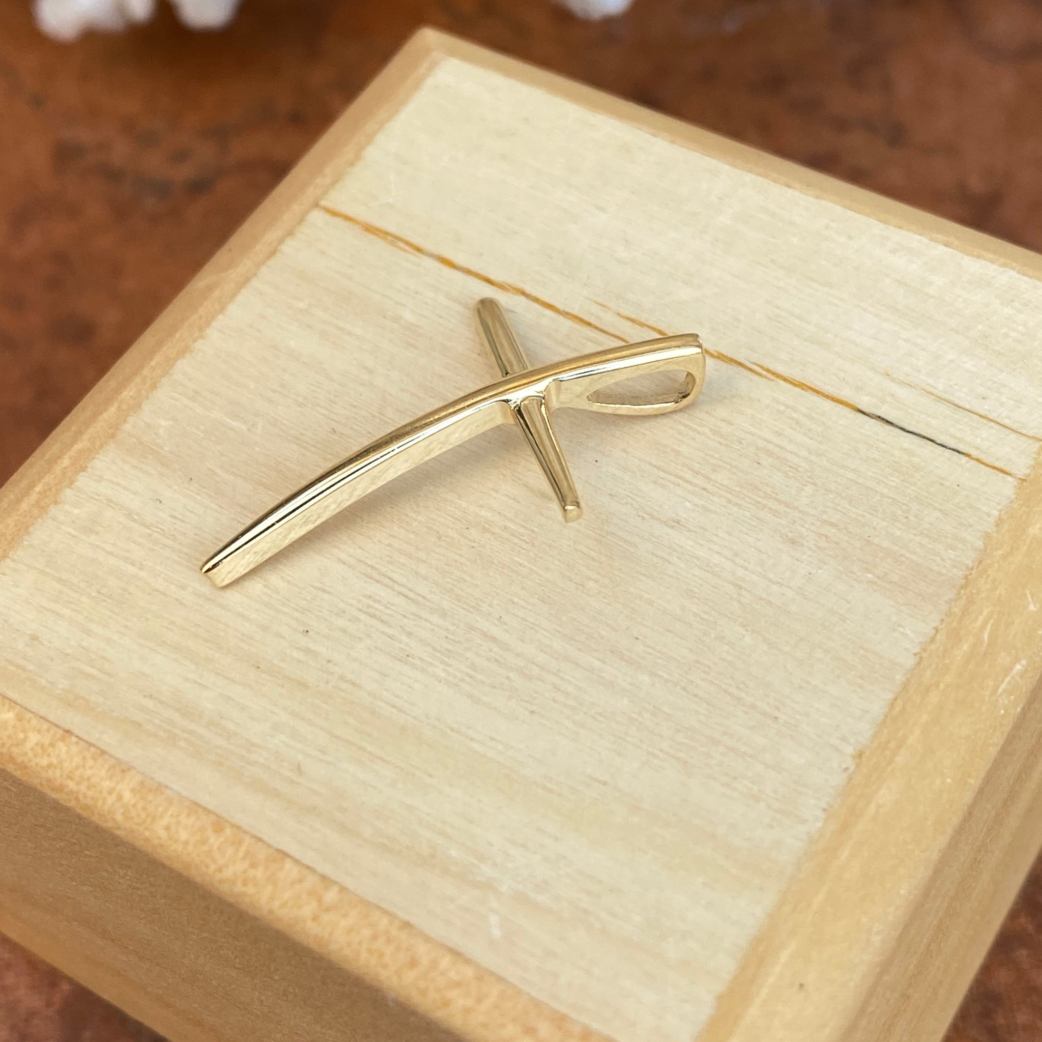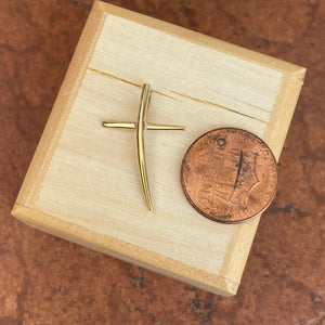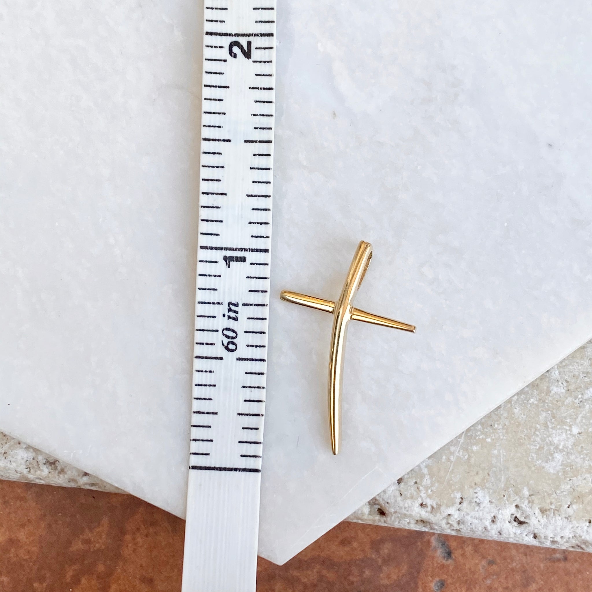 14KT yellow gold curved, artsy cross pendant slide. With its hidden bail and good size, this contemporary cross would look great on a neck wire or cord necklace.