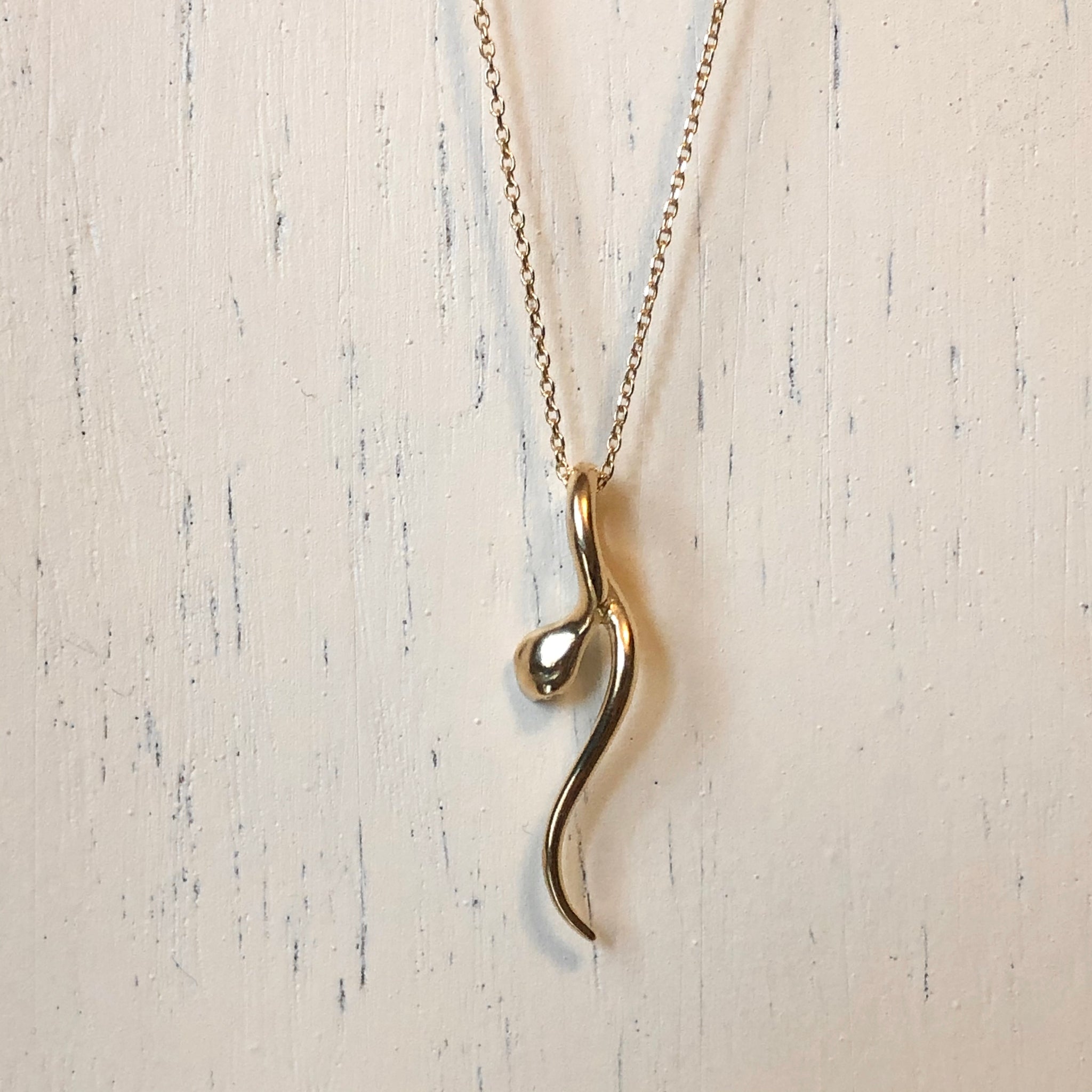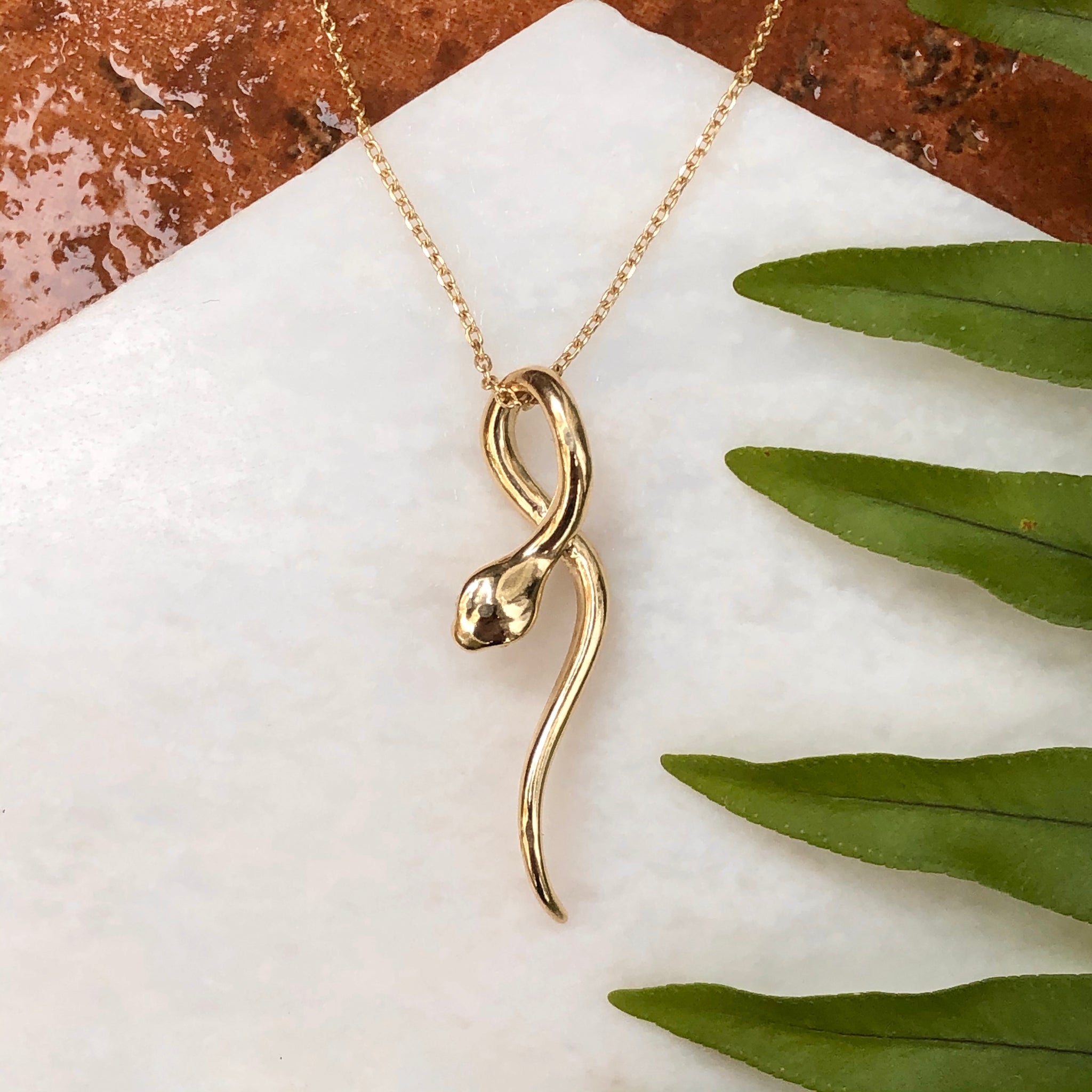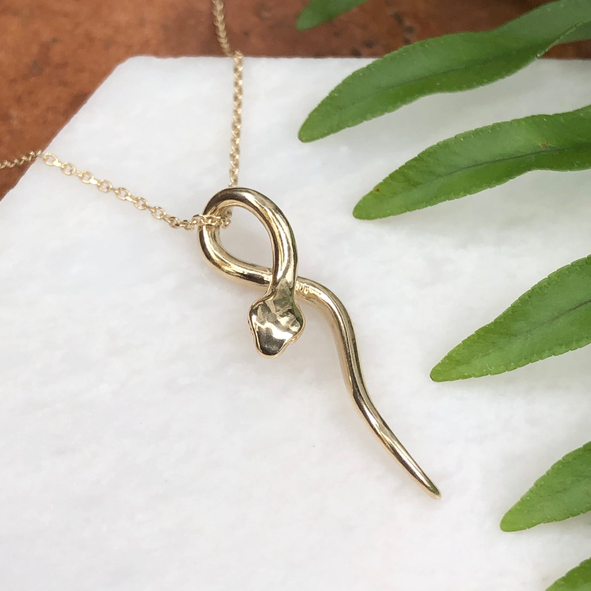 Polished 14KT yellow gold curved 3-D serpent snake pendant slide. Pair it with one of our yellow gold, thin chain necklace!