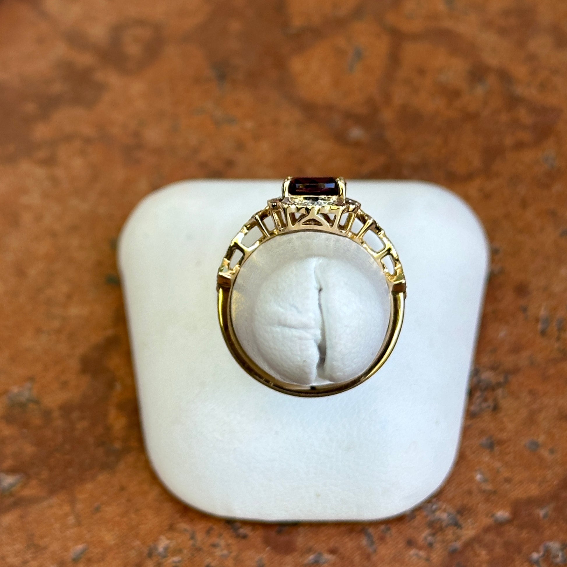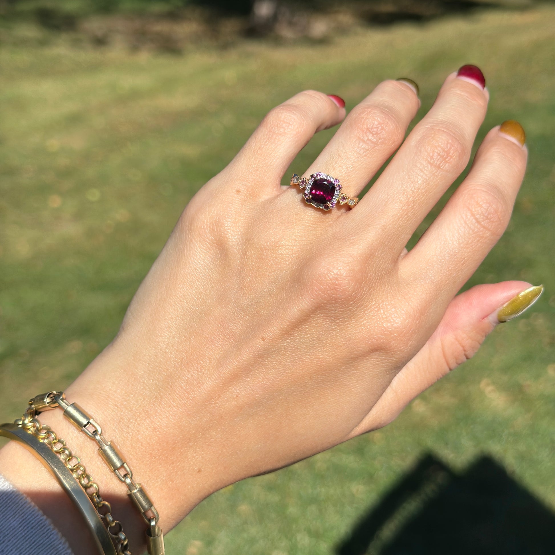 14KT Yellow Gold Cushion Rhodolite Garnet + Round Diamond Miligrain Ring